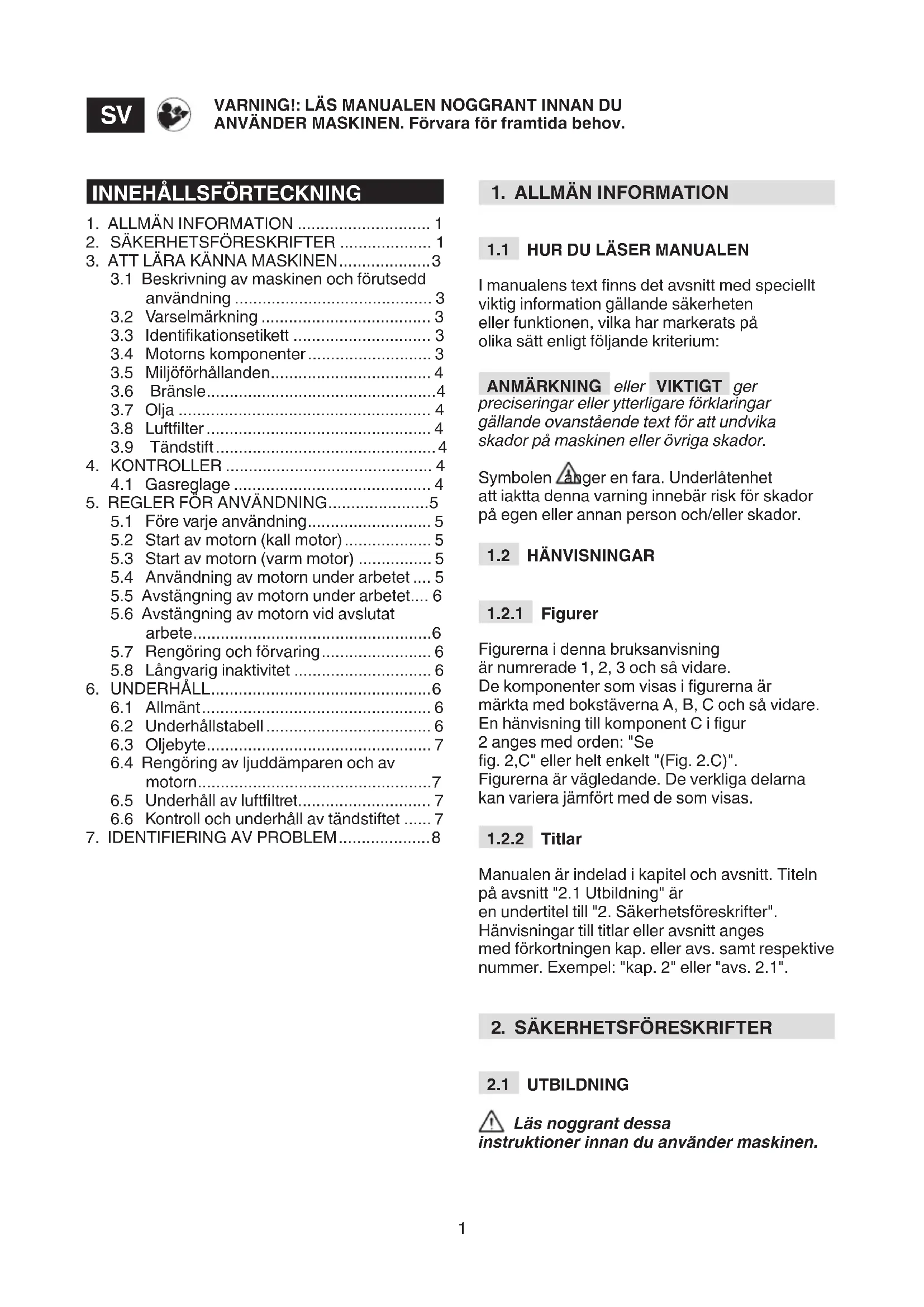 Manualen är indelad i kapitel och avsnitt. Titeln på avsnitt "2.1 Utbildning" är en undertitel till "2. Säkerhetsföreskrifter". Hänvisningar till titlar eller avsnitt anges med förkortningen kap. eller avs. samt respektive nummer. Exempel: "kap. 2" eller "avs. 2.1".