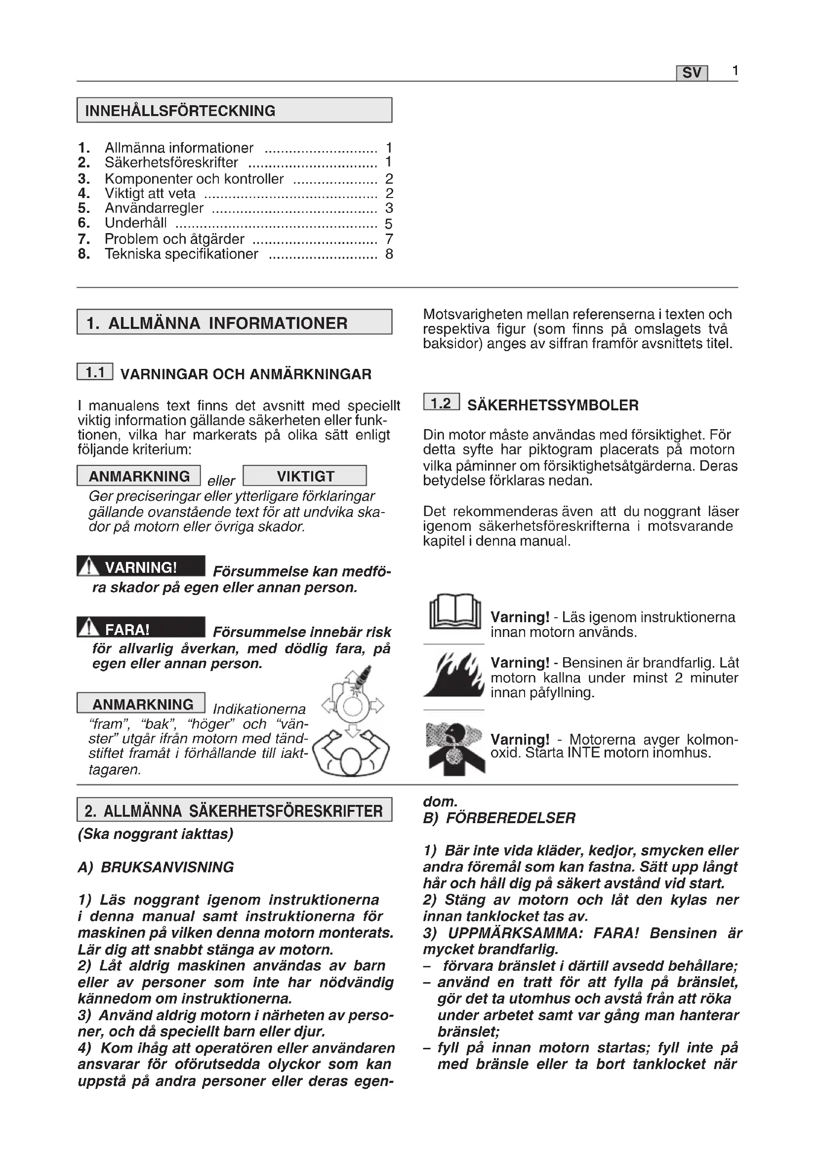 I manualens text finns det avsnitt med speciellt viktig information gällande säkerheten eller funk- tionen, vilka har markerats på olika sätt enligt följande kriterium: ANMARKNING eller VIKTIGT Gerpreciseringarellerytterligareförklaringar gällande ovanstående text för att undvika ska- dor på motorn eller övriga skador. VARNING! Försummelse kan medfö- ra skador på egen eller annan person. FARA! Försummelse innebär risk för allvarlig åverkan, med dödlig fara, på egen eller annan person. ANMARKNING Indikationerna “fram”, “bak”, “höger” och “vän- ster” utgår ifrån motorn med tänd- stiftet framåt i förhållande till iakt- tagaren.