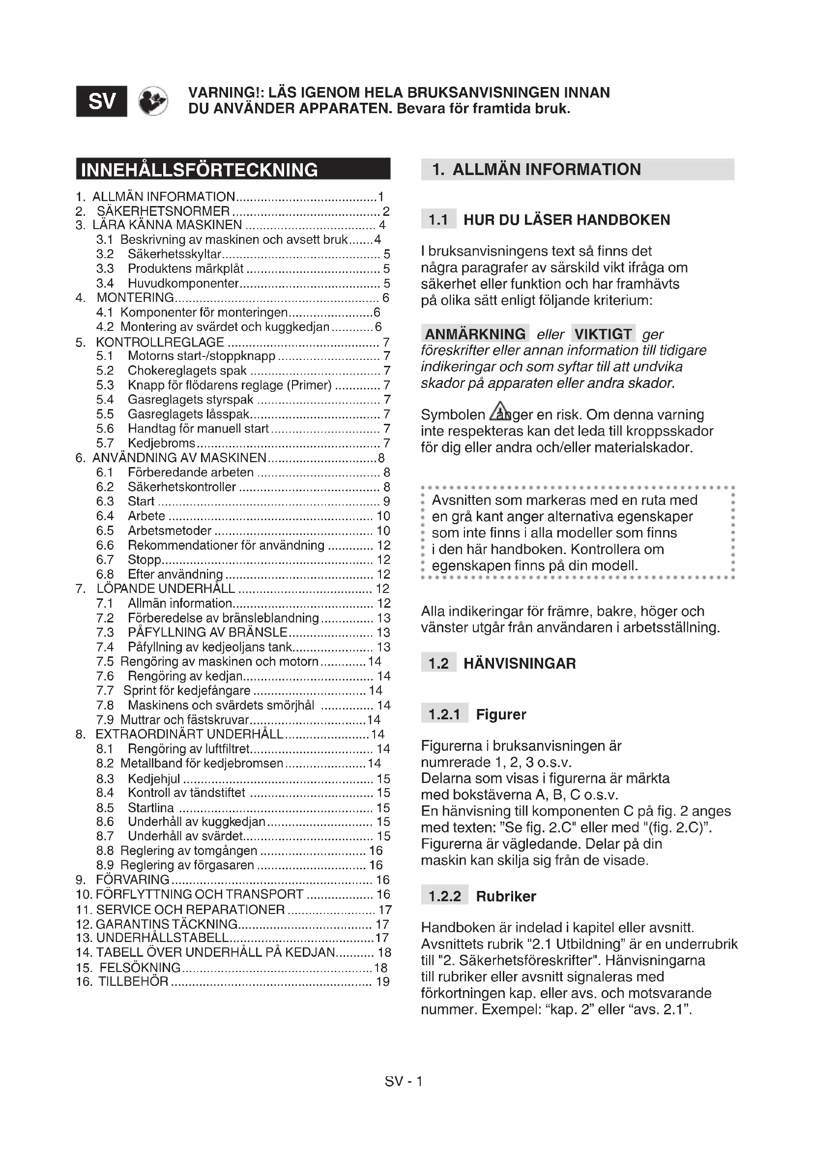 Handboken är indelad i kapitel eller avsnitt. Avsnittets rubrik "2.1 Utbildning” är en underrubrik till "2. Säkerhetsföreskrifter". Hänvisningarna till rubriker eller avsnitt signaleras med förkortningen kap. eller avs. och motsvarande nummer. Exempel: “kap. 2” eller “avs. 2.1”. VARNING!: LÄS IGENOM HELA BRUKSANVISNINGEN INNAN DU ANVÄNDER APPARATEN. Bevara för framtida bruk.