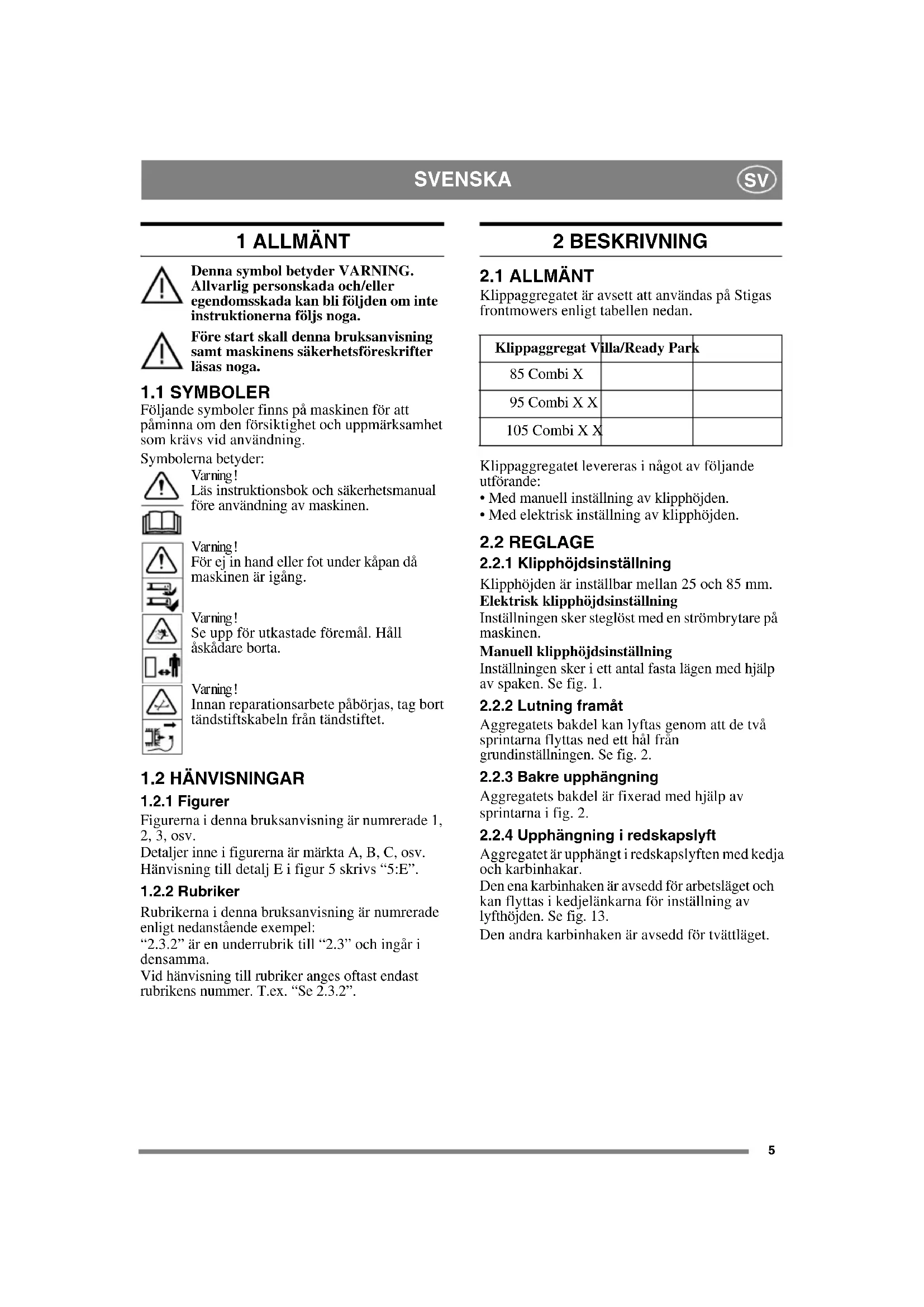 BRUKSANVISNING VILLA 95 COMBI STIGA