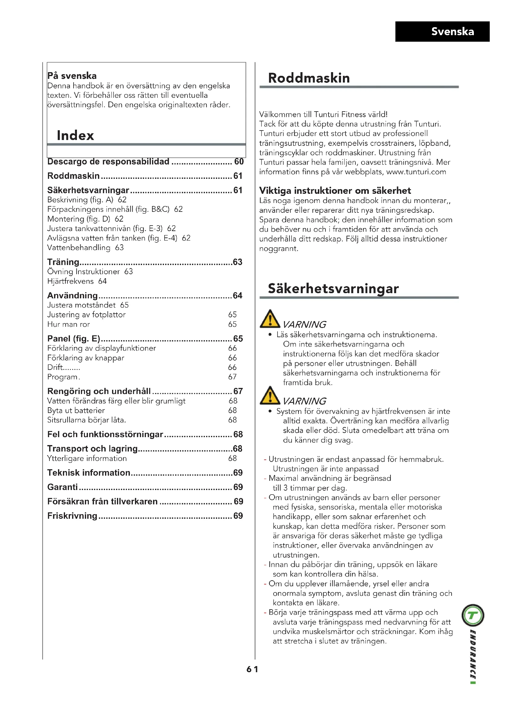 - System för övervakning av hjärtfrekvensen är inte alltid exakta. Överträning kan medföra allvarlig skada eller död. Sluta omedelbart att träna om du känner dig svag. - Utrustningen är endast anpassad för hemmabruk. Utrustningen är inte anpassad - Maximal användning är begränsad till 3 timmar per dag. - Om utrustningen används av barn eller personer med fysiska, sensoriska, mentala eller motoriska handikapp, eller som saknar erfarenhet och kunskap, kan detta medföra risker. Personer som är ansvariga för deras säkerhet måste ge tydliga instruktioner, eller övervaka användningen av utrustningen. - Innan du påbörjar din träning, uppsök en läkare som kan kontrollera din hälsa. - Om du upplever illamående, yrsel eller andra onormala symptom, avsluta genast din träning och kontakta en läkare. - Börja varje träningspass med att värma upp och avsluta varje träningspass med nedvarvning för att undvika muskelsmärtor och sträckningar. Kom ihåg att stretcha i slutet av träningen. Descargo de responsabilidad ......................... 60 Roddmaskin ...................................................... 61 Säkerhetsvarningar .......................................... 61 Beskrivning (g. A) 62Förpackningens innehåll (g. B&C) 62Montering (g. D) 62Justera tankvattennivån (g. E-3) 62Avlägsna vatten från tanken (g. E-4) 62Vattenbehandling 63 Träning ...............................................................63 Övning Instruktioner 63Hjärtfrekvens 64 Användning ....................................................... 64 Justera motståndet 65Justering av fotplattor 65Hur man ror 65 Panel (g. E) ...................................................... 65 Förklaring av displayfunktioner 66Förklaring av knappar 66Drift ........ 66 Program . 67 Rengöring och underhåll ................................. 67 Vatten förändras färg eller blir grumligt 68Byta ut batterier 68Sitsrullarna börjar låta. 68 Fel och funktionsstörningar ............................ 68 Transport och lagring .......................................68 Ytterligare information 68 Teknisk information .......................................... 69 Garanti ............................................................... 69 Försäkran från tillverkaren .............................. 69 Friskrivning ....................................................... 69 På svenska Denna handbok är en översättning av den engelska texten. Vi förbehåller oss rätten till eventuella översättningsfel. Den engelska originaltexten råder. Index62 Svenska - Utrustningen är endast anpassad för användning inomhus. Utrustningen är inte anpassad för användning utomhus. - Använd endast utrustningen i miljöer med god ventilation. Använd inte utrustningen i dragiga miljöer för att undvika att bli förkyld. - Använd endast utrustningen i miljöer med temperatur mellan 10 °C och 35 °C. Förvara endast utrustningen i miljöer med temperatur mellan 5 °C och 45 °C. - Använd inte och förvara inte utrustningen i fuktig miljö. Luftfuktigheten får aldrig överstiga 80%. - Använd endast utrustningen för dess avsedda ändamål. Använd inte utrustningen för andra ändamål än de som beskrivs i handboken. - Använd inte den här utrustningen om någon del är trasig eller skadad. Om någon del är trasig eller skadad, kontakta din återförsäljare. - Håll undan händer, fötter och andra kroppsdelar från de rörliga delarna. - Håll undan håret från de rörliga delarna. - Bär passande kläder och skor. - Håll undan kläder, smycken och andra föremål från de rörliga delarna. - Låt bara en person åt gången använda utrustningen. Utrustningen får inte användas av personer som väger mer än 135 kg (300 lbs). - Öppna inte utrustningen utan att kontakta din återförsäljare. Beskrivning (fig. A) Din roddmaskin är en stationär träningsmaskin som används för att simulera rodd utan att orsaka kraftigt tryck på lederna. Förpackningens innehåll (fig. B&C) - Förpackningen innehåller delarna som visas i fig. B. - Förpackningen innehåller de fästdon som visas i fig. C. Se avsnittet “Beskrivning”. ANMÄRKNING