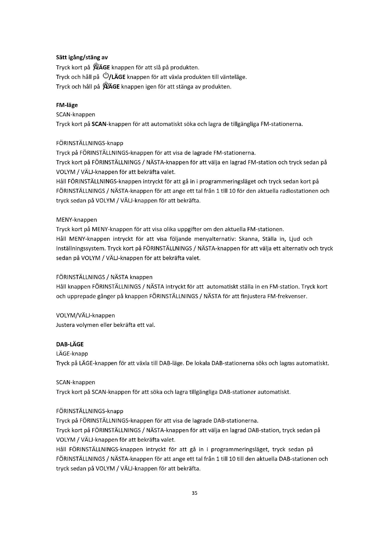 Sätt igång/stäng av Tryck kort på /LÄGE knappen för att slå på produkten. Tryck och håll på /LÄGE knappen för att växla produkten till vänteläge. Tryck och håll på /LÄGE knappen igen för att stänga av produkten. FM-läge SCAN-knappen Tryck kort på SCAN-knappen för att automatiskt söka och lagra de tillgängliga FM-stationerna. FÖRINSTÄLLNINGS-knapp Tryck på FÖRINSTÄLLNINGS-knappen för att visa de lagrade FM-stationerna. Tryck kort på FÖRINSTÄLLNINGS / NÄSTA-knappen för att välja en lagrad FM-station och tryck sedan på VOLYM / VÄLJ-knappen för att bekräfta valet. Håll FÖRINSTÄLLNINGS-knappen intryckt för att gå in i programmeringsläget och tryck sedan kort på FÖRINSTÄLLNINGS / NÄSTA-knappen för att ange ett tal från 1 till 10 för den aktuella radiostationen och tryck sedan på VOLYM / VÄLJ-knappen för att bekräfta. MENY-knappen Tryck kort på MENY-knappen för att visa olika uppgifter om den aktuella FM-stationen. Håll MENY-knappen intryckt för att visa följande menyalternativ: Skanna, Ställa in, Ljud och Inställningssystem. Tryck kort på FÖRINSTÄLLNINGS / NÄSTA-knappen för att välja ett alternativ och tryck sedan på VOLYM / VÄLJ-knappen för att bekräfta valet. FÖRINSTÄLLNINGS / NÄSTA knappen Håll knappen FÖRINSTÄLLNINGS / NÄSTA intryckt för att automatiskt ställa in en FM-station. Tryck kort och upprepade gånger på knappen FÖRINSTÄLLNINGS / NÄSTA för att finjustera FM-frekvenser. VOLYM/VÄLJ-knappen Justera volymen eller bekräfta ett val. DAB-LÄGE LÄGE-knapp Tryck på LÄGE-knappen för att växla till DAB-läge. De lokala DAB-stationerna söks och lagras automatiskt. SCAN-knappen Tryck kort på SCAN-knappen för att söka och lagra tillgängliga DAB-stationer automatiskt. FÖRINSTÄLLNINGS-knapp Tryck på FÖRINSTÄLLNINGS-knappen för att visa de lagrade DAB-stationerna. Tryck kort på FÖRINSTÄLLNINGS / NÄSTA-knappen för att välja en lagrad DAB-station, tryck sedan på VOLYM / VÄLJ-knappen för att bekräfta valet. Håll FÖRINSTÄLLNINGS-knappen intryckt för att gå in i programmeringsläget, tryck sedan på FÖRINSTÄLLNINGS / NÄSTA-knappen för att ange ett tal från 1 till 10 till den aktuella DAB-stationen och tryck sedan på VOLYM / VÄLJ-knappen för att bekräfta.36 MENY-knappen Tryck på MENY-knappen för att visa olika uppgifter om den aktuella DAB-stationen. Håll MENY-knappen intryckt för att visa följande menyalternativ: Full skanning, manuell melodi och DRC Prune System. Tryck kort på FÖRINSTÄLLNINGS / NÄSTA-knappen för att välja ett alternativ och tryck sedan på VOLYM / VÄLJ-knappen för att bekräfta valet. NÄSTA-knapp Tryck kort på knappen FÖRINSTÄLLNINGS / NÄSTA för att välja en lagrad DAB-station, tryck sedan på VOLYM / VÄLJ-knappen för att bekräfta valet. VOLYM/VÄLJ-knappen Justera volymen eller bekräfta ett val. Larmläge LARM-knapp Tryck kort på LARM-knappen för att välja larm 1 och tryck igen LARM-knappen för att välja larm 2. Tryck kort på FÖRINSTÄLLNINGS / NÄSTA-knappen för att välja larmalternativ, tryck sedan på VOLYM / VÄLJ-knappen för att bekräfta valet. Snooze-knapp När larmet ringer trycker du på SNOOZE-knappen för att den skall sluta ringa och larmet ringer med ett intervall på 9 minuter. Aux-läge: Tryck på LÄGE-knappen för att växla till AUX-läge och anslut en extern ljudenhet till LINE IN-ingången. MENY-knappen Tryck kort på MENY-knappen för att visa olika uppgifter om AUX-läget. Håll MENY-knappen intryckt för att visa ett alternativ, tryck sedan på VOLYM / VÄLJ-knappen för att bekräfta valet. VOLYM/VÄLJ-knappen Justera volymen. SCAN / FÖRINSTÄLLNING/ FÖRINSTÄLLNINGS / NÄSTA-knapparna är ogiltiga i AUX-läget. Använda hörlurar Du kan ansluta hörlurarna med en 3,5 mm-kontakt (ingår ej) till hörlursuttaget på den här produkten. SPECIFIKATIONER Strömförsörjning Utgång DC6V 1000mA Ingång: AC 100-240V 50/60Hz Batterityp 4 x AA-batterier (medföljer inte) DAB 174 MHz till 240 MHz