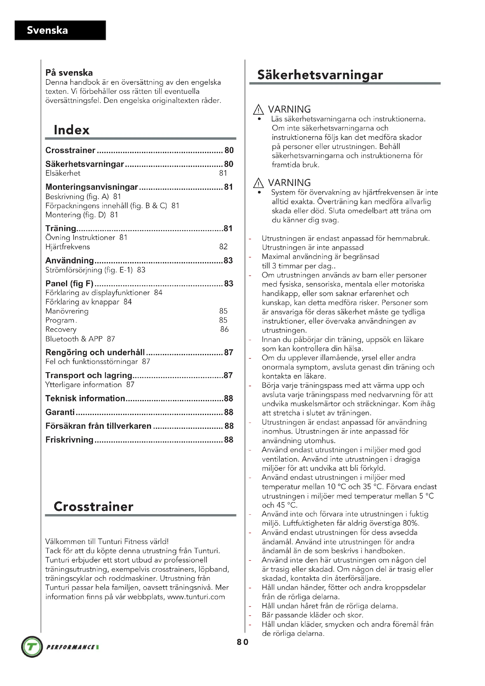 - Garanti Tunturis ágargarantitunt Garantivillkor Konsumenten har rätt att tillämpa de nationellt lagstadgade rättigheterna gällande konsumentvaror och denna garanti begränsar inte dessa rättigheter. Ägargarantin är giltig endast om Tunturis träningsredskap används i de miljöer som tillåts enligt Tunturi. Vilka miljöer som är tillåtna står i träningsredskapets bruksanvisning. Garantivillkor Garantivillkoren börjar att gälla från inköpsdatumet. Garantivillkoren kan variera mellan olika länder. Kontakta en lokal återförsäljare om garantivillkoren. Garantins omfattning Oavsett omständigheter, ansvarar inte Tunturi New Fitness BV eller Tunturis återförsäljare för uppkomna personskador som påverkar köparen, och som innebär inkomstförlust eller andra ekonomiska följdverkningar. Gegränsninggar i garantin Garantin gäller för arbets- och materialfel, förutsatt att redskapet är i originalmonterat skick. Garantin gäller endast fel som uppstår vid normalt bruk och då den använts enligt Tunturis instruktioner gällande montering, skötsel och användning. Tunturi New Fitness BV och Tunturis återförsäljare ansvarar ej för fel som uppkommer utanför deras kontroll. Garantin gäller endast redskapets ursprungliga ägare och är gällande endast i de länder där det ifnns en godkänd Tunturi New Fitness BV återförsäljare. Garantin gäller ej för redskap eller delar som har ändrats utan Tunturi New Fitness BV:s godkännande. Garantin gäller ej för fel som beror på normalt slitage, felaktig användning, användning i förhållanden som inte är avsett för redskapet, korrosion eller lastnings- och transportskador. Garantin täcker inte ljud som uppstår under användning såvida dessa inte väsentligt hindrar utrustningens användning eller har orsakas av ett fel i utrustningen. Garantin gäller inte för underhållsarbete, som rengöring, smörjning eller normal kontroll av komponenterna och inte heller för monteringsarbete som kunden själv kan göra och som inte kräver att redskapet plockas isär/sätts ihop. Det gäller till exempel byte av mätare, trampor eller andra motsvarande enkla delar. Garantireparationer utförda av andra än en godkänd Tunturi-representant,ersätts inte. Ifall instruktionerna i manualen inte följs upphävs produktens garanti. Försäkran från tillverkaren Tunturi New Fitness BV försäkrar att produkten uppfyller följande standarder och direktiv: EN 957 (HB), 89/336/EEG. Produkten är därför CE- märkt. 01-2017 Tunturi New Fitness BV Purmerweg 1 1311 XE Almere Nederländerna Friskrivning © 2017 Tunturi New Fitness BV Alla rättigheter förbehållna. Produkten och handboken kan komma att ändras. Specifikationer kan ändras utan förvarning.89 Finsk Suomeksi Tämä suomennettu käyttöohje on käännetty Englannin kielestä. Pidätämme oikeudet mahdollisiin käännösvirheisiin. Käännös tehty virallisen, englanninkielisen version pohjalta. Sisältö Crosstrainer Tervetuloa Tunturi Fitness -maailmaan!Kiitämme sinua tämän Tunturi-laitteen ostosta. Tunturi tarjoaa laajan valikoiman ammattimaisia kuntoilulaitteita, mukaan lukien crosstrainerit, juoksumatot, kuntopyörät ja soutulaitteet. Tunturi-laite sopii koko perheelle kuntotasosta riippumatta. Katso lisätiedot verkkosivuiltamme www.tunturi.com Crosstrainer p. 89