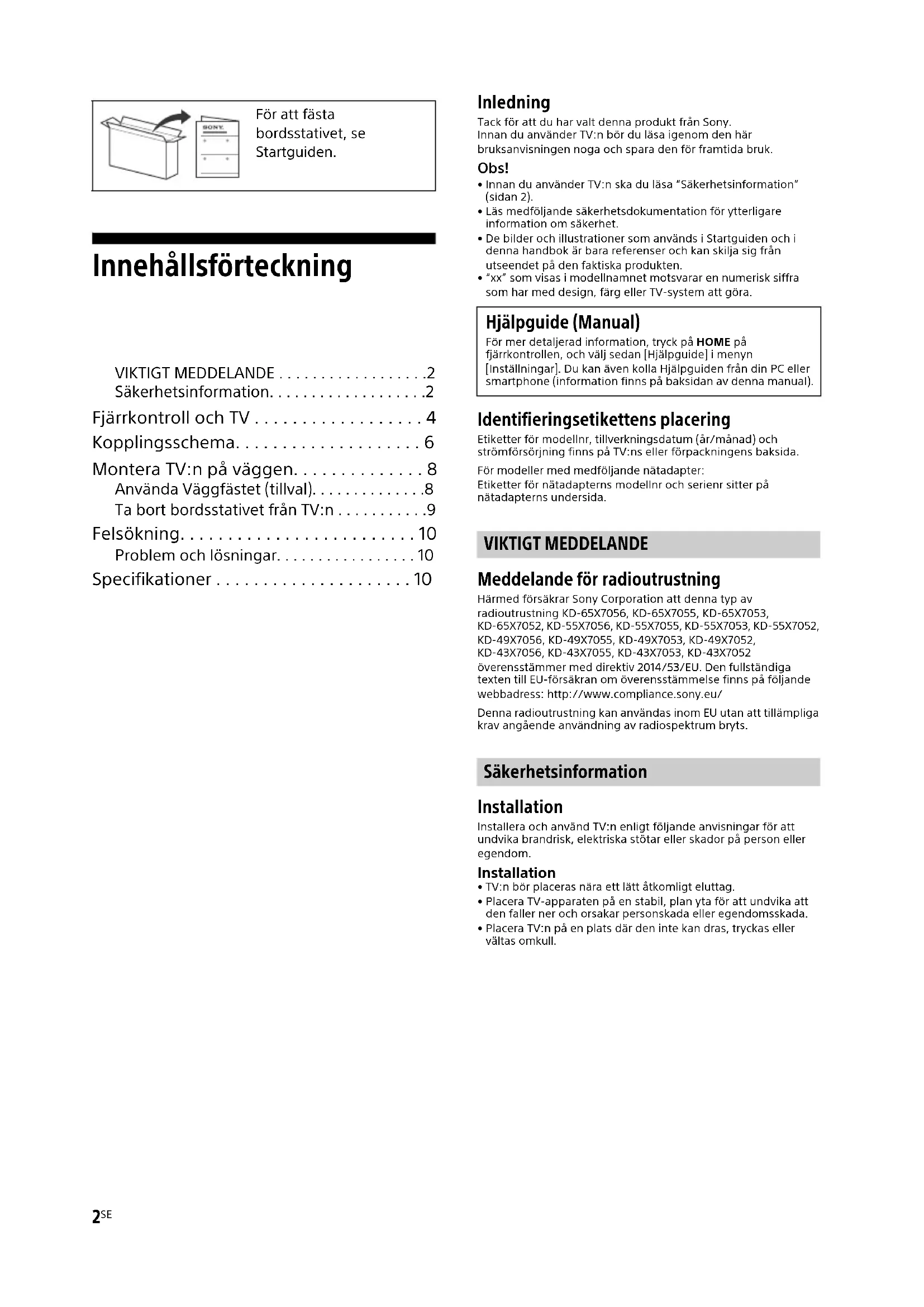 - Innan du använder TV:n ska du läsa “Säkerhetsinformation” (sidan 2).• Läs medföljande säkerhetsdokumentation för ytterligare information om säkerhet.• De bilder och illustrationer som används i Startguiden och i denna handbok är bara referenser och kan skilja sig från utseendet på den faktiska produkten.• “xx” som visas i modellnamnet motsvarar en numerisk siffra som har med design, färg eller TV-system att göra. Identifieringsetikettens placering Etiketter för modellnr, tillverkningsdatum (år/månad) och strömförsörjning finns på TV:ns eller förpackningens baksida.För modeller med medföljande nätadapter:Etiketter för nätadapterns modellnr och serienr sitter på nätadapterns undersida. VIKTIGT MEDDELANDE Meddelande för radioutrustning Härmed försäkrar Sony Corporation att denna typ av radioutrustning KD-65X7056, KD-65X7055, KD-65X7053, KD-65X7052, KD-55X7056, KD-55X7055, KD-55X7053, KD-55X7052, KD-49X7056, KD-49X7055, KD-49X7053, KD-49X7052, KD-43X7056, KD-43X7055, KD-43X7053, KD-43X7052 överensstämmer med direktiv 2014/53/EU. Den fullständiga texten till EU-försäkran om överensstämmelse finns på följande webbadress: http://www.compliance.sony.eu/Denna radioutrustning kan användas inom EU utan att tillämpliga krav angående användning av radiospektrum bryts. Säkerhetsinformation Installation Installera och använd TV:n enligt följande anvisningar för att undvika brandrisk, elektriska stötar eller skador på person eller egendom. Installation