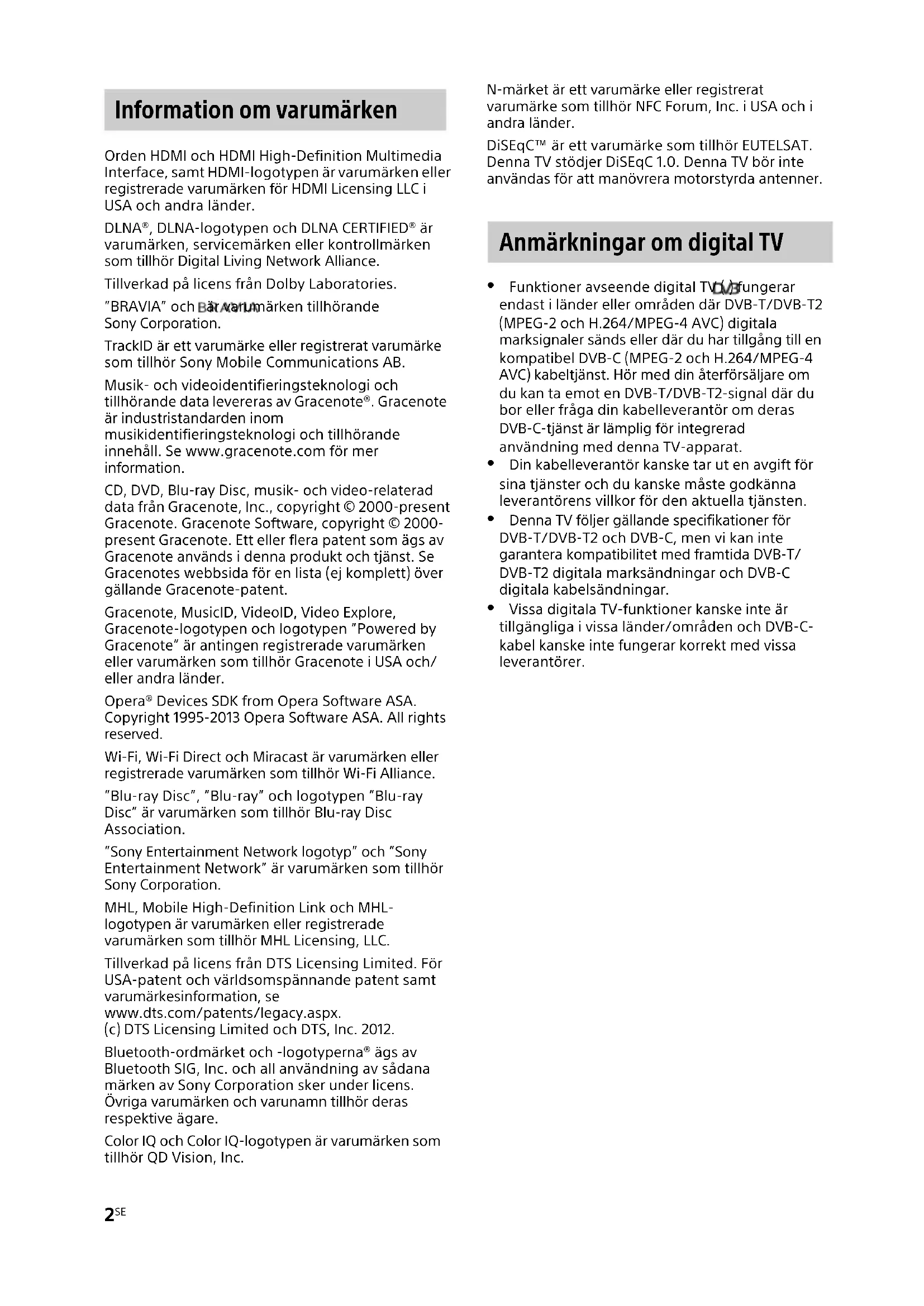 Orden HDMI och HDMI High-Definition Multimedia Interface, samt HDMI-logotypen är varumärken eller registrerade varumärken för HDMI Licensing LLC i USA och andra länder. DLNA®, DLNA-logotypen och DLNA CERTIFIED® är varumärken, servicemärken eller kontrollmärken som tillhör Digital Living Network Alliance. Tillverkad på licens från Dolby Laboratories. ”BRAVIA” och är varumärken tillhörande Sony Corporation. TrackID är ett varumärke eller registrerat varumärke som tillhör Sony Mobile Communications AB. Musik- och videoidentifieringsteknologi och tillhörande data levereras av Gracenote®. Gracenote är industristandarden inom musikidentifieringsteknologi och tillhörande innehåll. Se www.gracenote.com för mer information. CD, DVD, Blu-ray Disc, musik- och video-relaterad data från Gracenote, Inc., copyright © 2000-present Gracenote. Gracenote Software, copyright © 2000- present Gracenote. Ett eller flera patent som ägs av Gracenote används i denna produkt och tjänst. Se Gracenotes webbsida för en lista (ej komplett) över gällande Gracenote-patent. Gracenote, MusicID, VideoID, Video Explore, Gracenote-logotypen och logotypen ”Powered by Gracenote” är antingen registrerade varumärken eller varumärken som tillhör Gracenote i USA och/ eller andra länder. Opera® Devices SDK from Opera Software ASA. Copyright 1995-2013 Opera Software ASA. All rights reserved. Wi-Fi, Wi-Fi Direct och Miracast är varumärken eller registrerade varumärken som tillhör Wi-Fi Alliance. ”Blu-ray Disc”, ”Blu-ray” och logotypen ”Blu-ray Disc” är varumärken som tillhör Blu-ray Disc Association. ”Sony Entertainment Network logotyp” och ”Sony Entertainment Network” är varumärken som tillhör Sony Corporation. MHL, Mobile High-Definition Link och MHL- logotypen är varumärken eller registrerade varumärken som tillhör MHL Licensing, LLC. Tillverkad på licens från DTS Licensing Limited. För USA-patent och världsomspännande patent samt varumärkesinformation, se www.dts.com/patents/legacy.aspx. (c) DTS Licensing Limited och DTS, Inc. 2012. Bluetooth-ordmärket och -logotyperna® ägs av Bluetooth SIG, Inc. och all användning av sådana märken av Sony Corporation sker under licens. Övriga varumärken och varunamn tillhör deras respektive ägare. Color IQ och Color IQ-logotypen är varumärken som tillhör QD Vision, Inc. N-märket är ett varumärke eller registrerat varumärke som tillhör NFC Forum, Inc. i USA och i andra länder. DiSEqC™ är ett varumärke som tillhör EUTELSAT. Denna TV stödjer DiSEqC 1.0. Denna TV bör inte användas för att manövrera motorstyrda antenner. Funktioner avseende digital TV ( ) fungerar endast i länder eller områden där DVB-T/DVB-T2 (MPEG-2 och H.264/MPEG-4 AVC) digitala marksignaler sänds eller där du har tillgång till en kompatibel DVB-C (MPEG-2 och H.264/MPEG-4 AVC) kabeltjänst. Hör med din återförsäljare om du kan ta emot en DVB-T/DVB-T2-signal där du bor eller fråga din kabelleverantör om deras DVB-C-tjänst är lämplig för integrerad användning med denna TV-apparat. Din kabelleverantör kanske tar ut en avgift för sina tjänster och du kanske måste godkänna leverantörens villkor för den aktuella tjänsten. Denna TV följer gällande specifikationer för DVB-T/DVB-T2 och DVB-C, men vi kan inte garantera kompatibilitet med framtida DVB-T/ DVB-T2 digitala marksändningar och DVB-C digitala kabelsändningar. Vissa digitala TV-funktioner kanske inte är tillgängliga i vissa länder/områden och DVB-C- kabel kanske inte fungerar korrekt med vissa leverantörer. Information om varumärken Anmärkningar om digital TV3