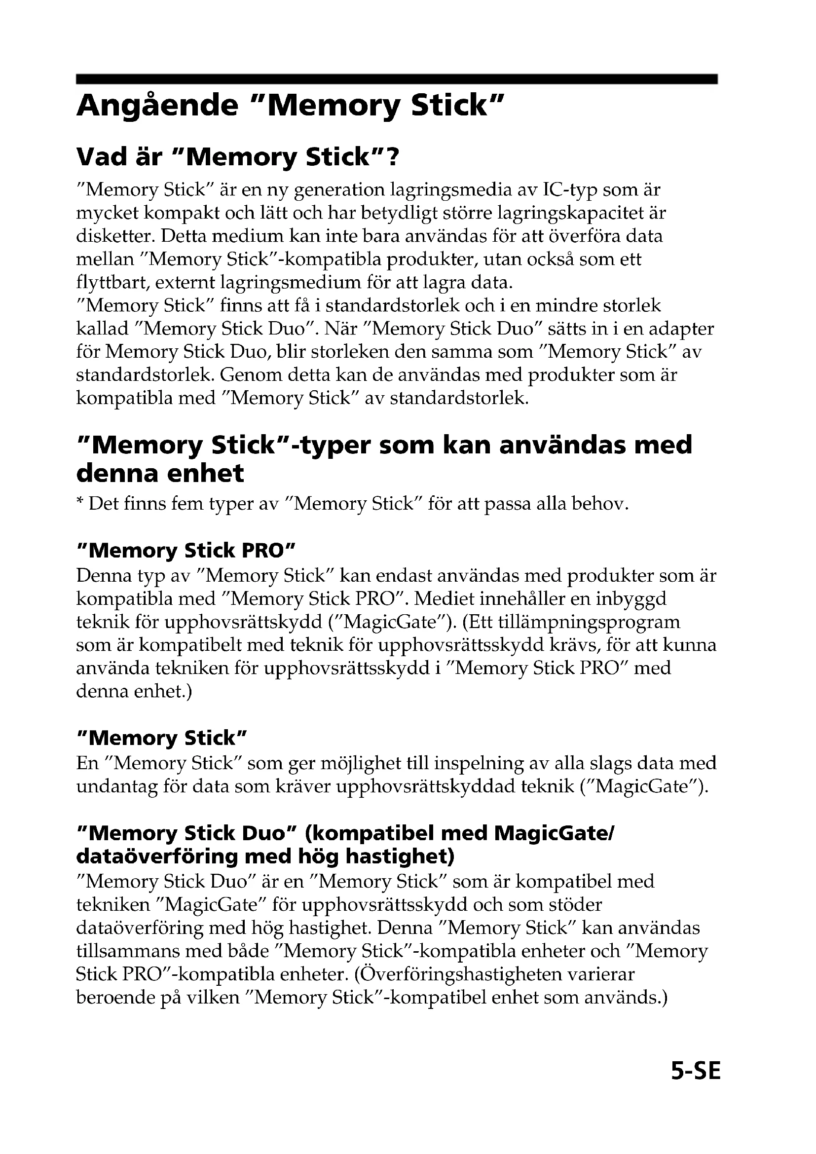 - Det finns fem typer av ”Memory Stick” för att passa alla behov. ”Memory Stick PRO” Denna typ av ”Memory Stick” kan endast användas med produkter som är kompatibla med ”Memory Stick PRO”. Mediet innehåller en inbyggd teknik för upphovsrättskydd (”MagicGate”). (Ett tillämpningsprogram som är kompatibelt med teknik för upphovsrättsskydd krävs, för att kunna använda tekniken för upphovsrättsskydd i ”Memory Stick PRO” med denna enhet.) ”Memory Stick” En ”Memory Stick” som ger möjlighet till inspelning av alla slags data med undantag för data som kräver upphovsrättskyddad teknik (”MagicGate”). ”Memory Stick Duo” (kompatibel med MagicGate/ dataöverföring med hög hastighet) ”Memory Stick Duo” är en ”Memory Stick” som är kompatibel med tekniken ”MagicGate” för upphovsrättsskydd och som stöder dataöverföring med hög hastighet. Denna ”Memory Stick” kan användas tillsammans med både ”Memory Stick”-kompatibla enheter och ”Memory Stick PRO”-kompatibla enheter. (Överföringshastigheten varierar beroende på vilken ”Memory Stick”-kompatibel enhet som används.)6-SE ”Memory Stick” (med funktionen Memory Select) Detta är en ”Memory Stick” som innehåller mer än ett minne (128 MB). Med hjälp av omkopplaren för minnesval på baksidan av denna ”Memory Stick” är det möjligt att välja det minne som är lämpligast för avsedd användning. Det går inte att välja olika minnen samtidigt eller åtföljande efter varandra. ”MagicGate Memory Stick” Det här är en ”Memory Stick” som innehåller en inbyggd teknik för upphovsrättskydd (”MagicGate”). Vad är ”MagicGate”? ”MagicGate” är en teknik för upphovsrättsskydd. Tekniken fungerar när den finns i både ”Memory Stick” och den produkt i vilket mediet används. En autentisering – ”Do you comply with ”MagicGate”?” – äger rum mellan enheter utrustade med ”MagicGate” (denna enhet o.s.v.) och ”Memory Stick”. Datakryptering äger rum efter autentiseringen. Upphovsrättsskyddad data kan bara spelas upp på enheter som är auktoriserade för detta. Musik och annan data som kräver upphovsrättsskydd kan spelas in och spelas upp genom att använda en kombination av em MagicGate- kompatibel ”Memory Stick” och utrustning som är kompatibel med ”MagicGate”, som till exempel denna enhet. Olika typer av data kan spelas in på en enstaka ”Memory Stick”. Det är till exempel möjligt att spela in bilddata på den återstående tomma delen av en MagicGate-kompatibel ”Memory Stick” som innehåller musikdata.7-SE Att använda MagicGate-kompatibel ”Memory Stick” PObs!
