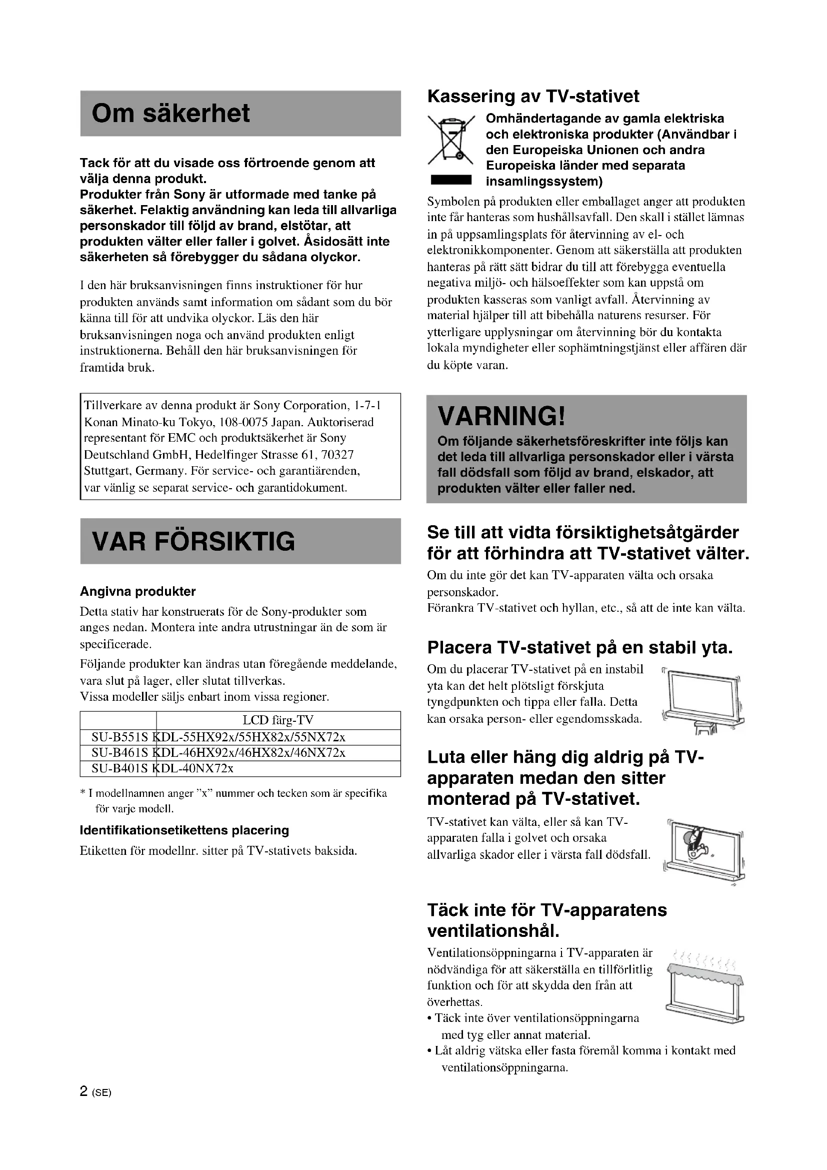 - I modellnamnen anger ”x” nummer och tecken som är specifika för varje modell. Identifikationsetikettens placering Etiketten för modellnr. sitter på TV-stativets baksida. Kassering av TV-stativet Omhändertagande av gamla elektriska och elektroniska produkter (Användbar i den Europeiska Unionen och andra Europeiska länder med separata insamlingssystem) Symbolen på produkten eller emballaget anger att produkten inte får hanteras som hushållsavfall. Den skall i stället lämnas in på uppsamlingsplats för återvinning av el- och elektronikkomponenter. Genom att säkerställa att produkten hanteras på rätt sätt bidrar du till att förebygga eventuella negativa miljö- och hälsoeffekter som kan uppstå om produkten kasseras som vanligt avfall. Återvinning av material hjälper till att bibehålla naturens resurser. För ytterligare upplysningar om återvinning bör du kontakta lokala myndigheter eller sophämtningstjänst eller affären där du köpte varan. Se till att vidta försiktighetsåtgärder för att förhindra att TV-stativet välter. Om du inte gör det kan TV-apparaten välta och orsaka personskador. Förankra TV-stativet och hyllan, etc., så att de inte kan välta. Placera TV-stativet på en stabil yta. Om du placerar TV-stativet på en instabil yta kan det helt plötsligt förskjuta tyngdpunkten och tippa eller falla. Detta kan orsaka person- eller egendomsskada. Luta eller häng dig aldrig på TV- apparaten medan den sitter monterad på TV-stativet. TV-stativet kan välta, eller så kan TV- apparaten falla i golvet och orsaka allvarliga skador eller i värsta fall dödsfall. Täck inte för TV-apparatens ventilationshål. Ventilationsöppningarna i TV-apparaten är nödvändiga för att säkerställa en tillförlitlig funktion och för att skydda den från att överhettas.