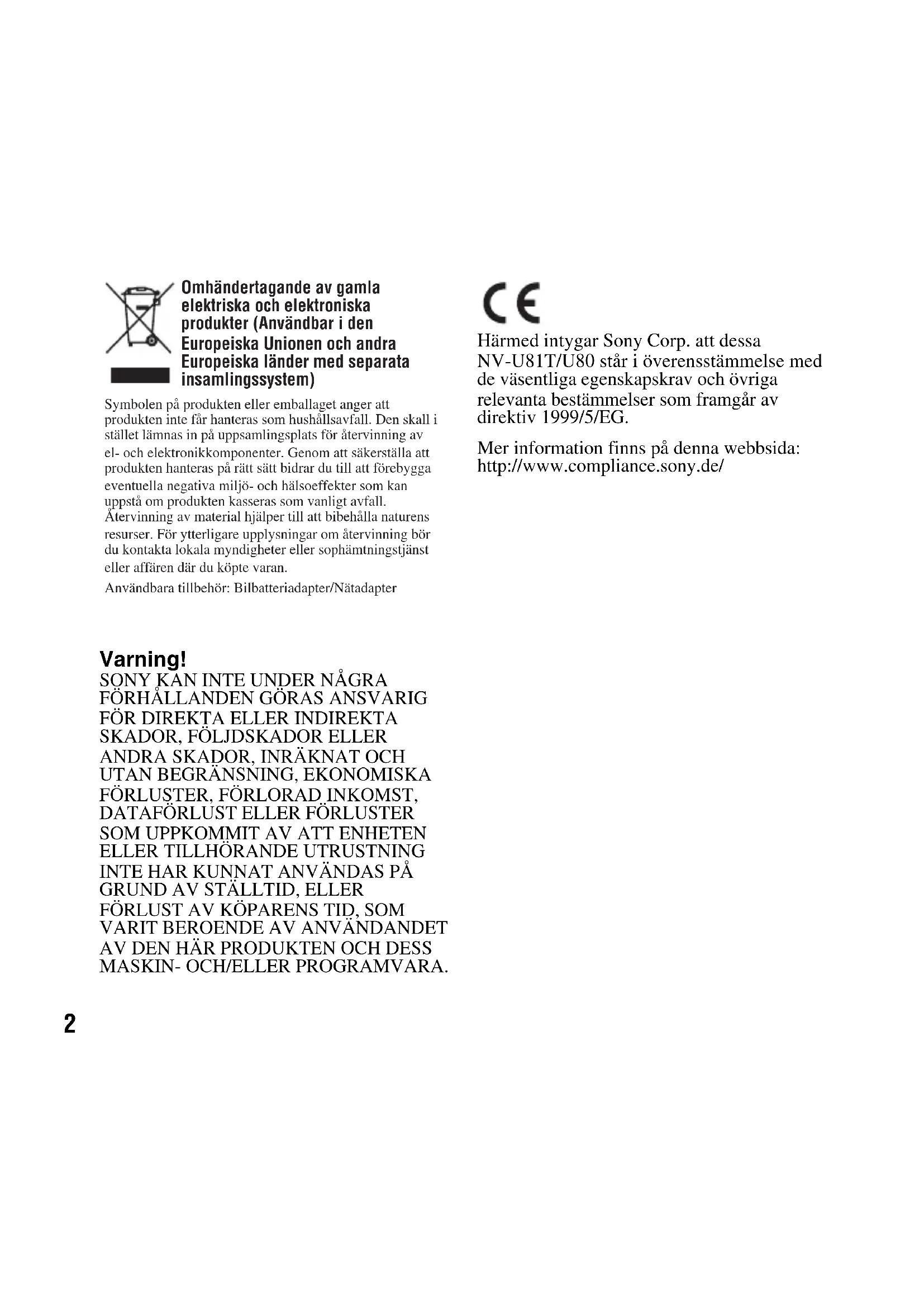 AV DEN HÄR PRODUKTEN OCH DESS MASKIN- OCH/ELLER PROGRAMVARA. Härmed intygar Sony Corp. att dessa NV-U81T/U80 står i överensstämmelse med de väsentliga egenskapskrav och övriga relevanta bestämmelser som framgår av direktiv 1999/5/EG. Mer information finns på denna webbsida: http://www.compliance.sony.de/ Omhändertagande av gamla elektriska och elektroniska produkter (Användbar i den Europeiska Unionen och andra Europeiska länder med separata insamlingssystem) Symbolen på produkten eller emballaget anger att produkten inte får hanteras som hushållsavfall. Den skall i stället lämnas in på uppsamlingsplats för återvinning av el- och elektronikkomponenter. Genom att säkerställa att produkten hanteras på rätt sätt bidrar du till att förebygga eventuella negativa miljö- och hälsoeffekter som kan uppstå om produkten kasseras som vanligt avfall. Återvinning av material hjälper till att bibehålla naturens resurser. För ytterligare upplysningar om återvinning bör du kontakta lokala myndigheter eller sophämtningstjänst eller affären där du köpte varan. Användbara tillbehör: Bilbatteriadapter/NätadapterInnehållsförteckning