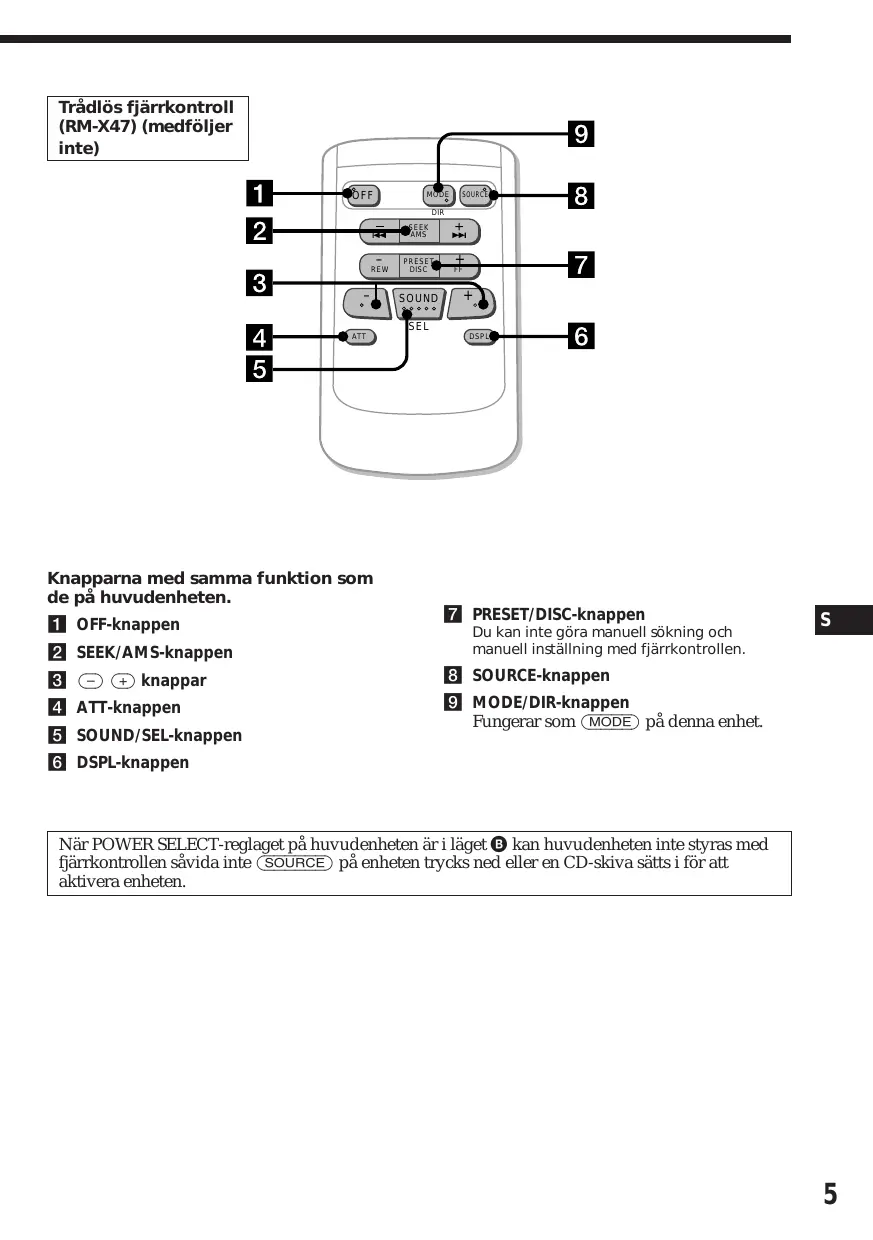 När POWER SELECT-reglaget på huvudenheten är i läget B kan huvudenheten inte styras med fjärrkontrollen såvida inte (SOURCE) på enheten trycks ned eller en CD-skiva sätts i för att aktivera enheten.