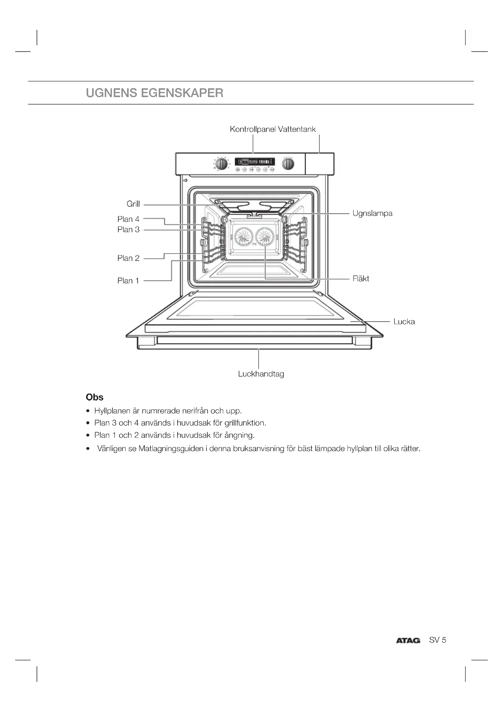 - Vänligen se Matlagningsguiden i denna bruksanvisning för bäst lämpade hyllplan till olika rätter. UGNENS EGENSKAPER Kontrollpanel Vattentank Ugnslampa Fläkt Grill Plan 4 Plan 3 Plan 2 Plan 1 Luckhandtag LuckaSV 6 TILLBEHÖR Följande tillbehör medföljer din kombi ångugn: