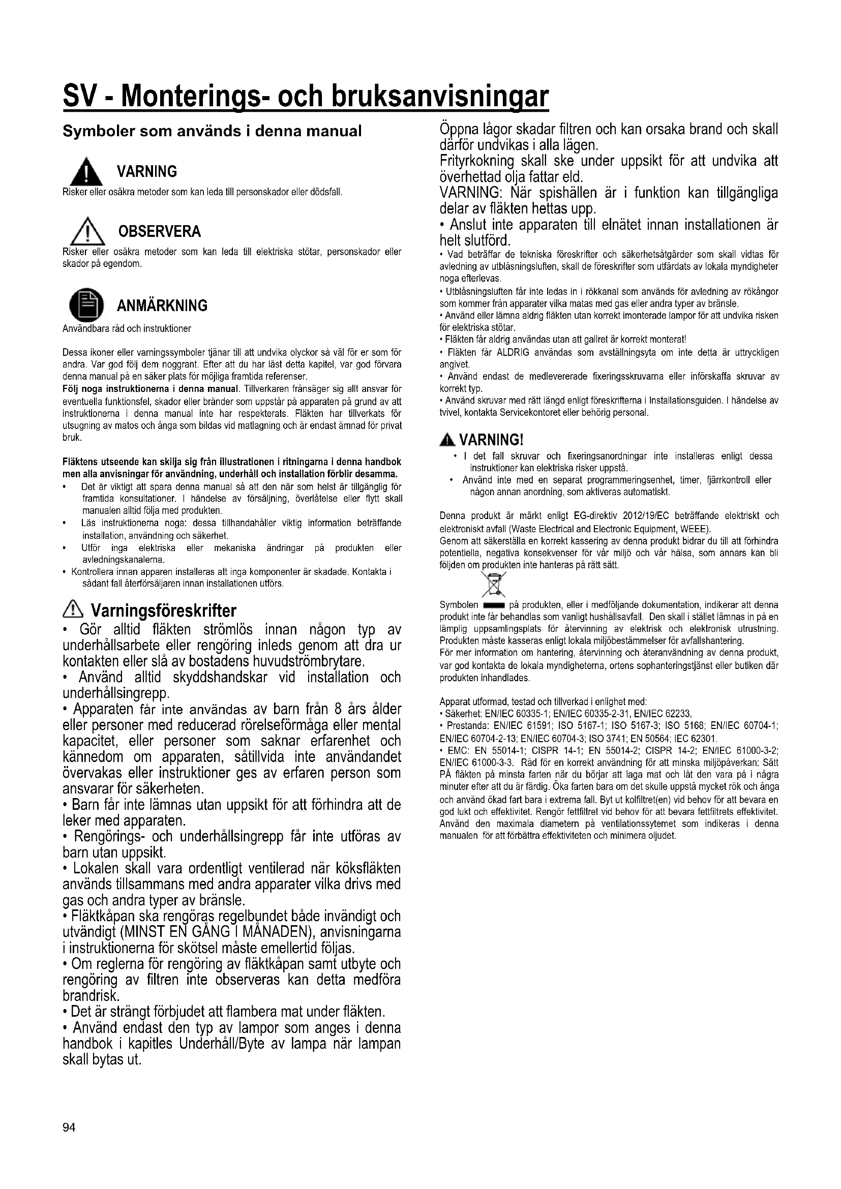 ANMÄRKNING Användbara råd och instruktioner Dessa ikoner eller varningssymboler tjänar till att undvika olyckor så väl för er som för andra. Var god följ dem noggrant. Efter att du har läst detta kapitel, var god förvara denna manual på en säker plats för möjliga framtida referenser. Följ noga instruktionerna i denna manual. Tillverkaren frånsäger sig allt ansvar för eventuella funktionsfel, skador eller bränder som uppstår på apparaten på grund av att instruktionerna i denna manual inte har respekterats. Fläkten har tillverkats för utsugning av matos och ånga som bildas vid matlagning och är endast ämnad för privat bruk. Fläktens utseende kan skilja sig från illustrationen i ritningarna i denna handbok men alla anvisningar för användning, underhåll och installation förblir desamma.