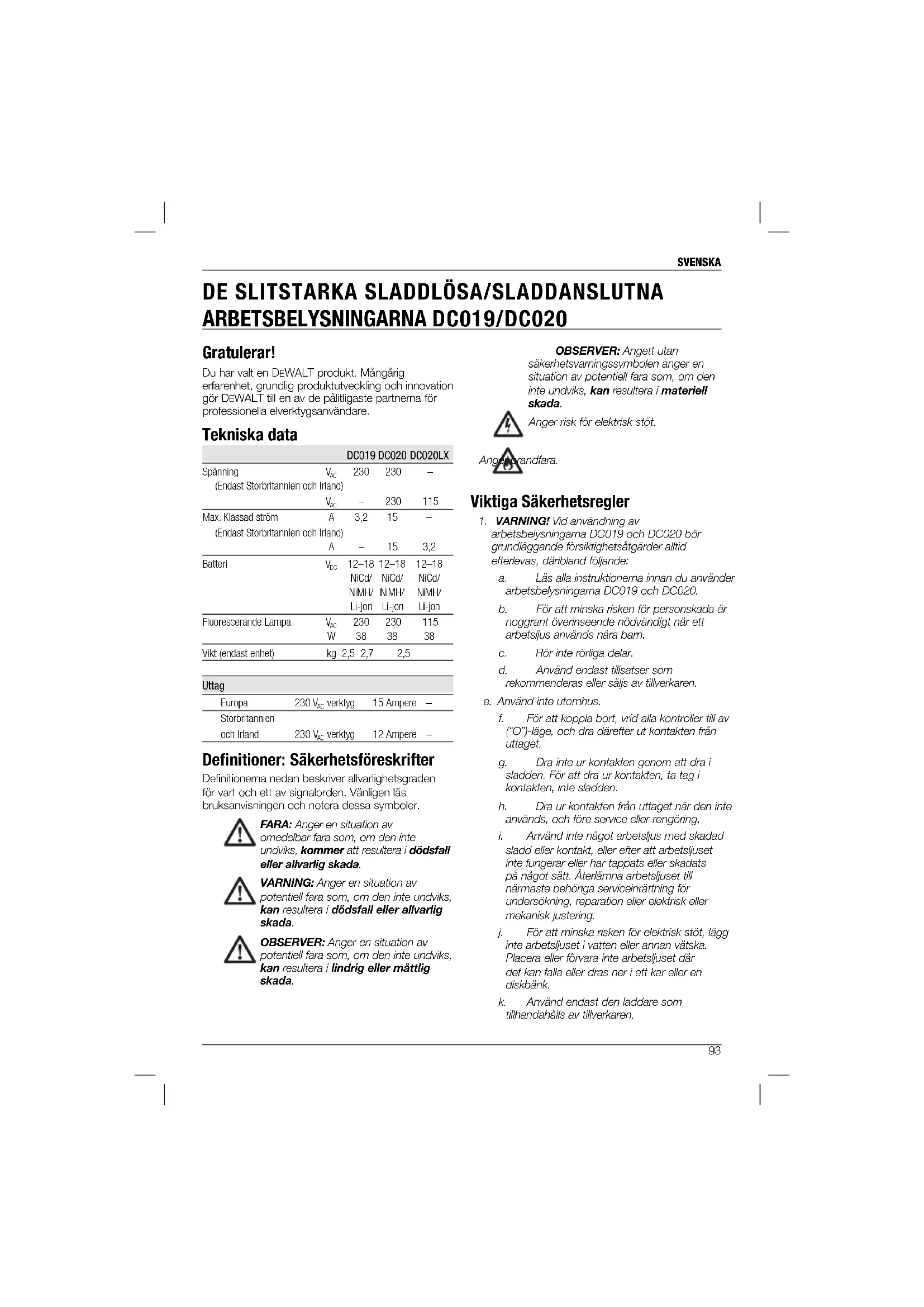 - Följande risker är naturligt förekommande vid användningen av detta redskap: – försämrad syn när du tittar direkt in i fluorescerande ljus – brännskador om du vidrör en het lampa Jordningsinstruktioner Arbetsbelysning DC020 (230 V) måste vara jordad. För den händelse att den felfunktionerar eller slutar fungera erbjuder jordning en minsta motståndets väg för den elektriska strömmen, för att minska risken för elektrisk stöt. Arbetsbelysningen är utrustad med en sladd som har en utrustnings-jordande ledare och en jordningskontakt. Kontakten måste vara isatt i ett lämpligt uttag, som är korrekt installerat och jordat i enlighet med alla lokala föreskrifter och förordningar. FARA: Felaktig anslutning av utrustningens jordningsledare kan resultera i risk för elektrisk stöt. Den ledare vars isolering har en utvändig yta som är grön med gula ränder är den utrustningsjordande ledaren. Om reparation eller utbyte av sladden eller kontakten är nödvändig, anslut inte den utrustningsjordande ledaren till en strömförande kontakt. Reparationer får endast utföras av DEWALTs serviceombud. Modifiera inte den kontakt som levereras med arbetsbelysningen – om den inte passar till uttaget, få ett korrekt uttag installerat av ett reparationsombud från DEWALT.