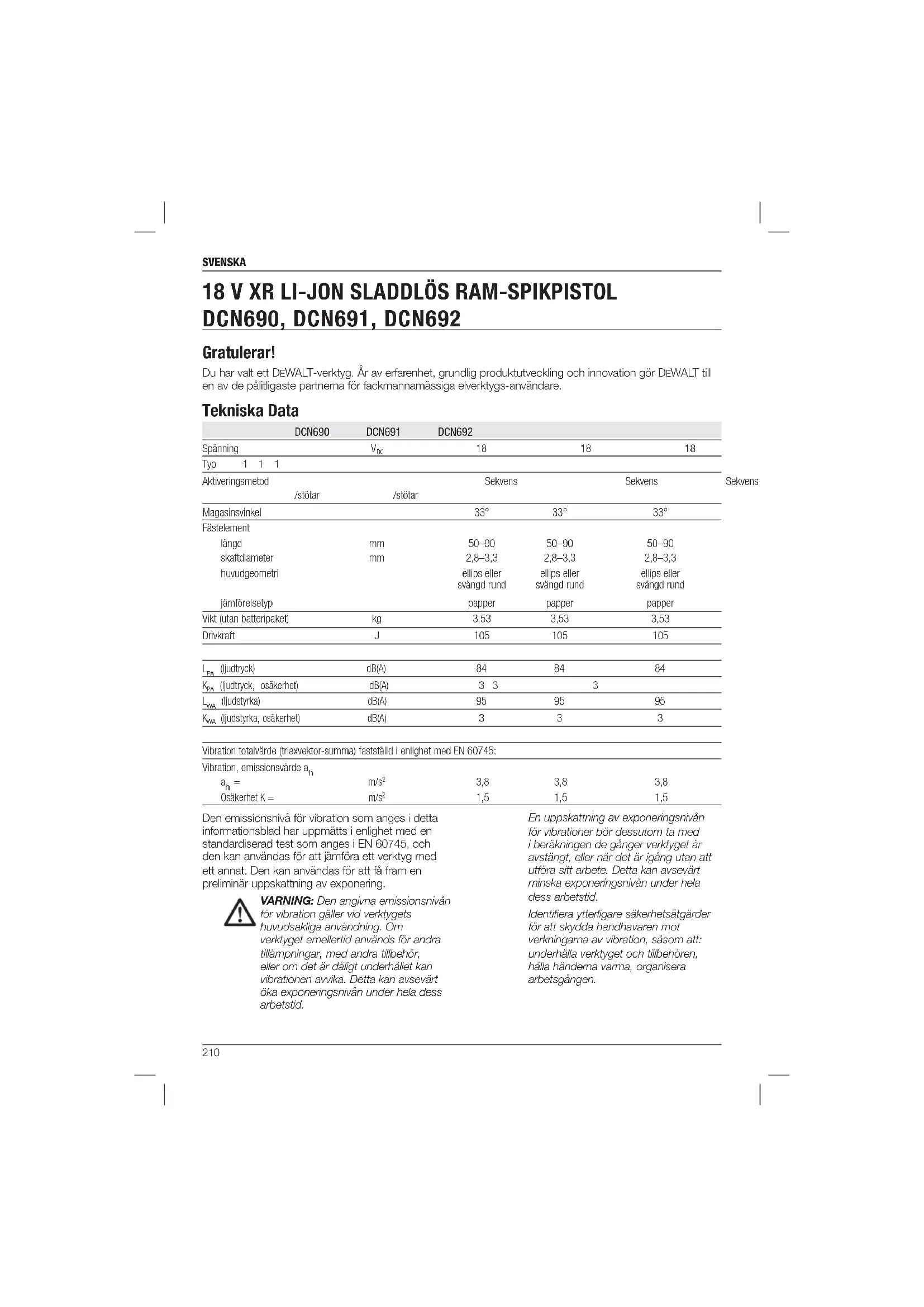 Gratulerar! Du har valt ett DEWALT-verktyg. År av erfarenhet, grundlig produktutveckling och innovation gör DEWALT till en av de pålitligaste partnerna för fackmannamässiga elverktygs-användare. Tekniska Data