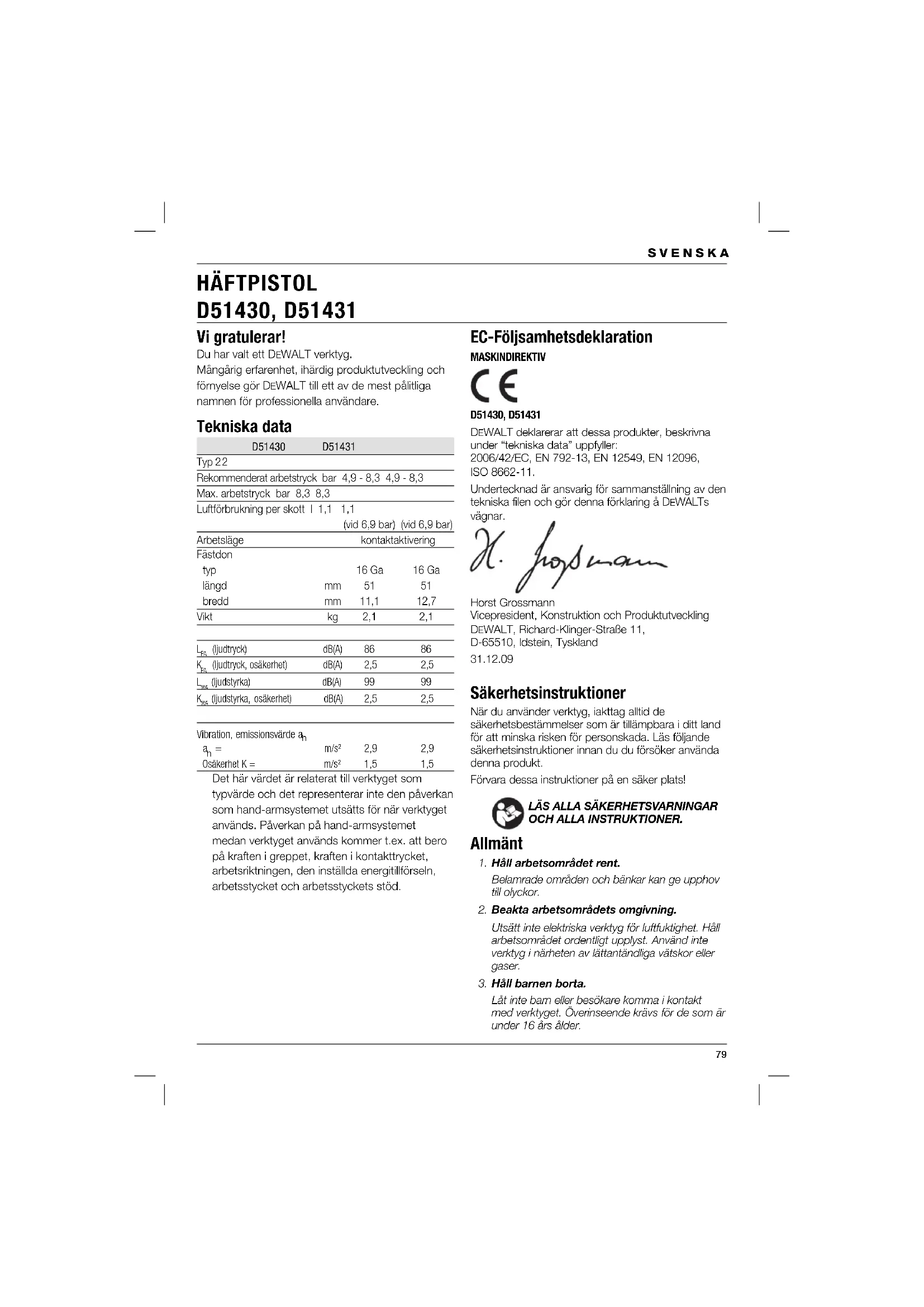 m/s² 2,9 2,9 Osäkerhet K = m/s² 1,5 1,5 Det här värdet är relaterat till verktyget som typvärde och det representerar inte den påverkan som hand-armsystemet utsätts för när verktyget används. Påverkan på hand-armsystemet medan verktyget används kommer t.ex. att bero på kraften i greppet, kraften i kontakttrycket, arbetsriktningen, den inställda energitillförseln, arbetsstycket och arbetsstyckets stöd. EC-Följsamhetsdeklaration MASKINDIREKTIV D51430, D51431 DEWALT deklarerar att dessa produkter, beskrivna under “tekniska data” uppfyller: 2006/42/EC, EN 792-13, EN 12549, EN 12096, ISO 8662-11. Undertecknad är ansvarig för sammanställning av den tekniska filen och gör denna förklaring å DEWALTs vägnar. Horst Grossmann Vicepresident, Konstruktion och Produktutveckling DEWALT, Richard-Klinger-Straße 11, D-65510, Idstein, Tyskland