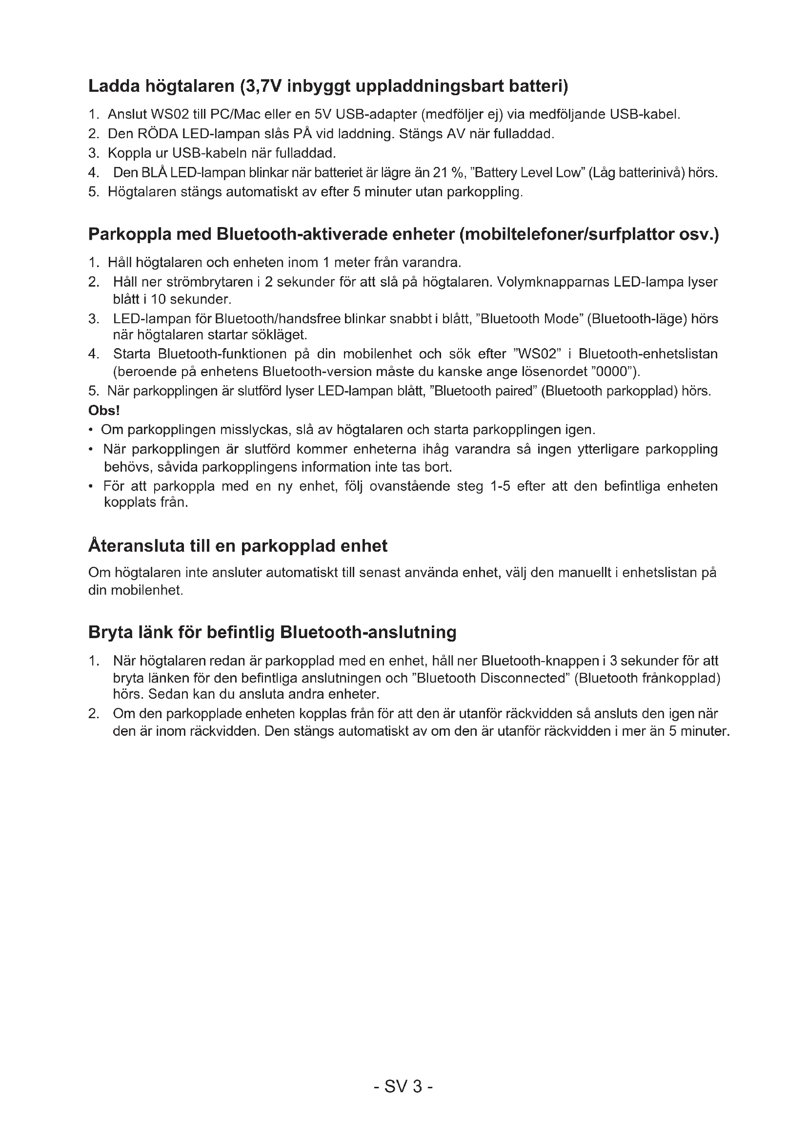 4. Högtalaren använder inte Bluetooth-funktionen när den är ansluten via denna kabel.- SV 5 -