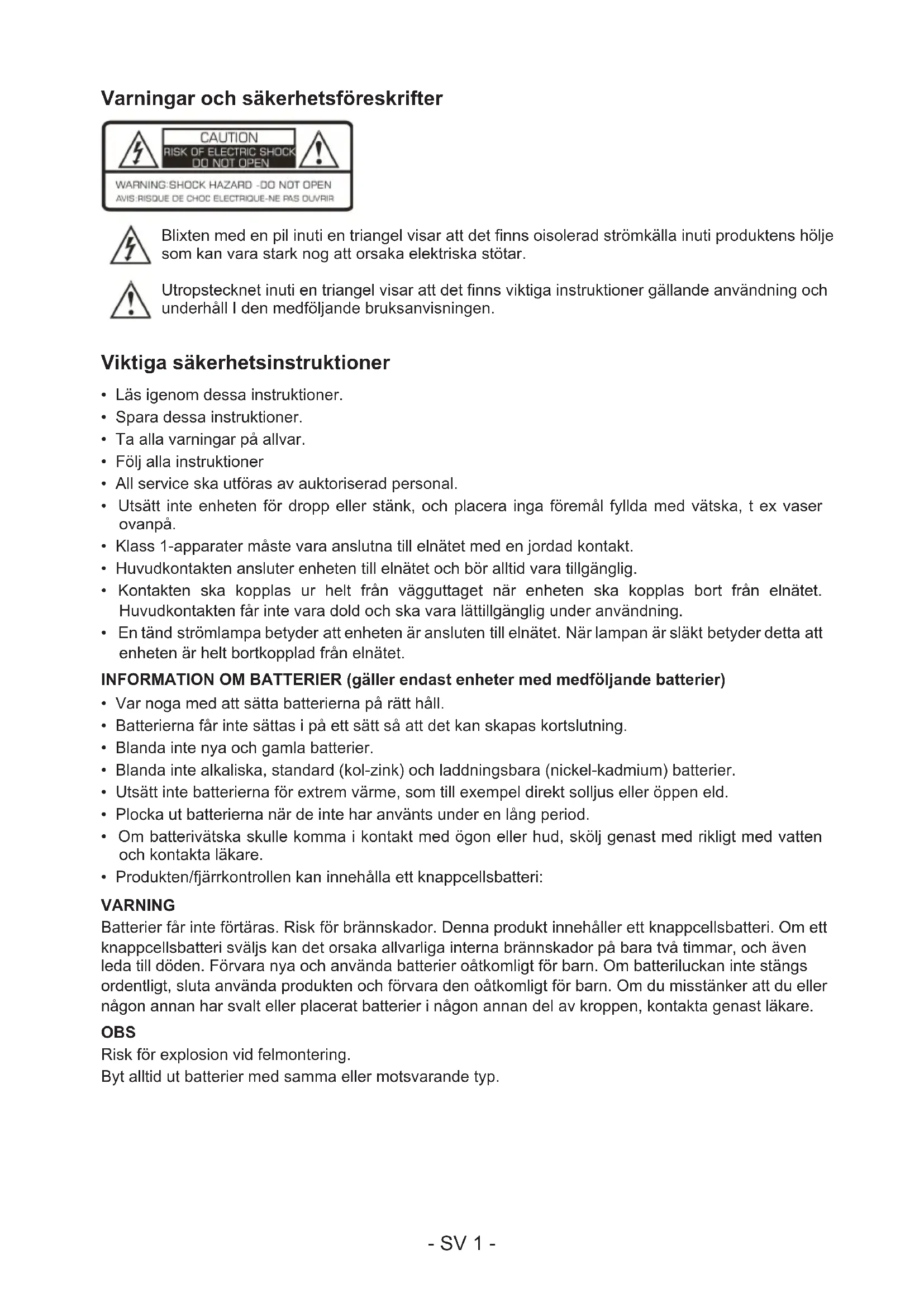 - Om batterivätska skulle komma i kontakt med ögon eller hud, skölj genast med rikligt med vatten och kontakta läkare.