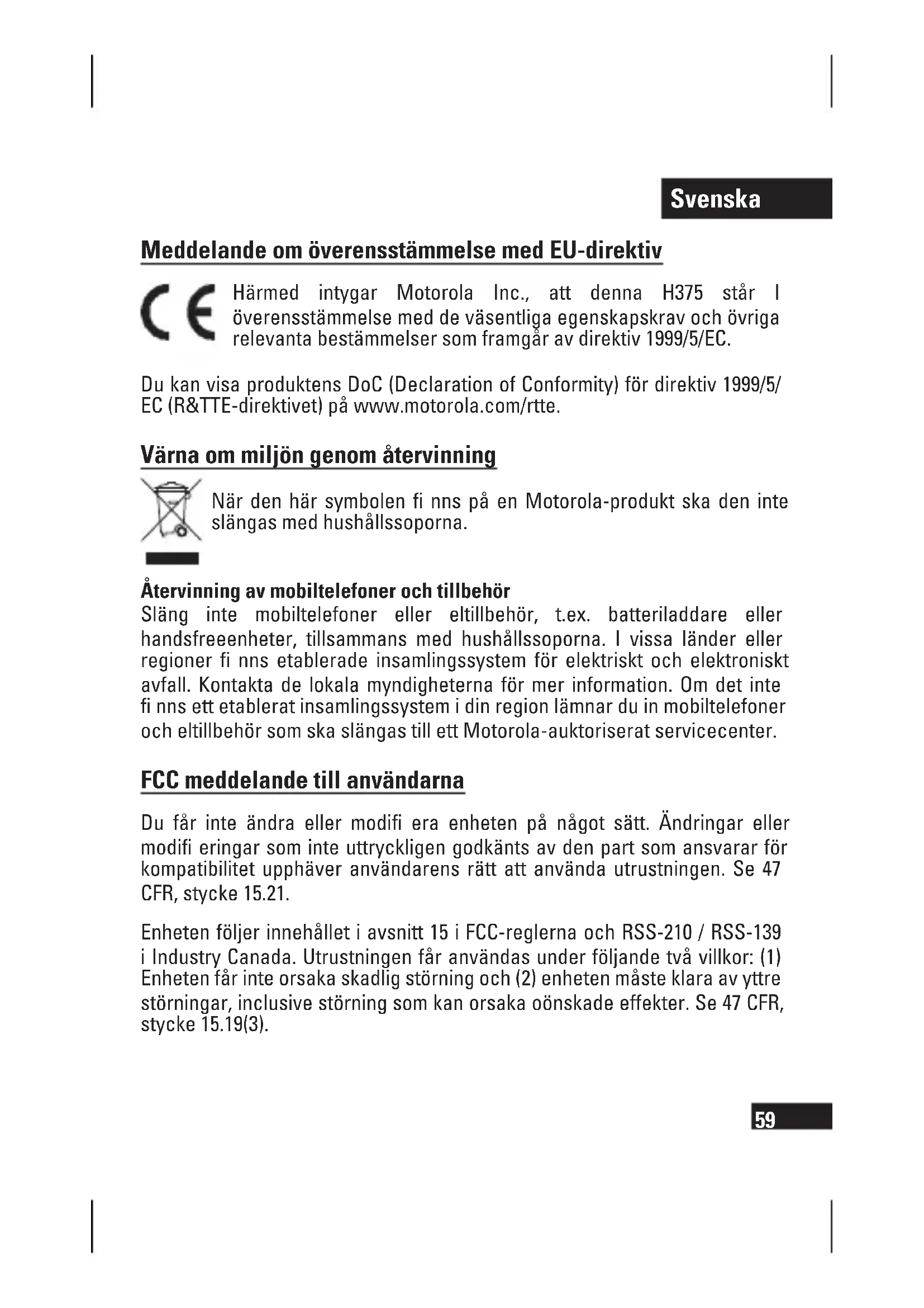 Meddelande om överensstämmelse med EU-direktiv Härmed intygar Motorola Inc., att denna H375 står I överensstämmelse med de väsentliga egenskapskrav och övriga relevanta bestämmelser som framgår av direktiv 1999/5/EC. Du kan visa produktens DoC (Declaration of Conformity) för direktiv 1999/5/ EC (R&TTE-direktivet) på www.motorola.com/rtte. Värna om miljön genom återvinning När den här symbolen fi nns på en Motorola-produkt ska den inte slängas med hushållssoporna. Återvinning av mobiltelefoner och tillbehör Släng inte mobiltelefoner eller eltillbehör, t.ex. batteriladdare eller handsfreeenheter, tillsammans med hushållssoporna. I vissa länder eller regioner fi nns etablerade insamlingssystem för elektriskt och elektroniskt avfall. Kontakta de lokala myndigheterna för mer information. Om det inte fi nns ett etablerat insamlingssystem i din region lämnar du in mobiltelefoner och eltillbehör som ska slängas till ett Motorola-auktoriserat servicecenter. FCC meddelande till användarna Du får inte ändra eller modifi era enheten på något sätt. Ändringar eller modifi eringar som inte uttryckligen godkänts av den part som ansvarar för kompatibilitet upphäver användarens rätt att använda utrustningen. Se 47 CFR, stycke 15.21. Enheten följer innehållet i avsnitt 15 i FCC-reglerna och RSS-210 / RSS-139 i Industry Canada. Utrustningen får användas under följande två villkor: (1) Enheten får inte orsaka skadlig störning och (2) enheten måste klara av yttre störningar, inclusive störning som kan orsaka oönskade effekter. Se 47 CFR, stycke 15.19(3).Svenska