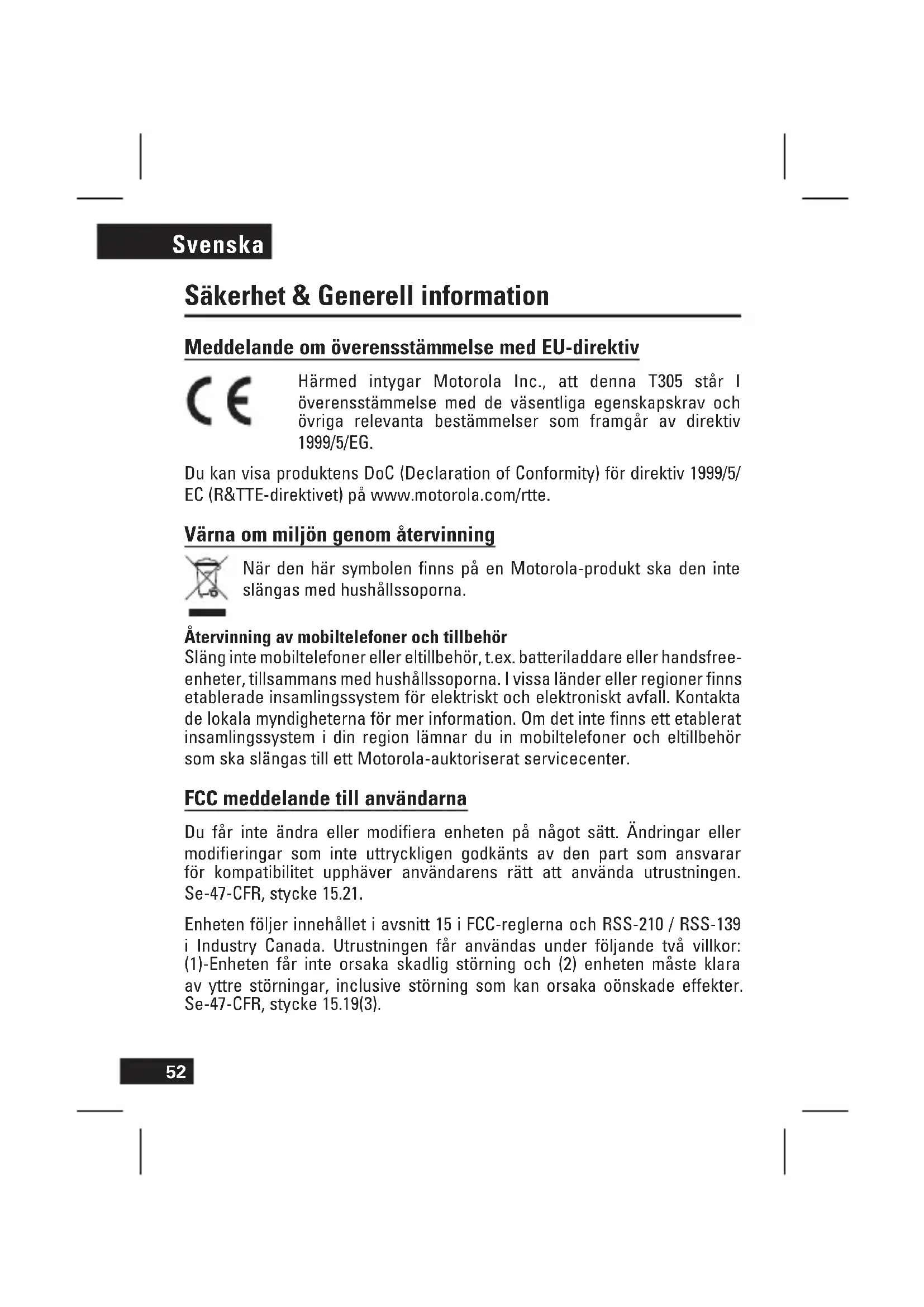 Resolução de Problemas O meu altifalante mãos-livres não entra no modo de emparelhamento: certifique-se de que eventuais dispositivos previamente emparelhados com o altifalante mãos-livres se encontram desligados. Se o indicador luminoso estiver intermitente a azul, desligue o outro dispositivo e aguarde 10 segundos. O indicador luminoso acende a azul para indicar que o altifalante mãos-livres está agora em modo de emparelhamento. O meu telefone não encontra o altifalante mãos-livres: certifique-se de que o indicador luminoso do altifalante mãos-livres está aceso quando o telefone estiver a procurar dispositivos. O meu altifalante mãos-livres deixou de funcionar: Certifique-se de que a funcionalidade Bluetooth está activada no telefone. Se a funcionalidade Bluetooth tiver sido desligada ou temporariamente ligada, pode ser necessário reiniciar a funcionalidade Bluetooth e emparelhar novamente o telefone com o altifalante mãos-livres. Se tiver mais questões, contacte a nossa linha de assistência através do número 214100110 ou visite-nos em www.motorola.com Português52 Svenska Säkerhet & Generell information Meddelande om överensstämmelse med EU-direktiv Härmed intygar Motorola Inc., att denna T305 står I överensstämmelse med de väsentliga egenskapskrav och övriga relevanta bestämmelser som framgår av direktiv 1999/5/EG. Du kan visa produktens DoC (Declaration of Conformity) för direktiv 1999/5/ EC (R&TTE-direktivet) på www.motorola.com/rtte. Värna om miljön genom återvinning När den här symbolen finns på en Motorola-produkt ska den inte slängas med hushållssoporna. Återvinning av mobiltelefoner och tillbehör Släng inte mobiltelefoner eller eltillbehör, t.ex. batteriladdare eller handsfree- enheter, tillsammans med hushållssoporna. I vissa länder eller regioner finns etablerade insamlingssystem för elektriskt och elektroniskt avfall. Kontakta de lokala myndigheterna för mer information. Om det inte finns ett etablerat insamlingssystem i din region lämnar du in mobiltelefoner och eltillbehör som ska slängas till ett Motorola-auktoriserat servicecenter. FCC meddelande till användarna Du får inte ändra eller modifiera enheten på något sätt. Ändringar eller modifieringar som inte uttryckligen godkänts av den part som ansvarar för kompatibilitet upphäver användarens rätt att använda utrustningen. Se-47-CFR, stycke 15.21. Enheten följer innehållet i avsnitt 15 i FCC-reglerna och RSS-210 / RSS-139 i Industry Canada. Utrustningen får användas under följande två villkor: (1)-Enheten får inte orsaka skadlig störning och (2) enheten måste klara av yttre störningar, inclusive störning som kan orsaka oönskade effekter. Se-47-CFR, stycke 15.19(3).53