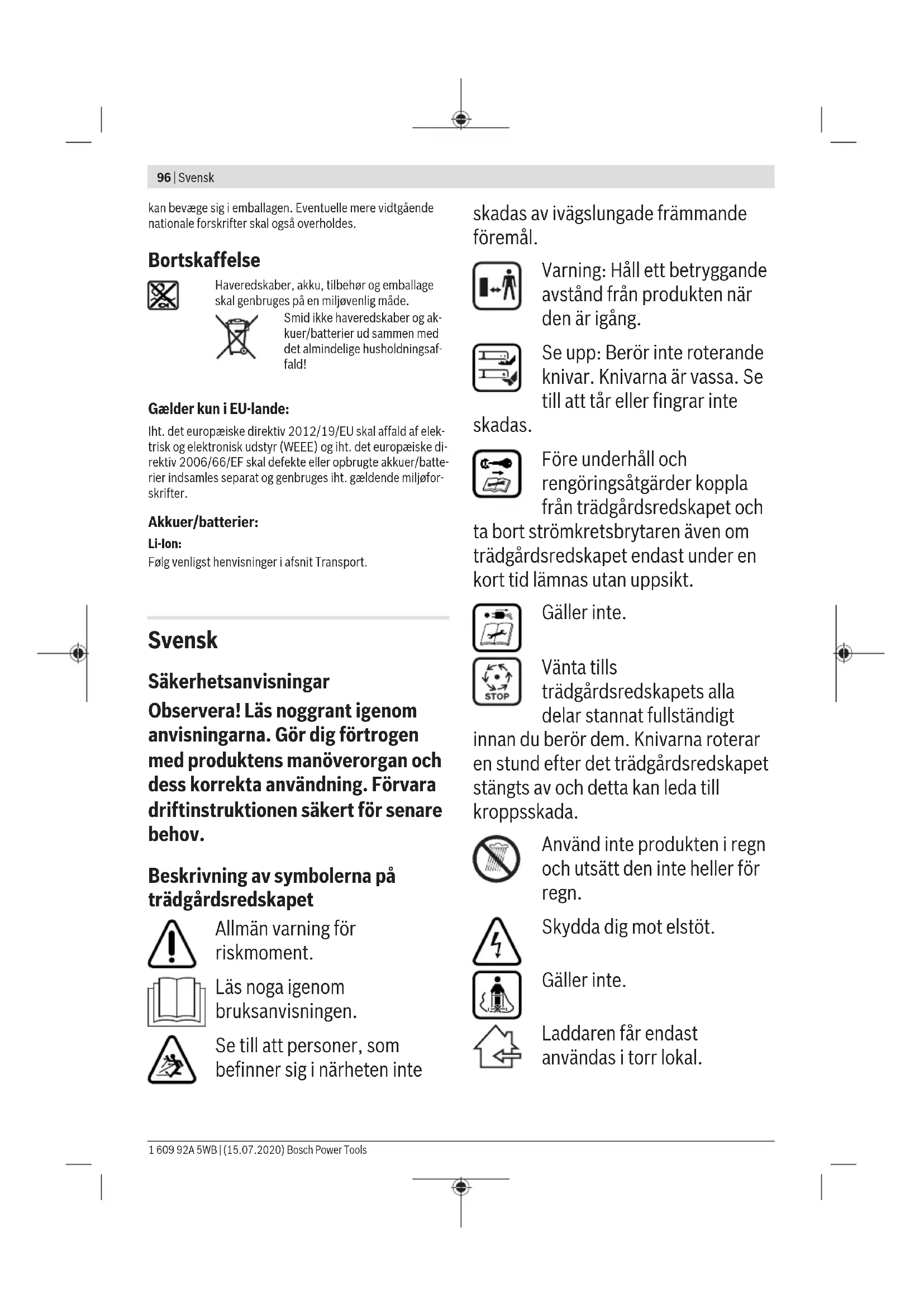 Løbetiden forlænges ved at købe en ekstra akku hos et auto- riseret servicecenter for Bosch haveredskab. Fejlsøgning Symptom Mulig årsag Afhjælpning Motoren går ikke i gang Haveredskabets indvendige ledninger er beskadi- get Kontakt Bosch kundeservicen Akkuen er afladt Oplad akkuen Akkuen er for kold/varm Opvarm/afkøl akkuen Græs for langt Maks. tilladt græshøjde er 30 cm med den største indstilling af slåhøjden Motorværn er aktiveret Lad motoren afkøle og indstil en større slåhøjde Strømkredsafbryderen er ikke blevet sat rigtigt i/ fuldstændigt i Sæt den rigtigt i Haveredskab kører i intervaller Haveredskabets indvendige ledninger er beskadi- get Kontakt Bosch kundeservicen Motorværn er aktiveret Lad motoren afkøle og indstil en større slåhøjde Haveredskabet efter- lader et uregelmæssigt slåbillede, og/eller motoren arbejder tungt Slåhøjden er for lav Indstil en større slåhøjde Knive er sløve Skift knive (se Fig. K) Tilstopning mulig Sluk haveredskabet og løsn strømkredsafbry- deren 1 609 92A 5WB | (15.07.2020) Bosch Power ToolsDansk | 95 Symptom Mulig årsag Afhjælpning Kontrollér undersiden på haveredskabet og frigør det evt. for græs (brug altid havehandsker) Kniven er monteret forkert Montér kniven rigtigt Når haveredskabet tændes, drejer kniven ikke Kniven bremses af græsset Sluk haveredskabet og løsn strømkredsafbry- deren Fjern blokeringen (brug altid havehandsker) Knivmøtrikken/-skruen er løs Spænd knivmøtrikken/-skruen (27Nm) For stor vibration/støj Knivmøtrikken/-skruen er løs Spænd knivmøtrikken/-skruen (27Nm) Knivene er beskadigede Skift knive (se Fig. K) Akku og ladeaggregat Symptomer Mulig årsag Afhjælpning Den røde akku-kontrol- lampe blinker på lade- aggregatet Opladning er ikke mulig Akkuen er ikke sat (rigtigt) i Anbring akkuen korrekt på ladeaggregatet Akkukontakter er snavset Rengør akkukontakterne; f.eks. ved at sætte ak- kuen i og tage den ud flere gange eller erstatte den Akku defekt Skift akkuen Akku-kontrollamper ly- ser ikke på ladeaggre- gatet Ladeaggregatets netstik er ikke sat (rigtigt) i Sæt netstikket (helt) ind i stikdåsen Stikdåse, netkabel eller ladeaggregat er defekt Kontrollér netspændingen, lad evt. ladeaggrega- tet blive kontrolleret af en autoriseret servicecen- ter for Bosch-el‑værktøj Vedligeholdelse og service Akku-pleje u Bemærk! Sluk for haveredskabet, løsn strømkredsaf- bryderen og fjern akkuen samt græsboksen, før vedli- geholdelses- eller rengøringsarbejde gennemføres. u Brug altid havehandsker, hvis du håndterer eller ar- bejder i nærheden af skarpe knive. Overhold følgende forskrifter og foranstaltninger for at mu- liggøre en optimal brug af akkuen: – Beskyt akkuen mod fugtighed og vand. – Opbevar kun haveredskabet og akkuen ved temperaturer mellem -20 °C og 50 °C. Lad f.eks. ikke akkuen blive lig- gende i bilen om sommeren. – Opbevar akkuen separat og ikke i haveredskabet. – Lad ikke akkuen blive siddende i haveredskabet i solskinsvejr. – Den optimale temperatur til opbevaring af akkuen er 5 °C. – Rengør akkuens ventilationsåbninger en gang imellem med en blød, ren og tør pensel. Når driftstiden efter opladningen forkortes væsentligt, er det tegn på, at akkuen er slidt op og skal udskiftes. Kundeservice og anvendelsesrådgivning Kundeservice besvarer dine spørgsmål vedr. reparation og vedligeholdelse af dit produkt samt reservedele. Eksplo- sionstegninger og oplysninger om reservedele finder du også på: www.bosch-pt.com Bosch-anvendelsesrådgivningsteamet hjælper dig gerne, hvis du har spørgsmål til produkter og tilbehørsdele. Produktets 10‑cifrede typenummer (se typeskilt) skal altid angives ved forespørgsler og bestilling af reservedele. Dansk Bosch Service Center Telegrafvej 3 2750 Ballerup På www.bosch-pt.dk kan der online bestilles reservedele el- ler oprettes en reparations ordre. Tlf. Service Center: 44898855 Fax: 44898755 E-Mail: vaerktoej@dk.bosch.com Du finder adresser til andre værksteder på: www.bosch-pt.com/serviceaddresses Transport De indeholdte Li-Ion-akkuer overholder bestemmelserne om farligt gods. Akkuerne kan transporteres af brugeren på of- fentlig vej uden yderligere pålæg. Ved forsendelse gennem tredjemand (f.eks.: lufttransport el- ler spedition) skal særlige krav vedr. emballage og mærkning overholdes. Her skal man kontakte en faregodsekspert, før forsendelsesstykket forberedes. Send kun akkuer, hvis huset er ubeskadiget. Tilklæb åbne kontakter og indpak akkuen på en sådan måde, at den ikke Bosch Power Tools 1 609 92A 5WB | (15.07.2020)96 | Svensk kan bevæge sig i emballagen. Eventuelle mere vidtgående nationale forskrifter skal også overholdes. Bortskaffelse Haveredskaber, akku, tilbehør og emballage skal genbruges på en miljøvenlig måde. Smid ikke haveredskaber og ak- kuer/batterier ud sammen med det almindelige husholdningsaf- fald! Gælder kun i EU‑lande: Iht. det europæiske direktiv 2012/19/EU skal affald af elek- trisk og elektronisk udstyr (WEEE) og iht. det europæiske di- rektiv 2006/66/EF skal defekte eller opbrugte akkuer/batte- rier indsamles separat og genbruges iht. gældende miljøfor- skrifter. Akkuer/batterier: Li-Ion: Følg venligst henvisninger i afsnit Transport. Svensk Säkerhetsanvisningar Observera! Läs noggrant igenom anvisningarna. Gör dig förtrogen med produktens manöverorgan och dess korrekta användning. Förvara driftinstruktionen säkert för senare behov. Beskrivning av symbolerna på trädgårdsredskapet Allmän varning för riskmoment. Läs noga igenom bruksanvisningen. Se till att personer, som befinner sig i närheten inte skadas av ivägslungade främmande föremål. Varning: Håll ett betryggande avstånd från produkten när den är igång. Se upp: Berör inte roterande knivar. Knivarna är vassa. Se till att tår eller fingrar inte skadas. Före underhåll och rengöringsåtgärder koppla från trädgårdsredskapet och ta bort str