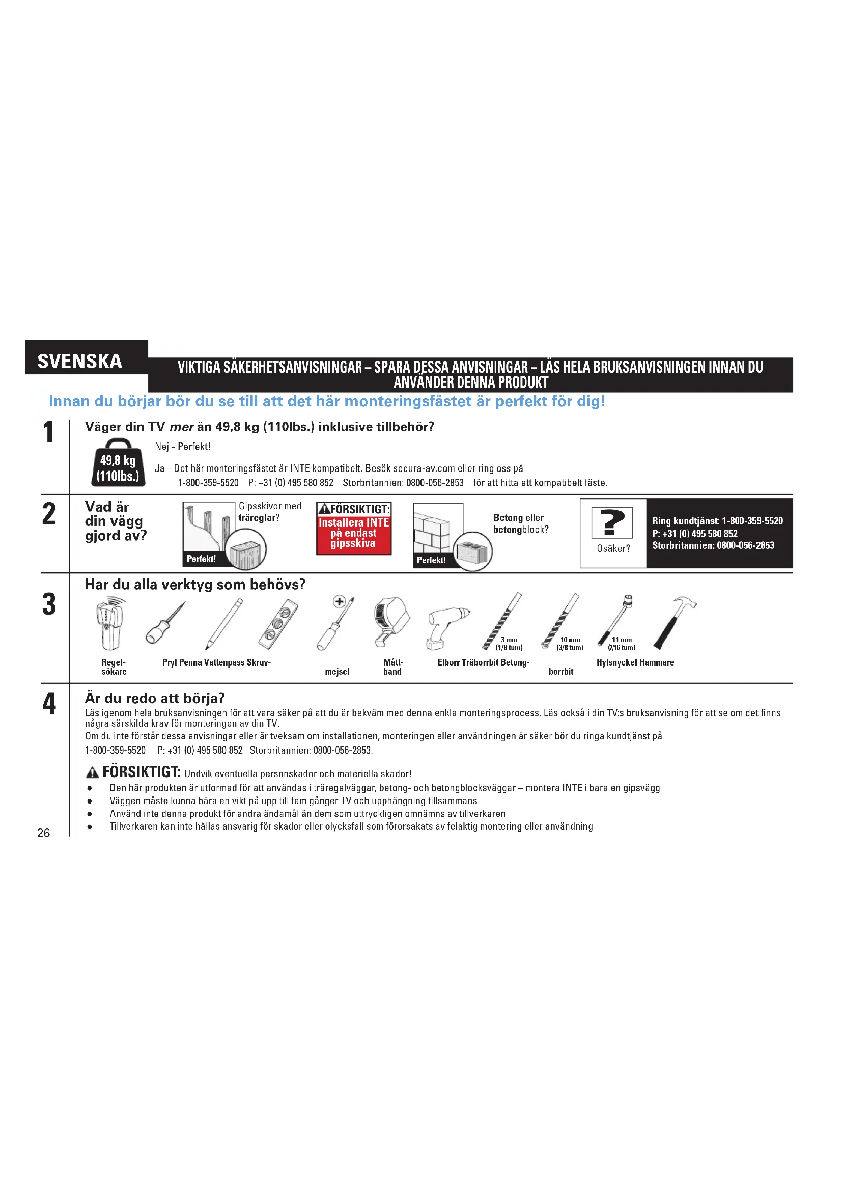 Det här monteringsfästet är INTE kompatibelt. Besök secura-av.com eller ring oss på 1-800-359-5520 P: +31 (0) 495 580 852 Storbritannien: 0800-056-2853 för att hitta ett kompatibelt fäste. Är du redo att börja? Läs igenom hela bruksanvisningen för att vara säker på att du är bekväm med denna enkla monteringsprocess. Läs också i din TV:s bruksanvisning för att se om det finns några särskilda krav för monteringen av din TV. Om du inte förstår dessa anvisningar eller är tveksam om installationen, monteringen eller användningen är säker bör du ringa kundtjänst på 1-800-359-5520 P: +31 (0) 495 580 852 Storbritannien: 0800-056-2853. FÖRSIKTIGT: Undvik eventuella personskador och materiella skador! ● Den här produkten är utformad för att användas i träregelväggar, betong- och betongblocksväggar – montera INTE i bara en gipsvägg ● Väggen måste kunna bära en vikt på upp till fem gånger TV och upphängning tillsammans ● Använd inte denna produkt för andra ändamål än dem som uttryckligen omnämns av tillverkaren ● Tillverkaren kan inte hållas ansvarig för skador eller olycksfall som förorsakats av felaktig montering eller användning Innan du börjar bör du se till att det här monteringsfästet är perfekt för dig!