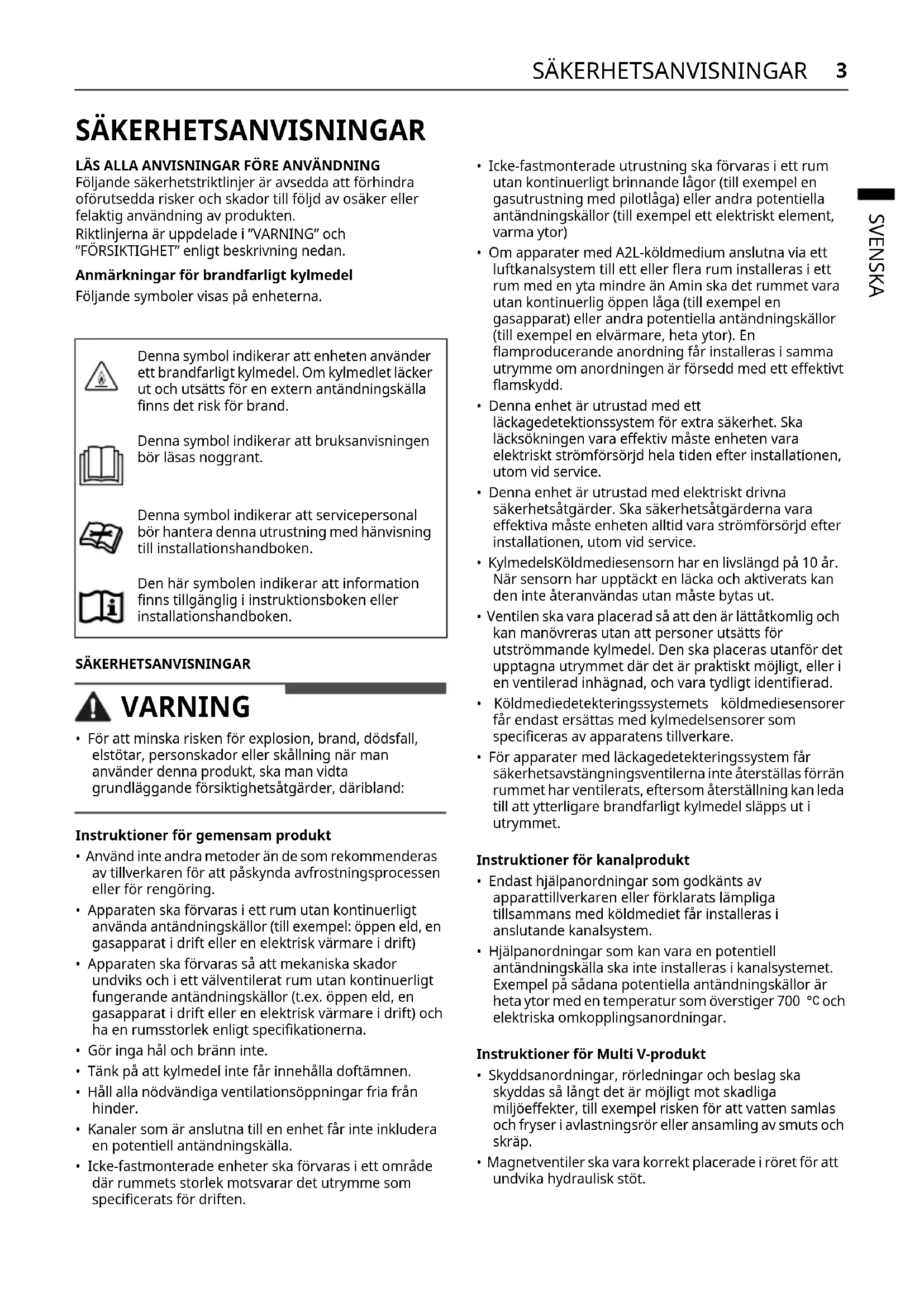 SÄKERHETSANVISNINGAR SVENSKA SÄKERHETSANVISNINGAR LÄS ALLA ANVISNINGAR FÖRE ANVÄNDNING Följande säkerhetstriktlinjer är avsedda att förhindra oförutsedda risker och skador till följd av osäker eller felaktig användning av produkten. Riktlinjerna är uppdelade i ”VARNING” och ”FÖRSIKTIGHET” enligt beskrivning nedan. Anmärkningar för brandfarligt kylmedel Följande symboler visas på enheterna. SÄKERHETSANVISNINGAR VARNING