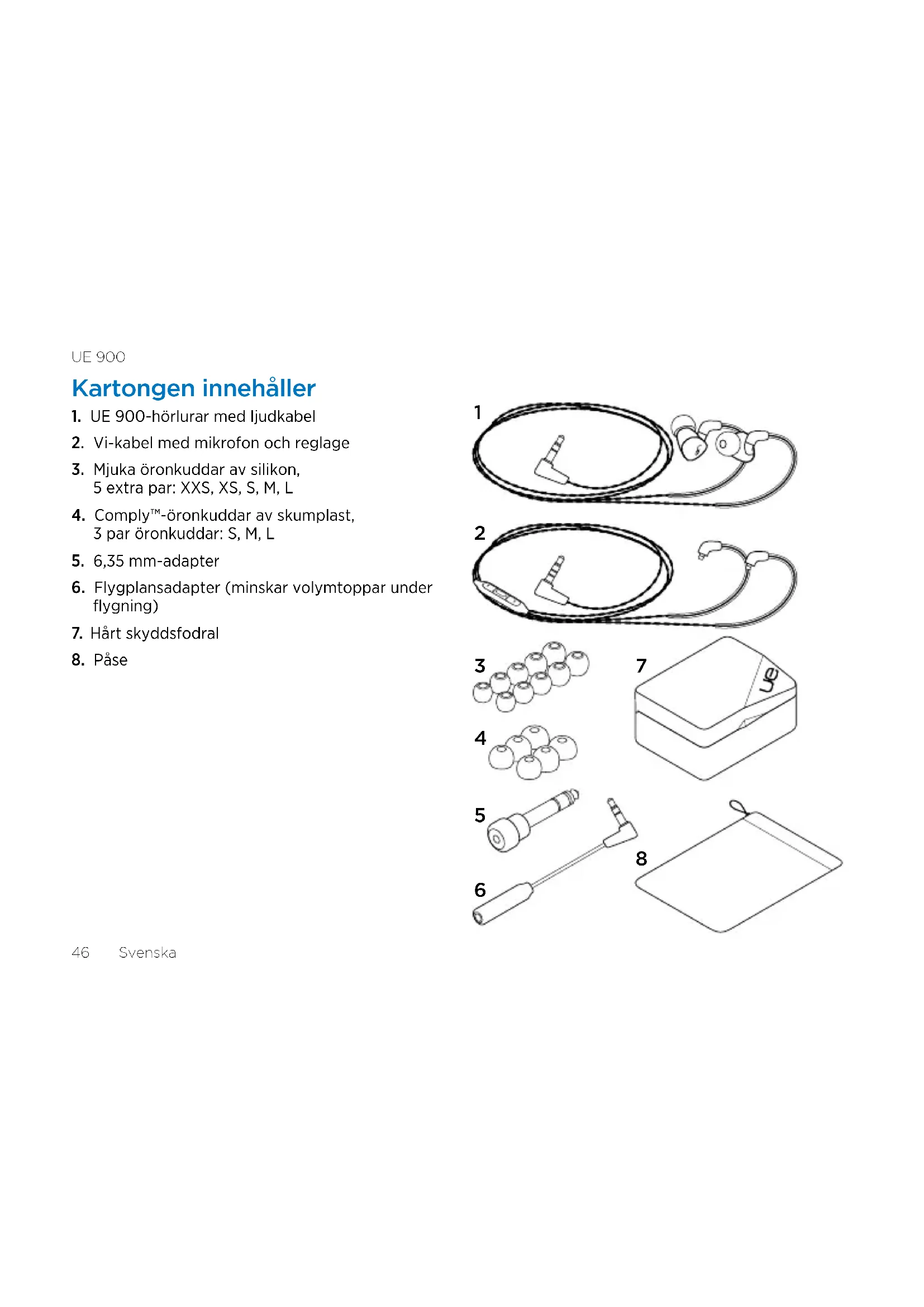 Välj den storlek på öronkuddarna som bäst passar dina öron och ger bäst ljud. Mer information om hur du väljer öronkuddar finns på www.logitech. com/support/ue900.