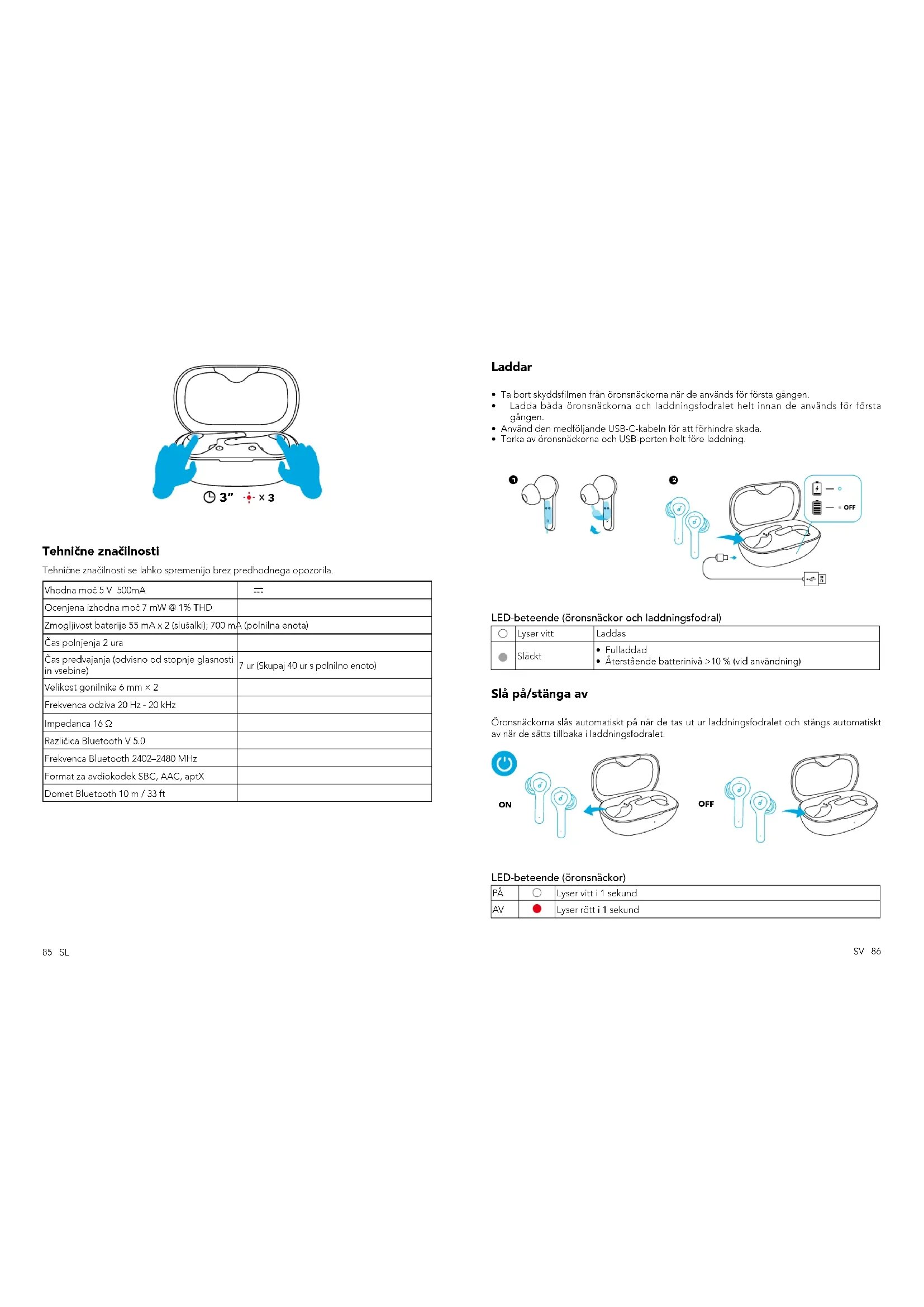 - Återstående batterinivå >10 % (vid användning) Slå på/stänga av Öronsnäckorna slås automatiskt på när de tas ut ur laddningsfodralet och stängs automatiskt av när de sätts tillbaka i laddningsfodralet.