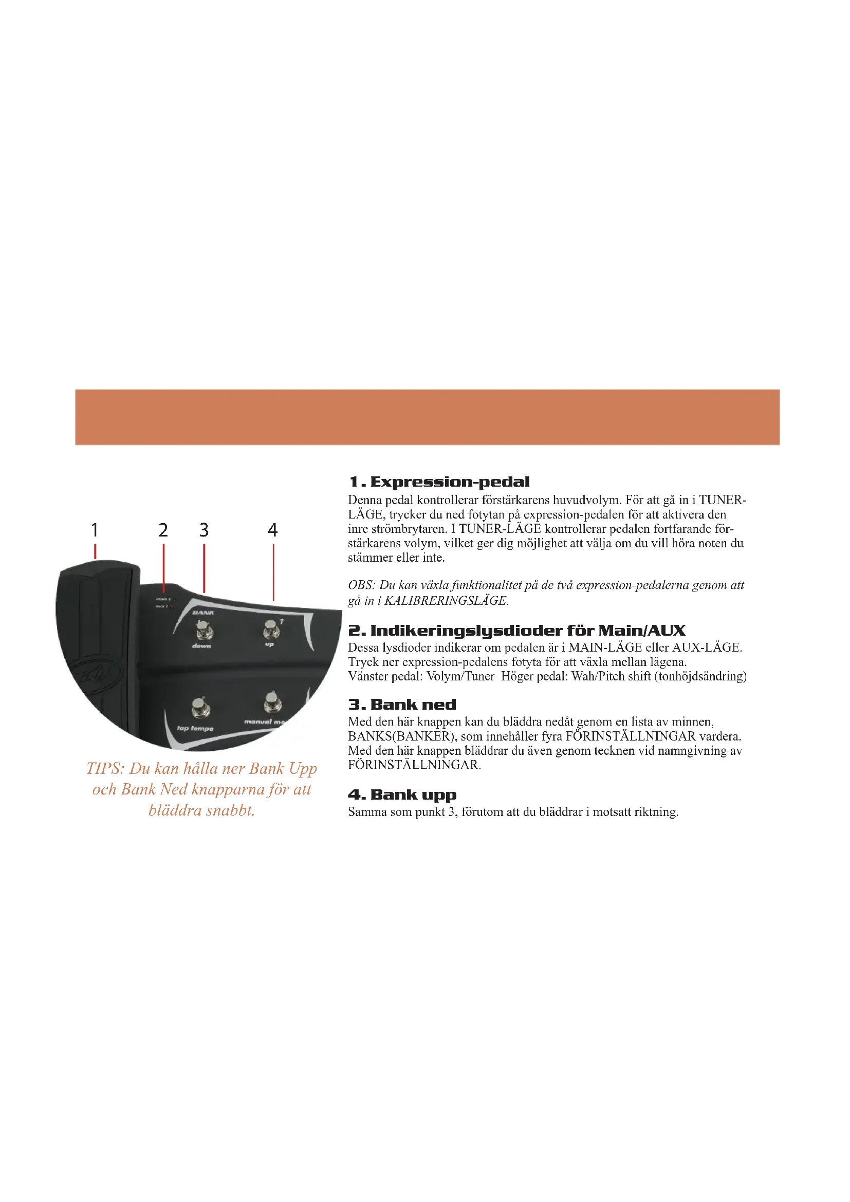 Denna pedal kontrollerar förstärkarens huvudvolym. För att gå in i TUNER- LÄGE, trycker du ned fotytan på expression-pedalen för att aktivera den inre strömbrytaren. I TUNER-LÄGE kontrollerar pedalen fortfarande för- stärkarens volym, vilket ger dig möjlighet att välja om du vill höra noten du stämmer eller inte. OBS: Du kan växla funktionalitet på de två expression-pedalerna genom att gå in i KALIBRERINGSLÄGE.