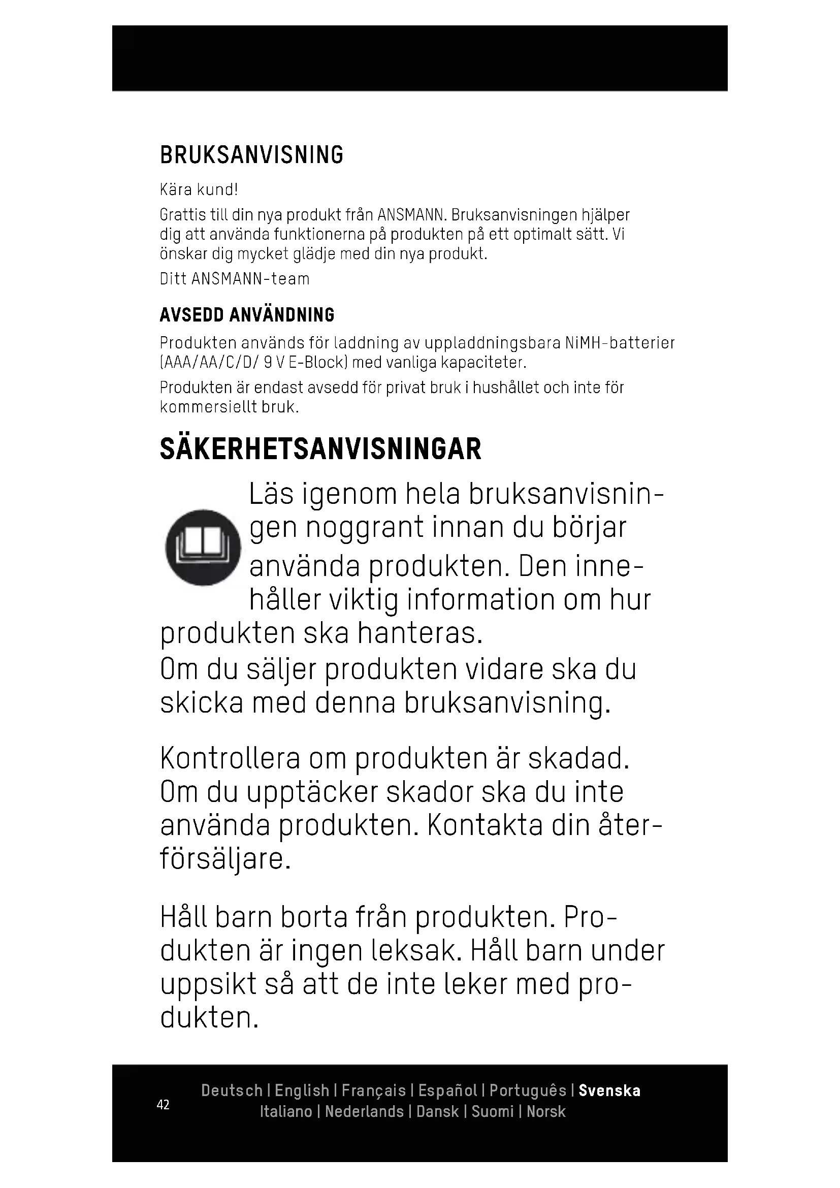 2650 mAh 2500 mAh 2100 mAh 1300 mAh 4 h 3,75 h 3 h 2 h 800 mA Baby C 4500 mAh 2500 mAh 6,75 h 3,75 h 800 mA Mono D 10000 mAh 8500 mAh 5000 mAh 15 h 12,75 h 7,5 h 800 mA 9 V E- Block Upp till 300 mAh 24h 15 mA Deutsch | English | Français | Español | Português | Svenska Italiano | Nederlands | Dansk | Suomi | Norsk48 Deutsch | English | Français | Español | Português | Svenska Italiano | Nederlands | Dansk | Suomi | Norsk AVFALLSHANTERING Avfallshantera produkten enligt gällande lokala bestämmelser. Symbolen ”Soptunna” hänvisar till att den elektriska produkten inte får avfallshanteras tillsammans med vanligt hushållsavfall inom EU. Använd återlämnings- och samlingsställen i din kommun eller kontakta återförsäljaren där du köpte produkten. Batterier är återvinningsbara och får inte kastas i hushållssopor- na. Lämna uttjänta batterier till anvisade återvinningscentraler. Så följer du lagen och bidrar till miljöskydd. ANSVARSFRISKRIVNING Informationen i denna bruksanvisning kan ändras utan föregående meddelande. ANSMANN ansvarar inte för direkta, indirekta, tillfälliga eller övriga skador eller följdskador som uppstår till följd av felaktig hantering eller underlåtenhet att beakta informationen i denna bruksanvisning. Vi ansvarar inte för felaktig användning av produkten och tillhandahåller inga garantier eller garantianspråk. GARANTI Vi erbjuder tre års garanti för produkten. Garantin täcker inte skador på produkten som uppstår på grund av att denna bruksanvisning inte har beaktats. Ditt lagliga garantianspråk påverkas inte. Produkten överensstämmer med kraven i tillämpliga EU direktiv. Våra garantivillkor finns online på: www.ansmann.de Med förbehåll för tekniska ändringar. Med förbehåll för tryckfel. Produkten överensstämmer med kraven i tillämpliga EU direktiv. Deutsch | English | Français | Español | Português | Svenska Italiano | Nederlands | Dansk | Suomi | Norsk49 Deutsch | English | Français | Español | Português | Svenska Italiano | Nederlands | Dansk | Suomi | Norsk