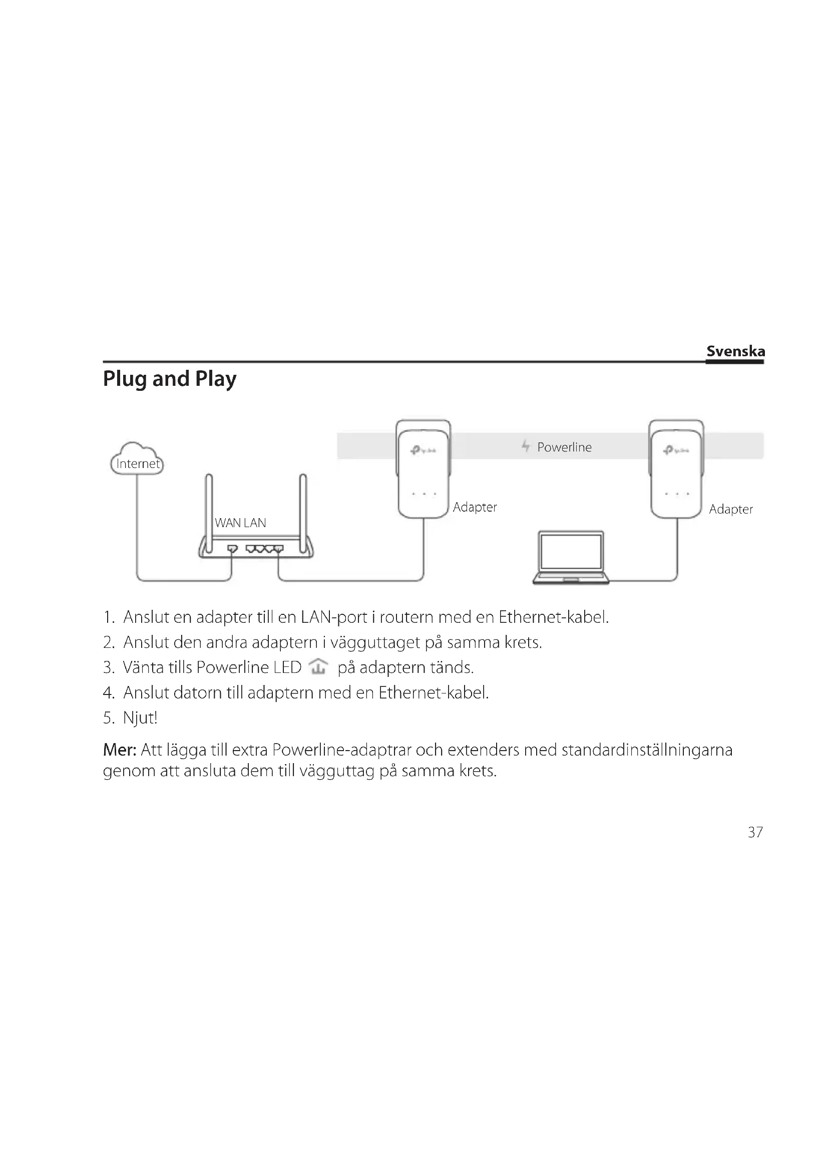 Mer: Att lägga till extra Powerline-adaptrar och extenders med standardinställningarna genom att ansluta dem till vägguttag på samma krets. Internet WAN LAN Adapter Adapter PowerlineSvenska