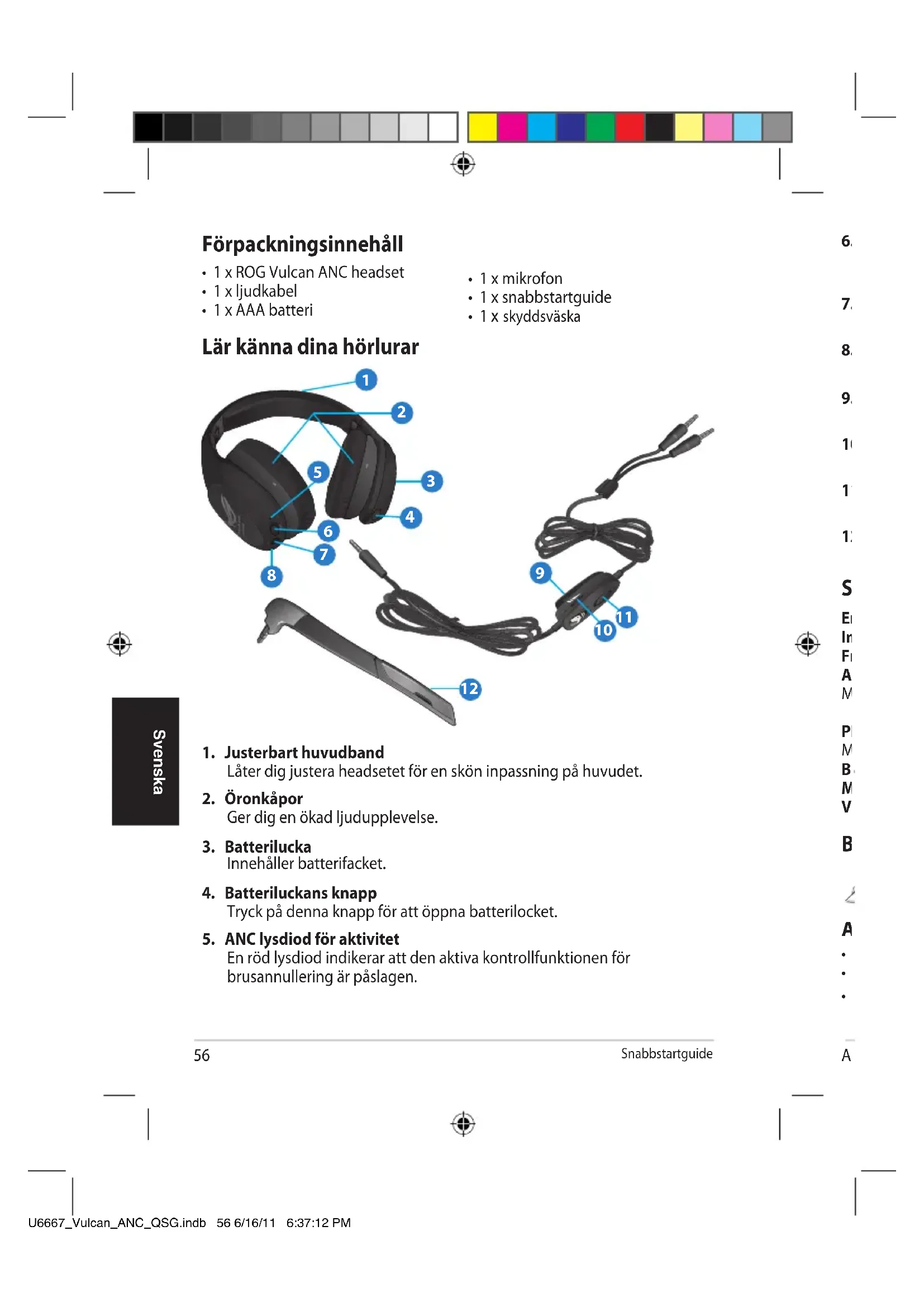 - Flytta volymkontrollen för att höja/sänka volymen. Sammanfattning av specikationer Enhet: 40 mm Impedans: 32 ohm Frekvensområde: 10~20 KHz ANC (Active noise cancelation/aktiv brusreducering) prestanda: Maximum >15dB Eektiv bandbredd >600MHz PNC (Passive noise cancelation/passiv brusreducering) prestanda: Maximum >30dB Batterilivslängd: Upp till 40 timmar (med ett AAA-batteri) Mått (mm): 206 mm x 196 mm x 80 mm (L x B x H) Vikt: 325g U6667_Vulcan_ANC_QSG.indb 56 6/16/11 6:37:12 PMSnabbstartguide Svenska Svenska ASUS ROG Vulcan ANC 57 Svenska Svenska Lär känna dina hörlurar