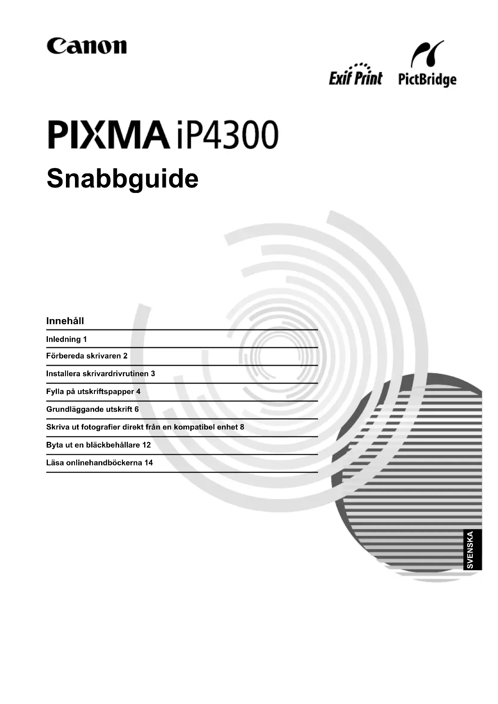-programmet för kontorsutrustning är ett globalt program som verkar för energibesparing vid användning av datorer och annan kontorsutrustning. Programmet stöder utvecklingen och spridningen av produkter med funktioner som effektivt reducerar energiförbrukningen. Det är ett öppet system där företag kan delta frivilligt. De produkter som omfattas av programmet är kontorsutrustning, t.ex. datorer, bildskärmar, skrivare, faxar och kopiatorer. Deras standarder och logotyper är enhetliga för de länder som deltar. Krav på spänningsmatning Använd aldrig någon annan nätspänning än den som används i inköpslandet. Användning av felaktig spänning kan orsaka brand eller elektriska stötar. Korrekta nätspänningar och frekvenser är följande: Växelström 100-240 V, 50/60 Hz Om förbrukningsvaror Förbrukningsvaror (bläckbehållare/FINE-patroner (FINE Cartridges)) är tillgängliga i 5 år efter att produktionen upphört. Säkerhetsföreskrifter Varning! z Sätt aldrig i nätkabeln i eluttaget eller dra ur den med våta händer. z Nätkabeln får inte skadas, ändras, sträckas, böjas eller vridas för kraftigt. Ställ inga tunga föremål på nätkabeln. z Använd aldrig någon annan typ av strömkälla än den som är standard i det land där skrivaren köpts. Användning av felaktig spänning och frekvens kan orsaka brand eller elektriska stötar.z Sätt alltid i kontakten ordentligt i eluttaget. Var försiktig! z Av säkerhetsskäl bör du förvara bläckbehållarna utom räckhåll för barn. z Se till att inte tappa eller skaka bläckbehållarna, eftersom det kan leda till läckage som kan ge fläckar på kläder och händer. Läs även säkerhetsföreskrifterna i onlinehandboken Användarhandbok. Observera varningar och försiktighetsåtgärder så att du undviker personskada eller skador på skrivaren. Modellnummer: K10284 (iP4300)1Inledning SVENSKA Inledning Tack för att du valde en Canon Inkjet-skrivare. I den här Snabbguiden används följande symboler för att beteckna viktig information. Följ alltid de anvisningar som betecknas med dessa symboler. Varning! Om anvisningarna inte följs och utrustningen används felaktigt kan det leda till dödsfall eller allvarliga personskador. Anvisningarna måste följas för säker användning. Var försiktig! Om anvisningarna inte följs och utrustningen används felaktigt kan det leda till personskada eller till skada på utrustningen. Anvisningarna måste följas för säker användning. Viktigt! Anvisningar som måste följas för att garantera säker användning. Meddelanden om varumärken z ”Windows” och ”Internet Explorer” är varumärken som tillhör Microsoft Corporation, registrerade i USA och andra länder. z ”Macintosh” och ”Mac” är varumärken som tillhör Apple Computer Inc. och som är registrerade i USA och andra länder. z ”Adobe” och ”Adobe RGB (1998)” är antingen registrerade varumärken eller varumärken som tillhör Adobe Systems Incorporated i USA och/eller andra länder. Copyright ©2006 CANON INC. Med ensamrätt. Ingen del av denna publikation får vidarebefordras eller kopieras på något sätt utan skriftligt medgivande.2 Förbereda skrivaren SVENSKA Förbereda skrivaren Läs först igenom installationsbladet om hur du ställer in skrivaren och förbereder den för användning. 1 Starta skrivaren. 2 Installera skrivhuvudet. 3 Sätt i bläckbehållarna. 4 Fyll på utskriftspapper. I följande process ska du utföra en justering av skrivhuvudet och du måste fylla på ett vanligt papper i A4- eller Letter-format i den automatiska arkmataren. Var försiktig! Var noga med att ta bort all tejp innan du sätter på skrivaren. Obs! Tejpens placering kan variera. Var försiktig! Rör inte vid andra delar än låsspaken inuti skrivaren. Viktigt! Om den övre luckan är öppen i mer än 10 minuter flyttas skrivhuvudshållaren till höger sida. Då stänger du den övre luckan och öppnar den igen. Obs! z Det kan eventuellt finns genomskinligt eller ljusblått bläck inuti den påse där skrivhuvudet ligger, eller inuti skyddslocket – detta påverkar inte utskriftskvaliteten. Var noga med att du inte får bläck på dig när du hanterar dessa föremål.z Sätt inte tillbaka skyddslocket när du har tagit bort det. Viktigt! z Kontrollera att alla bläckbehållare sitter på rätt plats och överensstämmer med etiketten. Skrivaren kan inte användas om inte alla bläckbehållare sitter på plats. z När du satt i bläckbehållarna kommer [POWER lamp] (KONTROLLAMPA för nätström) att blinka grön. Innan du fortsätter väntar du ungefär 2 minuter tills [POWER lamp] (KONTROLLAMPA för nätström) slutar blinka och lyser med fast grönt sken och skrivaren har slutat ge ifrån sig ljud. Obs! z Var noga med att ta bort den genomskinliga plastfilmen från bläckbehållaren precis i den ordning som anges i steg 3 på installationsbladet. z Tryck inte på bläckbehållarnas sidor, eftersom det kan leda till läckage som kan ge fläckar på dina kläder och händer.z Sätt aldrig tillbaka skyddslocket om du har tagit bort det. z [ALARM lamp] (ALARMINDIKATOR) på skrivaren blinkar fortfarande orange om en bläckbehållare inte installerats på rätt sätt. Öppna den övre luckan och kontrollera att bläckbehållarnas placering stämmer överens med etiketterna. Viktigt! z När du fyller på papper i den automatiska arkmataren ska du kontrollera att lampan för den automatiska arkmataren är tänd. z Lägg alltid i papperet på höjden. Om du lägger i papperen liggande kan papperet fastna.3Installera skrivardrivrutinen SVENSKA Installera skrivardrivrutinen Information som gäller för Windows