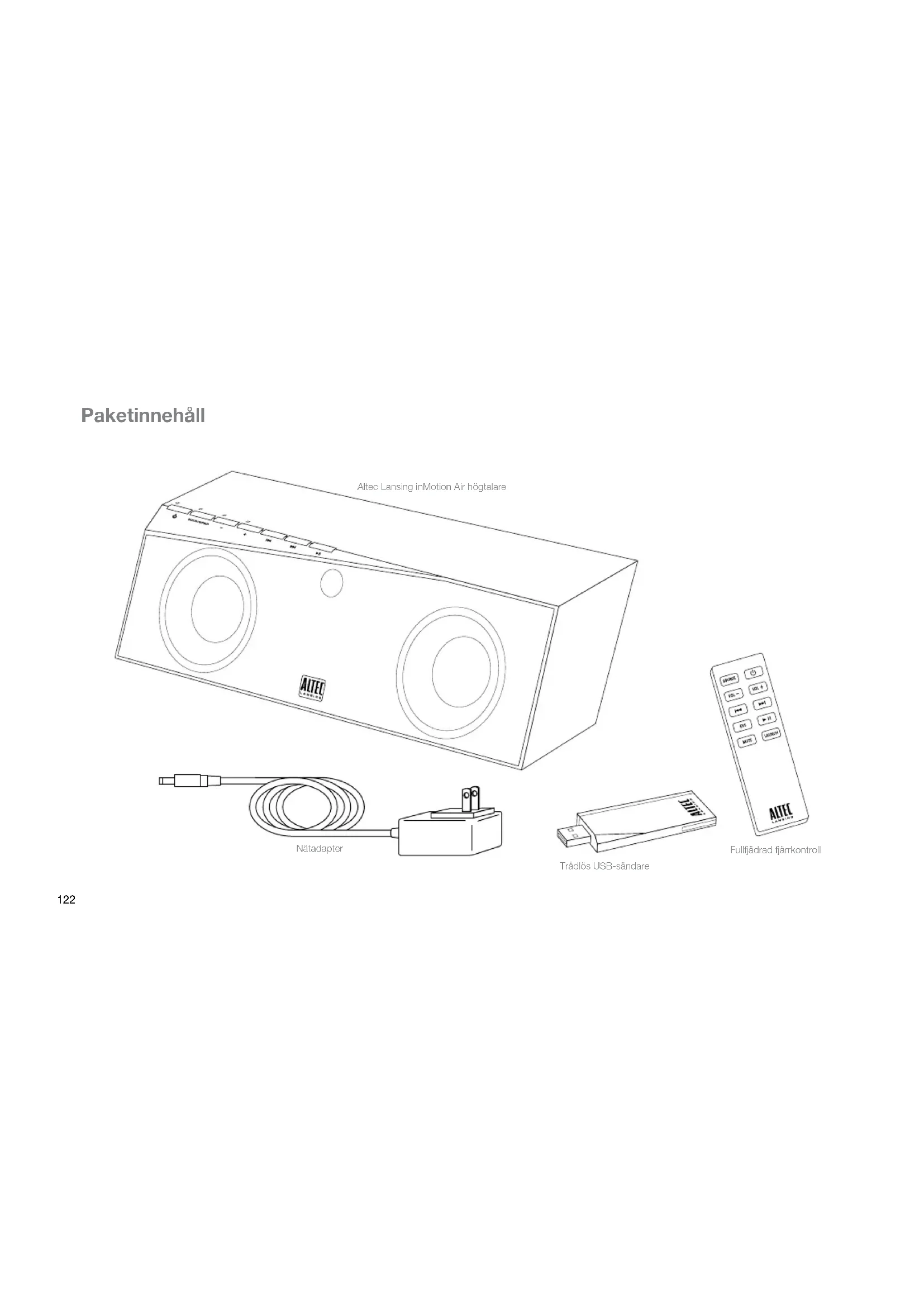 Välkommen Tack för att du köpt högtalaren Altec Lansing inMotionAir. inMotionAir är en Bluetooth-högtalare som är utformad att följa med vart du än går och ta emot direktuppspelande ljud från din dator eller Bluetooth-aktiverade bärbar ljudenhet. Inga kablar. Inga dockningar. Inga komplikationer. Endast total trådlös frihet. Läs noga igenom denna bruksanvisning för instruktioner om hur du ställer in och använder din inMotionAir högtalare. Före installation och användning av din inMotionAir högtalare, läs produktens viktiga säkerhetsinformation. Få hjälp Svaren på de flesta installations- och prestandafrågor kan hittas i avsnitt Felsökning i denna guide. Du kan även gå till vår webbplats www.alteclansing.com och läsa vanliga frågor och svar (FAQ) i sektionen för kundsupport. Om du bor i Nordamerika och fortfarande inte hittar den information du behöver, ring vår kundtjänst för hjälp innan du återlämnar produkten till din återförsäljare. Tel: 800-258-3288 (Utan kostnad i USA och Kanada) E-post: csupport@alteclansing.com Om du bor utanför Nordamerika, besök vår webbplats på www.alteclansing.com och ange din region för att hitta ditt lands återförsäljare. För den mest aktuella informationen, se till att besöka vår webbplats på www.alteclansing.com. Internationell distribution Internationella kunder: För information om distribution av Altec Lansing- produkter i ditt land, besök www.alteclansing.com och klicka på din region. Registrera din produkt Besök www.alteclansing.com för att registrera din produkt online, så vi kan ge dig bästa möjliga service och tekniska support.120 VARNING För att förhindra elektriska stötar, använd inte denna (polariserade) kontakt med en förlängningssladd, uttag eller andra utlopp om inte stiften kan införas fullständigt för att förhindra att stiften exponeras. VARNING För att minska risken för brand eller elektriska stötar, utsätt inte apparaten för regn eller fukt.