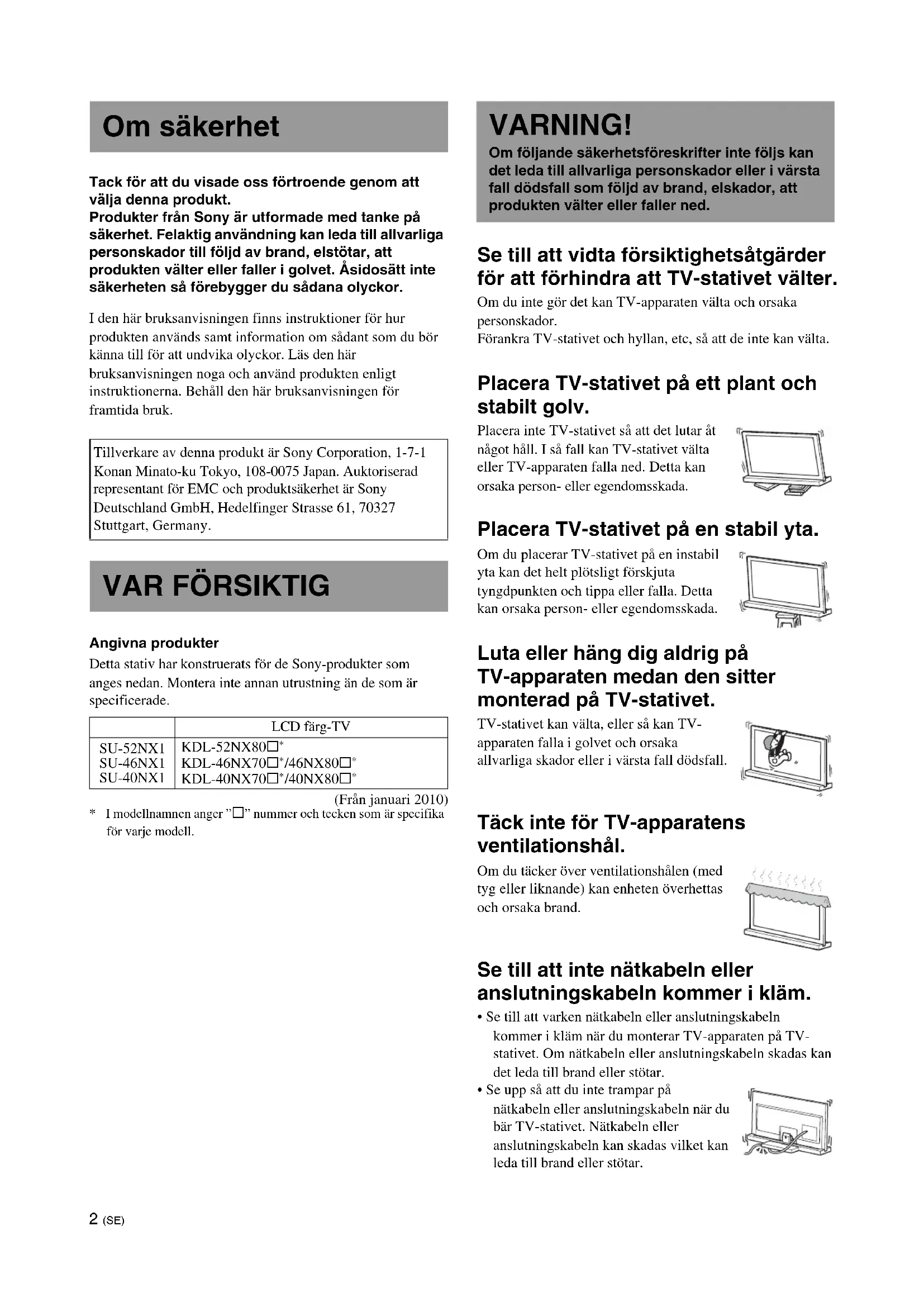 - I modellnamnen anger ”s” nummer och tecken som är specifika för varje modell. Se till att vidta försiktighetsåtgärder för att förhindra att TV-stativet välter. Om du inte gör det kan TV-apparaten välta och orsaka personskador. Förankra TV-stativet och hyllan, etc, så att de inte kan välta. Placera TV-stativet på ett plant och stabilt golv. Placera inte TV-stativet så att det lutar åt något håll. I så fall kan TV-stativet välta eller TV-apparaten falla ned. Detta kan orsaka person- eller egendomsskada. Placera TV-stativet på en stabil yta. Om du placerar TV-stativet på en instabil yta kan det helt plötsligt förskjuta tyngdpunkten och tippa eller falla. Detta kan orsaka person- eller egendomsskada. Luta eller häng dig aldrig på TV-apparaten medan den sitter monterad på TV-stativet. TV-stativet kan välta, eller så kan TV- apparaten falla i golvet och orsaka allvarliga skador eller i värsta fall dödsfall. Täck inte för TV-apparatens ventilationshål. Om du täcker över ventilationshålen (med tyg eller liknande) kan enheten överhettas och orsaka brand. Se till att inte nätkabeln eller anslutningskabeln kommer i kläm.