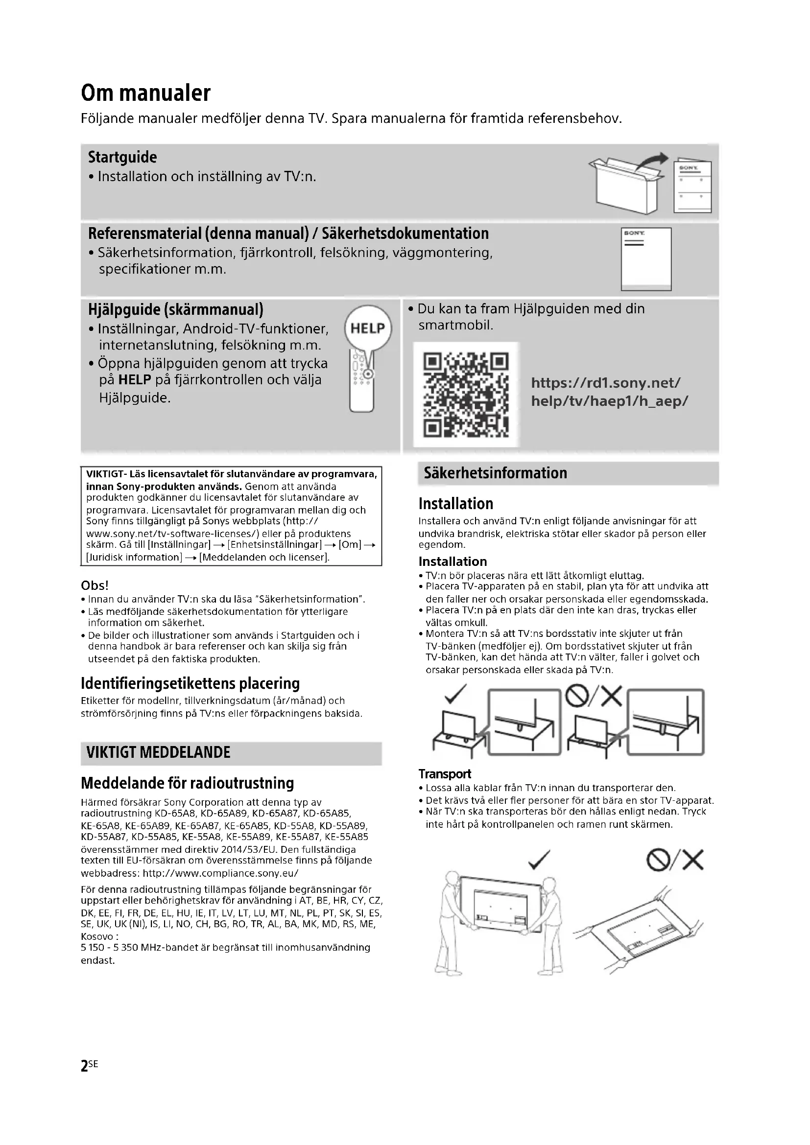 - Innan du använder TV:n ska du läsa “Säkerhetsinformation”.• Läs medföljande säkerhetsdokumentation för ytterligare information om säkerhet.• De bilder och illustrationer som används i Startguiden och i denna handbok är bara referenser och kan skilja sig från utseendet på den faktiska produkten. Identifieringsetikettens placering Etiketter för modellnr, tillverkningsdatum (år/månad) och strömförsörjning finns på TV:ns eller förpackningens baksida. VIKTIGT MEDDELANDE Meddelande för radioutrustning Härmed försäkrar Sony Corporation att denna typ av radioutrustning KD-65A8, KD-65A89, KD-65A87, KD-65A85, KE-65A8, KE-65A89, KE-65A87, KE-65A85, KD-55A8, KD-55A89, KD-55A87, KD-55A85, KE-55A8, KE-55A89, KE-55A87, KE-55A85 överensstämmer med direktiv 2014/53/EU. Den fullständiga texten till EU-försäkran om överensstämmelse finns på följande webbadress: http://www.compliance.sony.eu/För denna radioutrustning tillämpas följande begränsningar för uppstart eller behörighetskrav för användning i AT, BE, HR, CY, CZ, DK, EE, FI, FR, DE, EL, HU, IE, IT, LV, LT, LU, MT, NL, PL, PT, SK, SI, ES, SE, UK, UK (NI), IS, LI, NO, CH, BG, RO, TR, AL, BA, MK, MD, RS, ME, Kosovo :5 150 - 5 350 MHz-bandet är begränsat till inomhusanvändning endast. Säkerhetsinformation Installation Installera och använd TV:n enligt följande anvisningar för att undvika brandrisk, elektriska stötar eller skador på person eller egendom. Installation