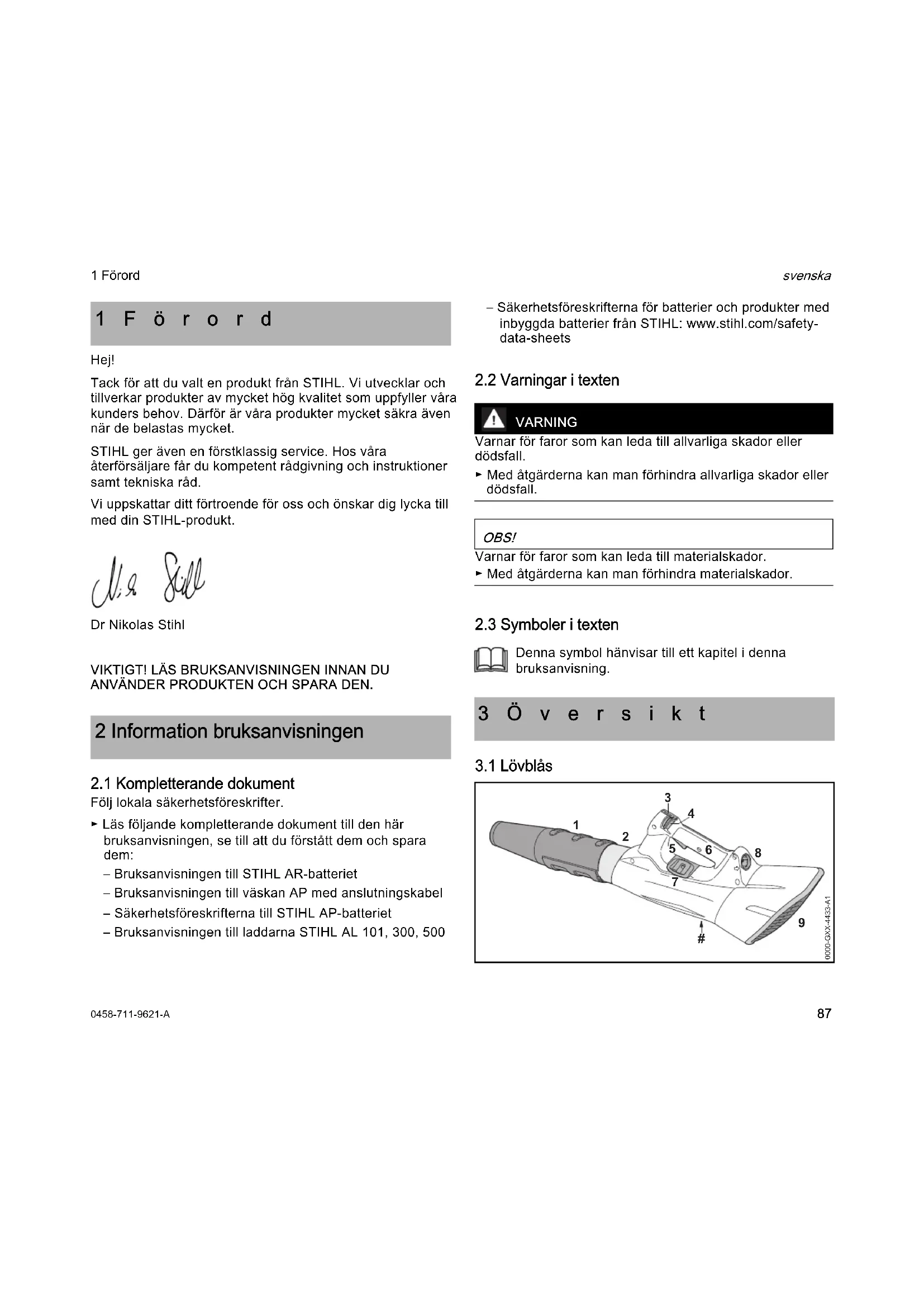 svenska 1 Förord Hej! Tack för att du valt en produkt från STIHL. Vi utvecklar och tillverkar produkter av mycket hög kvalitet som uppfyller våra kunders behov. Därför är våra produkter mycket säkra även när de belastas mycket. STIHL ger även en förstklassig service. Hos våra återförsäljare får du kompetent rådgivning och instruktioner samt tekniska råd. Vi uppskattar ditt förtroende för oss och önskar dig lycka till med din STIHL-produkt. Dr Nikolas Stihl
