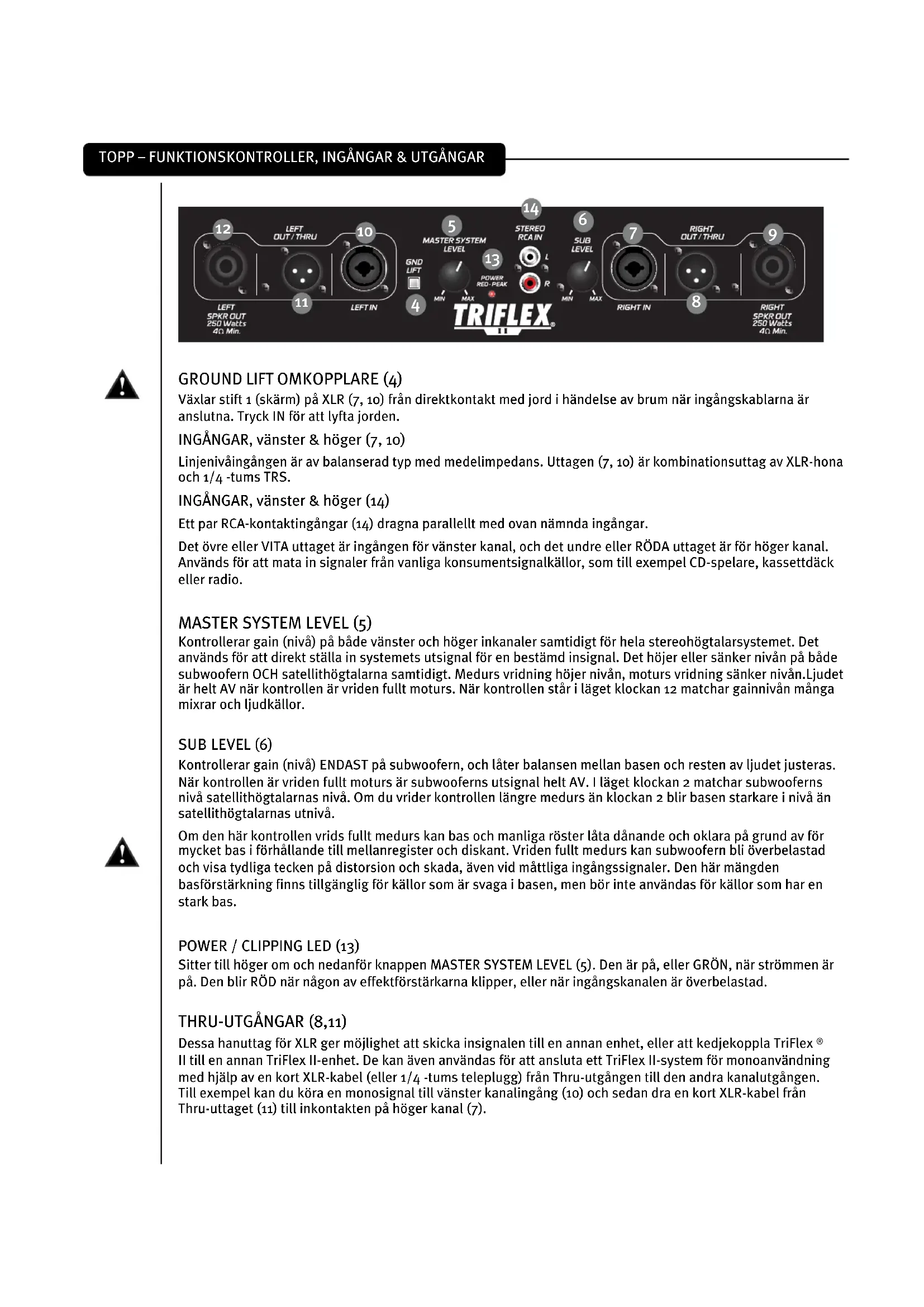 (Inga mikrofoningångar, bara musik ffrån signalkällor.) TriFlex II ingång/utgångs panel Mixer Ingångar Utgångar TriFlex II satellit högtalare TriFlex II satellit högtalare Högtalarkablar, 4 stift vridlåsn- ing till 4 stift vridlåsning MONOFONISK UPPKOPPLING XLR kabel XLR kabel TriFlex II ingång/utgångs panel Mixer Ingångar Utgångar TriFlex II satellit högtalare TriFlex II satellit högtalare Högtalarkablar, 4 stift vridlåsn- ing till 4 stift vridlåsning Högtalarkablar, 4 stift vridlåsn- ing till 4 stift vridlåsning Högtalarkablar, 4 stift vridlåsn- ing till 4 stift vridlåsning KEDJEKOPPLAD ANVÄNDNING AV FLERA TRIFLEX II-SYSTEM XLR kablar TriFlex II ingång/utgångspanel TriFlex II Satellit högtalare TriFlex II satellit högtalare Högtalarkablar, 4 stift vridlåsn- ing till 4 stift vridlåsning13 CD-spelare/MP3-spelare TriFlex II ingång/utgångspanel Mixer Dynamisk mikrofon (inga elektret mikrofoner) Klaviatur Ingångar Utgångar Gitarr 1/4’’ tums telepluggkablar XLR-kablar XLR kablar RCA kontaktkablar TriFlex II satellit högtalare TriFlex II satellit högtalare Högtalarkablar, 4 stift vridlåsning till 4 stift vridlåsning TriFlex II ingång/utgångspanel TriFlex II satellit högtalare TriFlex II satellit högtalare Högtalarkablar, 4 stift vridlåsn- ing till 4 stift vridlåsning CD-spelare/MP3-spelare RCA-kontakt kablar TYPISKT STEREOUPPKOPPLINGSDIAGRAM Till RCA- kontakt- ingång på TriFlex II