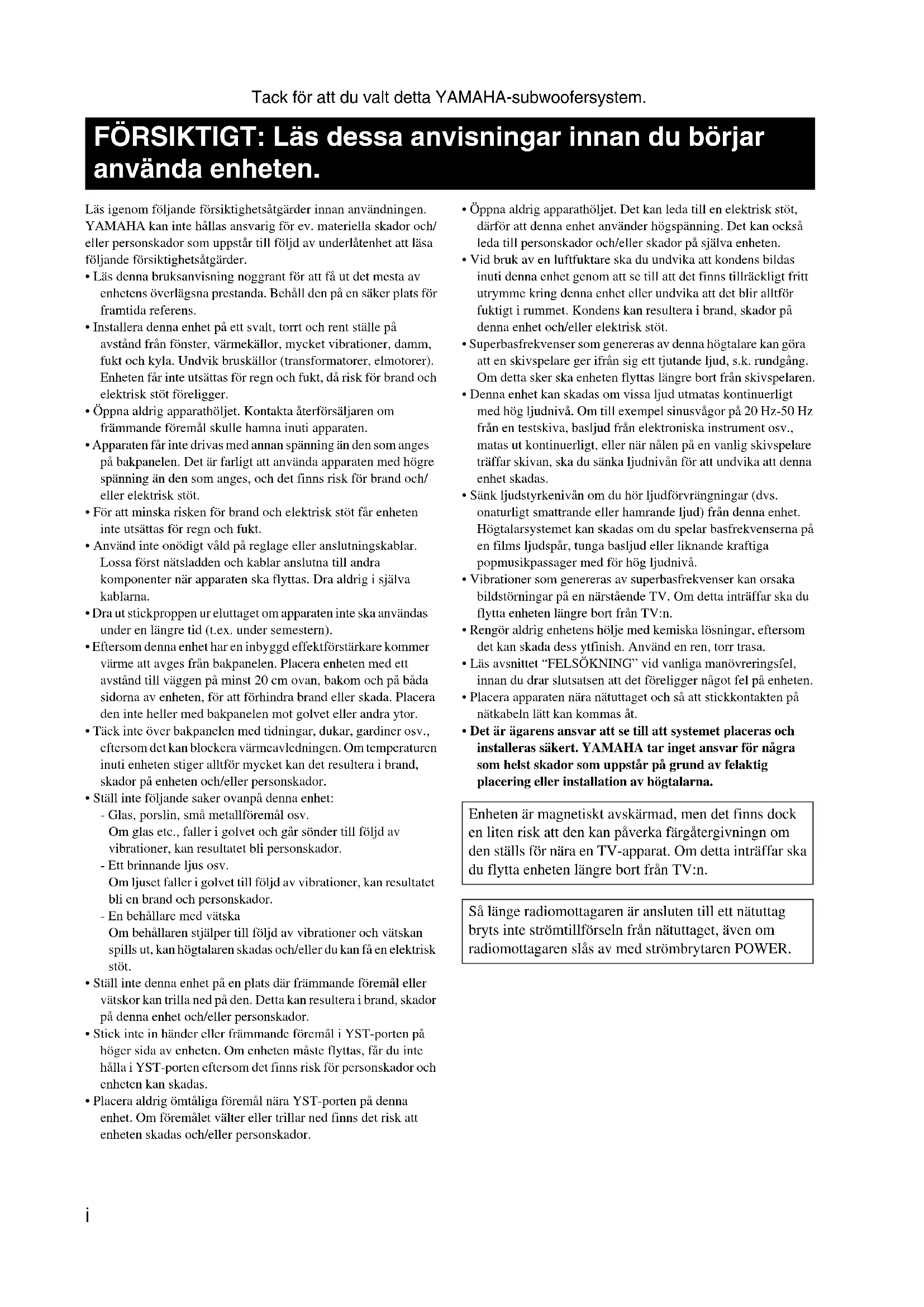 - Det är ägarens ansvar att se till att systemet placeras och installeras säkert. YAMAHA tar inget ansvar för några som helst skador som uppstår på grund av felaktig placering eller installation av högtalarna. FÖRSIKTIGT: Läs dessa anvisningar innan du börjar använda enheten. Enheten är magnetiskt avskärmad, men det finns dock en liten risk att den kan påverka färgåtergivningn om den ställs för nära en TV-apparat. Om detta inträffar ska du flytta enheten längre bort från TV:n. Så länge radiomottagaren är ansluten till ett nätuttag bryts inte strömtillförseln från nätuttaget, även om radiomottagaren slås av med strömbrytaren POWER.1 Svenska EGENSKAPER .............................................................. 1