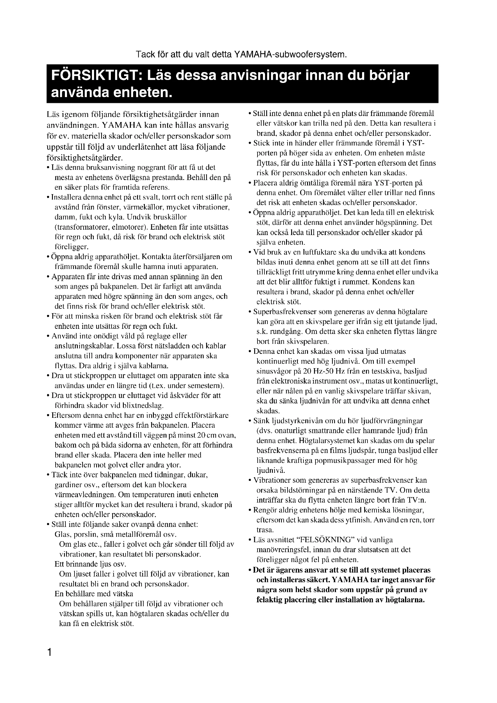 - Det är ägarens ansvar att se till att systemet placeras och installeras säkert. YAMAHA tar inget ansvar för några som helst skador som uppstår på grund av felaktig placering eller installation av högtalarna. FÖRSIKTIGT: Läs dessa anvisningar innan du börjar använda enheten.