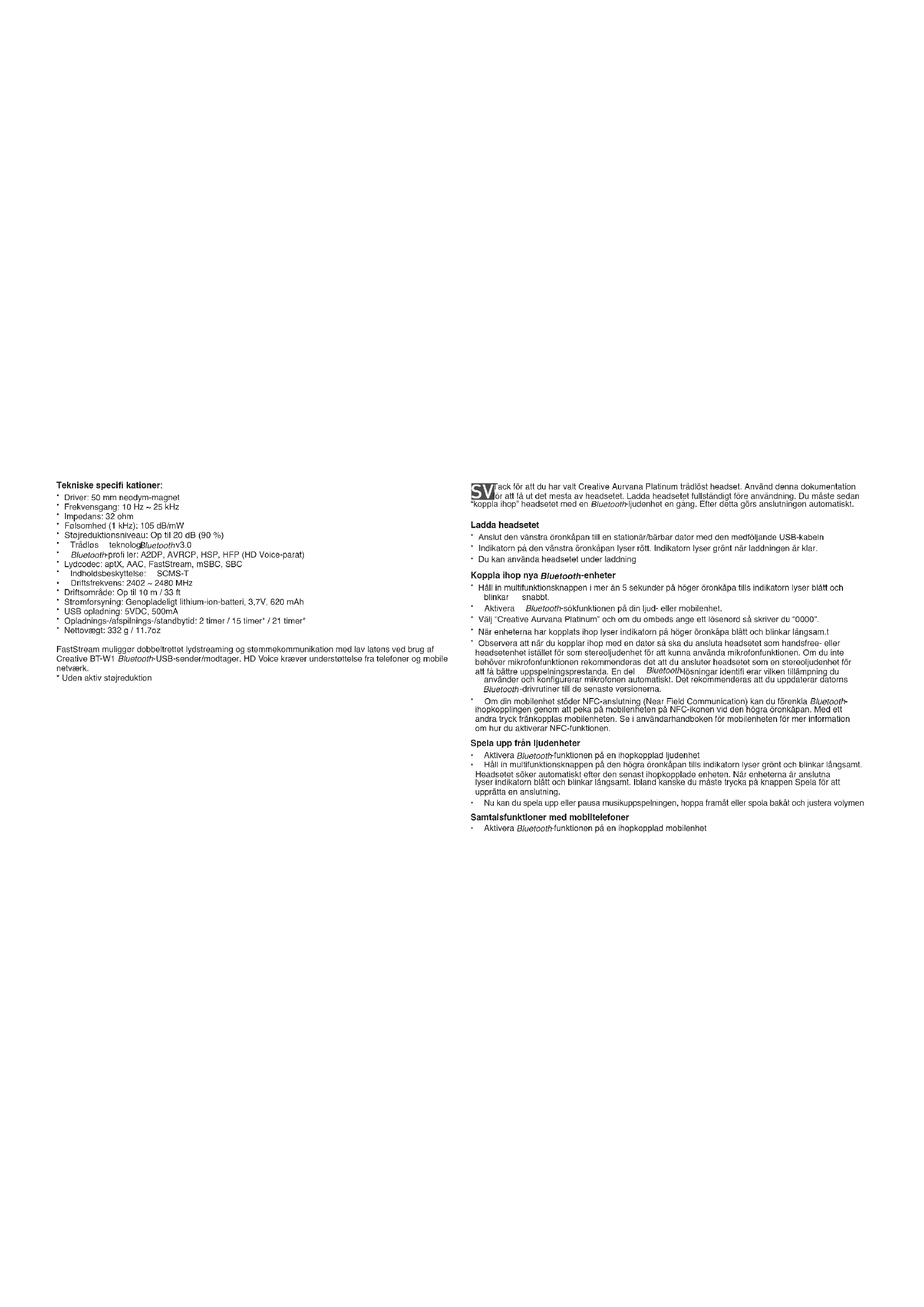 Håll in multifunktionsknappen i mer än 5 sekunder på höger öronkåpa tills indikatorn lyser blått och blinkar snabbt. Aktivera Bluetooth-sökfunktionen på din ljud- eller mobilenhet. Välj “Creative Aurvana Platinum” och om du ombeds ange ett lösenord så skriver du “0000”. När enheterna har kopplats ihop lyser indikatorn på höger öronkåpa blått och blinkar långsam.t Observera att när du kopplar ihop med en dator så ska du ansluta headsetet som handsfree- eller headsetenhet istället för som stereoljudenhet för att kunna använda mikrofonfunktionen. Om du inte behöver mikrofonfunktionen rekommenderas det att du ansluter headsetet som en stereoljudenhet för att få bättre uppspelningsprestanda. En del Bluetooth -lösningar identifi erar vilken tillämpning du använder och konfi gurerar mikrofonen automatiskt. Det rekommenderas att du uppdaterar datorns Bluetooth -drivrutiner till de senaste versionerna.