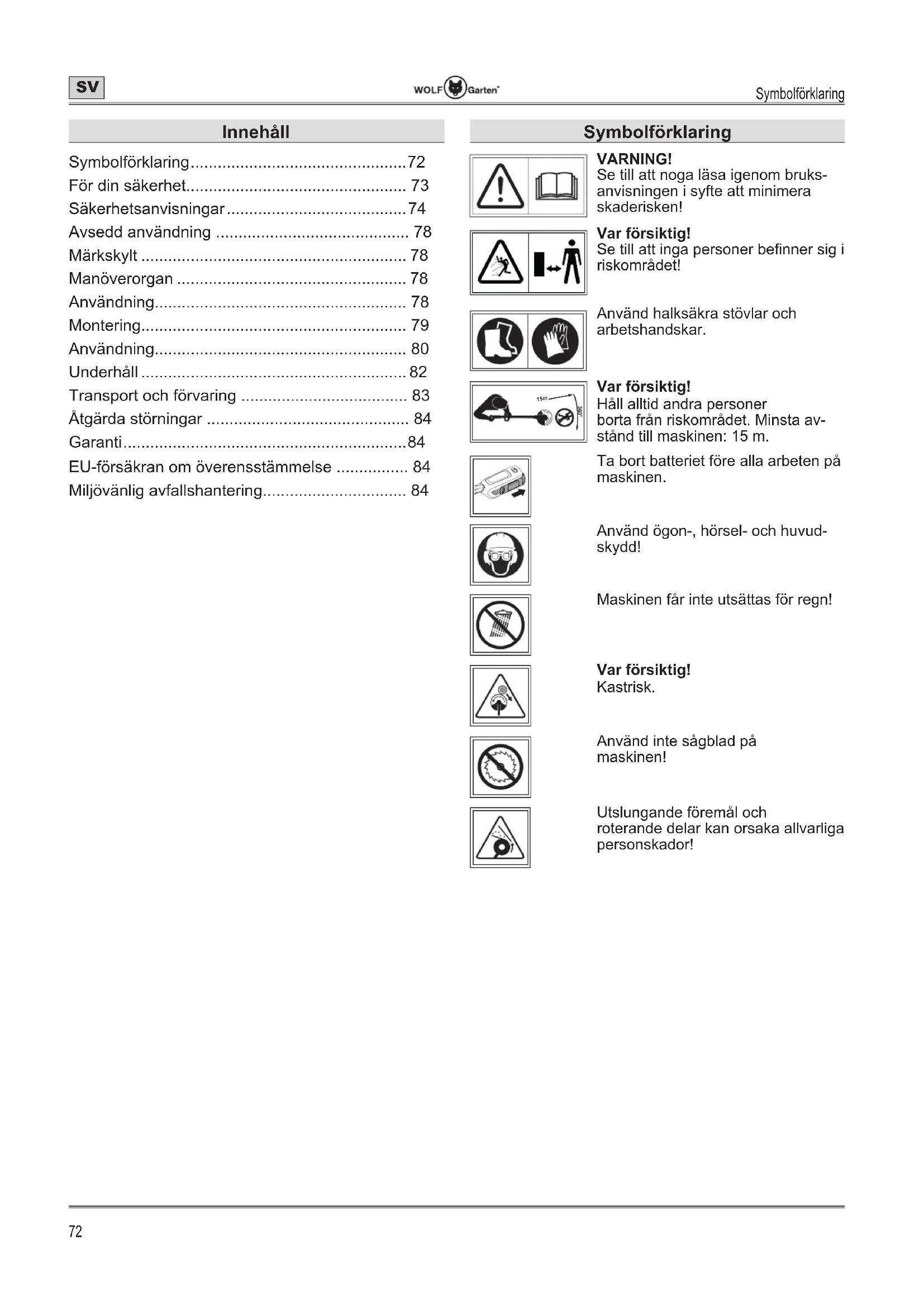 - 15m Var försiktig! Håll alltid andra personer borta från riskområdet. Minsta av- stånd till maskinen: 15 m. Ta bort batteriet före alla arbeten på maskinen. Använd ögon-, hörsel- och huvud- skydd! Maskinen får inte utsättas för regn! Var försiktig! Kastrisk. Använd inte sågblad på maskinen! Utslungande föremål och roterande delar kan orsaka allvarliga personskador! Innehåll Symbolförklaring p. 72