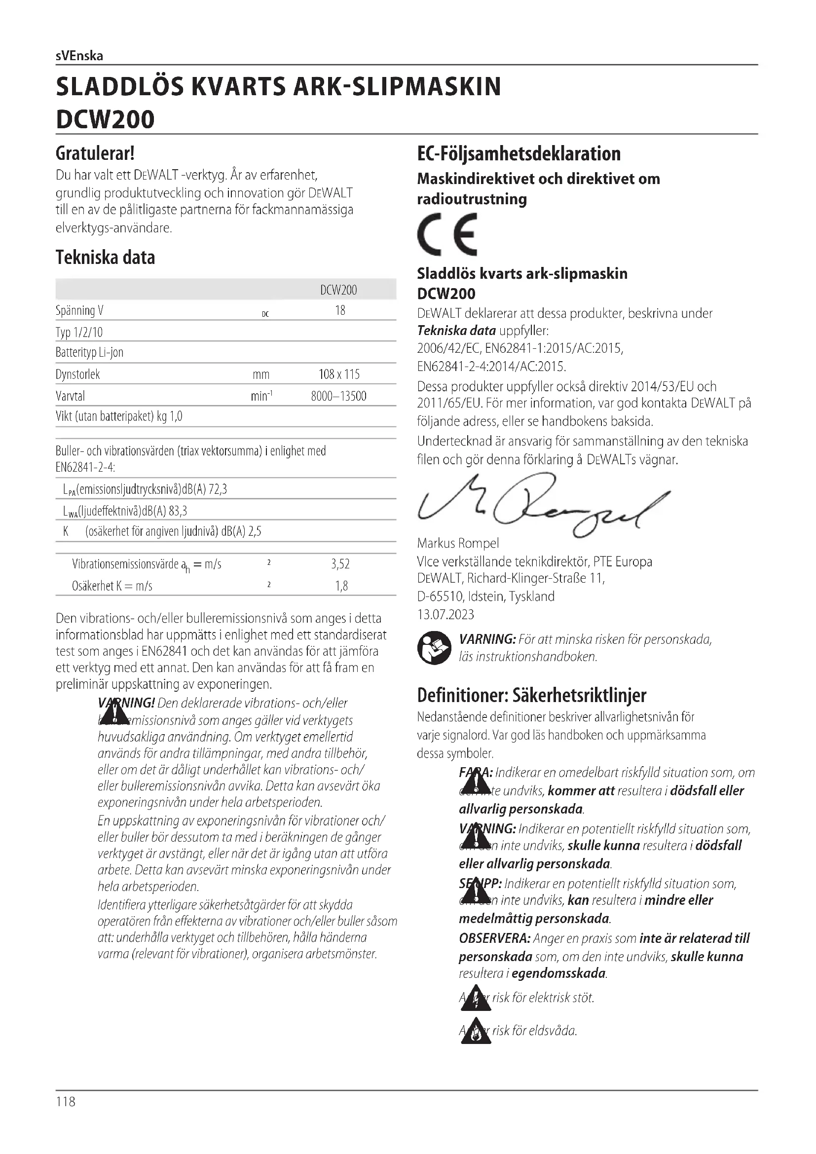 VAROITUS: Älä koskaan puhdista muita kuin metallipintoja liuottimien tai muiden voimakkaiden kemikaalien avulla. Nämä kemikaalit voivat heikentää näissä osissa käytettyjä materiaaleja. Käytä vain vedellä ja miedolla saippualla kostutettua liinaa. Älä päästä mitään nestettä työkalun sisään. Älä upota mitään työkalun osaanesteeseen. Tuuletusaukot voidaan puhdistaa kuivalla, pehmeällä ei-metallisella harjalla ja/tai sopivalla pölynimurilla. Älä käytä vettä tai puhdistusaineita. Käytä hyväksyttyjä suojalaseja ja hyväksyttyähengityssuojaa.118 sVEnska VARNING: För att minska risken för personskada, läsinstruktionshandboken. Definitioner: Säkerhetsriktlinjer Nedanstående definitioner beskriver allvarlighetsnivån för varje signalord. Var god läs handboken och uppmärksamma dessasymboler. FARA: Indikerar en omedelbart riskfylld situation som, om den inte undviks, kommer att resultera i dödsfall eller allvarligpersonskada. VARNING: Indikerar en potentiellt riskfylld situation som, om den inte undviks, skulle kunna resultera i dödsfall eller allvarligpersonskada. SE UPP: Indikerar en potentiellt riskfylld situation som, om den inte undviks, kan resultera i mindre eller medelmåttigpersonskada. OBSERVERA: Anger en praxis som inte är relaterad till personskada som, om den inte undviks, skulle kunna resultera iegendomsskada. Anger risk för elektriskstöt. Anger risk föreldsvåda. EC‑Följsamhetsdeklaration Maskindirektivet och direktivet om radioutrustning Sladdlös kvarts ark-slipmaskin DCW200 DeWALT deklarerar att dessa produkter, beskrivna under Tekniska data uppfyller: 2006/42/EC, EN62841-1:2015/AC:2015, EN62841-2-4:2014/AC:2015.Dessa produkter uppfyller också direktiv 2014/53/EU och 2011/65/EU. För mer information, var god kontakta DeWALT på följande adress, eller se handbokensbaksida.Undertecknad är ansvarig för sammanställning av den tekniska filen och gör denna förklaring å DeWALTsvägnar.Markus Rompel VIce verkställande teknikdirektör, PTE Europa DeWALT, Richard-Klinger-Straße 11, D-65510, Idstein, Tyskland 13.07.2023Den vibrations- och/eller bulleremissionsnivå som anges i detta informationsblad har uppmätts i enlighet med ett standardiserat test som anges i 62841 och det kan användas för att jämföra ett verktyg med ett annat. Den kan användas för att få fram en preliminär uppskattning avexponeringen. VARNING! Den deklarerade vibrations- och/eller bulleremissionsnivå som anges gäller vid verktygets huvudsakliga användning. Om verktyget emellertid används för andra tillämpningar, med andra tillbehör, eller om det är dåligt underhållet kan vibrations- och/eller bulleremissionsnivån avvika. Detta kan avsevärt öka exponeringsnivån under helaarbetsperioden.En uppskattning av exponeringsnivån för vibrationer och/eller buller bör dessutom ta med i beräkningen de gånger verktyget är avstängt, eller när det är igång utan att utföra arbete. Detta kan avsevärt minska exponeringsnivån under helaarbetsperioden.Identifiera ytterligare säkerhetsåtgärder för att skydda operatören från effekterna av vibrationer och/eller buller såsom att: underhålla verktyget och tillbehören, hålla händerna varma (relevant för vibrationer), organiseraarbetsmönster.DCW200Spänning V