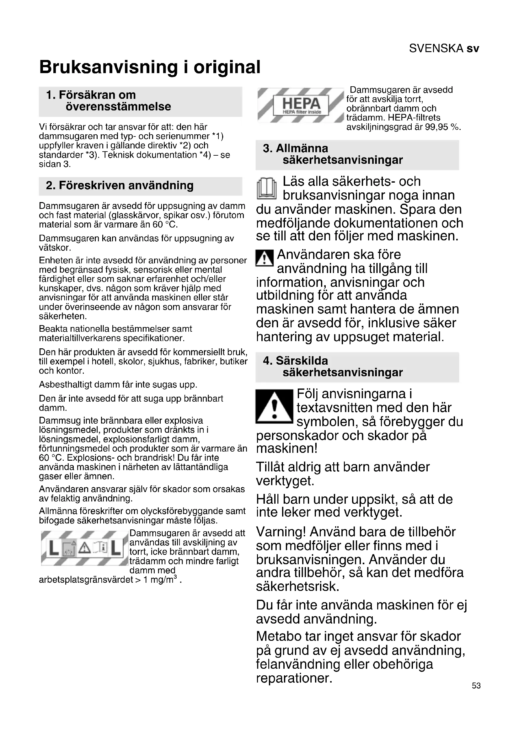 Bruksanvisning i original Vi försäkrar och tar ansvar för att: den här dammsugaren med typ- och serienummer *1) uppfyller kraven i gällande direktiv *2) och standarder *3). Teknisk dokumentation *4) – se sidan 3. Dammsugaren är avsedd för uppsugning av damm och fast material (glasskärvor, spikar osv.) förutom material som är varmare än 60 °C. Dammsugaren kan användas för uppsugning av vätskor. Enheten är inte avsedd för användning av personer med begränsad fysisk, sensorisk eller mental färdighet eller som saknar erfarenhet och/eller kunskaper, dvs. någon som kräver hjälp med anvisningar för att använda maskinen eller står under överinseende av någon som ansvarar för säkerheten. Beakta nationella bestämmelser samt materialtillverkarens specifikationer. Den här produkten är avsedd för kommersiellt bruk, till exempel i hotell, skolor, sjukhus, fabriker, butiker och kontor. Asbesthaltigt damm får inte sugas upp. Den är inte avsedd för att suga upp brännbart damm. Dammsug inte brännbara eller explosiva lösningsmedel, produkter som dränkts in i lösningsmedel, explosionsfarligt damm, förtunningsmedel och produkter som är varmare än 60 °C. Explosions- och brandrisk! Du får inte använda maskinen i närheten av lättantändliga gaser eller ämnen. Användaren ansvarar själv för skador som orsakas av felaktig användning. Allmänna föreskrifter om olycksförebyggande samt bifogade säkerhetsanvisningar måste följas. Dammsugaren är avsedd att användas till avskiljning av torrt, icke brännbart damm, trädamm och mindre farligt damm med arbetsplatsgränsvärdet > 1 mg/m³ . Dammsugaren är avsedd för att avskilja torrt, obrännbart damm och trädamm. HEPA-filtrets avskiljningsgrad är 99,95 %. Läs alla säkerhets- och bruksanvisningar noga innan du använder maskinen. Spara den medföljande dokumentationen och se till att den följer med maskinen. Användaren ska före användning ha tillgång till information, anvisningar och utbildning för att använda maskinen samt hantera de ämnen den är avsedd för, inklusive säker hantering av uppsuget material. Följ anvisningarna i textavsnitten med den här symbolen, så förebygger du personskador och skador på maskinen! Tillåt aldrig att barn använder verktyget. Håll barn under uppsikt, så att de inte leker med verktyget. Varning! Använd bara de tillbehör som medföljer eller finns med i bruksanvisningen. Använder du andra tillbehör, så kan det medföra säkerhetsrisk. Du får inte använda maskinen för ej avsedd användning. Metabo tar inget ansvar för skador på grund av ej avsedd användning, felanvändning eller obehöriga reparationer.
