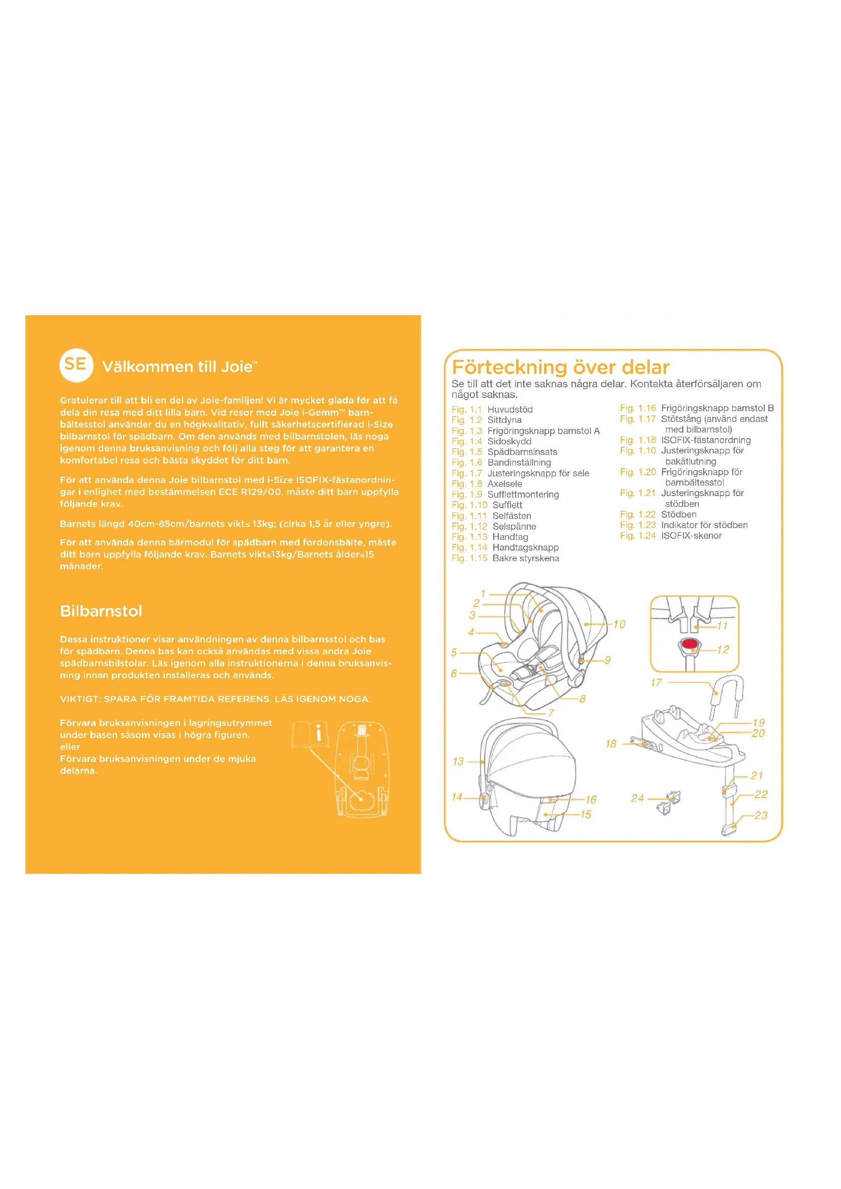 Gratulerar till att bli en del av Joie-familjen! Vi är mycket glada för att få dela din resa med ditt lilla barn. Vid resor med Joie i-Gemm™ barn-bältesstol använder du en högkvalitativ, fullt säkerhetscertifierad i-Size bilbarnstol för spädbarn. Om den används med bilbarnstolen, läs noga igenom denna bruksanvisning och följ alla steg för att garantera en komfortabel resa och bästa skyddet för ditt barn.För att använda denna Joie bilbarnstol med i-Size ISOFIX-fästanordnin-gar i enlighet med bestämmelsen ECE R129/00, måste ditt barn uppfylla följande krav.Barnets längd 40cm-85cm/barnets vikt≤ 13kg; (cirka 1,5 år eller yngre).För att använda denna bärmodul för spädbarn med fordonsbälte, måste ditt barn uppfylla följande krav. Barnets vikt≤13kg/Barnets ålder≤15 månader. Bilbarnstol Dessa instruktioner visar användningen av denna bilbarnsstol och bas för spädbarn. Denna bas kan också användas med vissa andra Joie spädbarnsbilstolar. Läs igenom alla instruktionerna i denna bruksanvis-ning innan produkten installeras och används.VIKTIGT: SPARA FÖR FRAMTIDA REFERENS. LÄS IGENOM NOGA.Förvara bruksanvisningen i lagringsutrymmet under basen såsom visas i högra figuren.ellerFörvara bruksanvisningen under de mjuka delarna. Förteckning över delar Se till att det inte saknas några delar. Kontakta återförsäljaren om något saknas. Fig. 1.1 HuvudstödFig. 1.2 SittdynaFig. 1.3 Frigöringsknapp barnstol AFig. 1.4 SidoskyddFig. 1.5 SpädbarnsinsatsFig. 1.6 BandinställningFig. 1.7 Justeringsknapp för seleFig. 1.8 AxelseleFig. 1.9 SufflettmonteringFig. 1.10 SufflettFig. 1.11 SelfästenFig. 1.12 SelspänneFig. 1.13 HandtagFig. 1.14 HandtagsknappFig. 1.15 Bakre styrskenaFig. 1.16 Frigöringsknapp barnstol BFig. 1.17 Stötstång (använd endast med bilbarnstol)Fig. 1.18 ISOFIX-fästanordningFig. 1.10 Justeringsknapp för bakåtlutningFig. 1.20 Frigöringsknapp för barnbältesstolFig. 1.21 Justeringsknapp för stödbenFig. 1.22 StödbenFig. 1.23 Indikator för stödbenFig. 1.24 ISOFIX-skenor177 178 VARNING ! Kontrollera innan du köper denna bilbarnsstol att den kan installeras korrekt i ditt fordon. ! INGEN bilbarnstol kan garantera fullständigt skydd från skador vid en krock. En korrekt användning av denna bilbarnstol kommer dock att minska risken för allvarliga skador eller dödsfall för ditt barn. ! För att använda denna bilbarnstol med ISOFIX-fästanordningar i enlighet med bestämmelsen ECE R129/00, måste ditt barn uppfylla följande krav. ! Barnets längd 40cm-85cm / barnets vikt≤13kg; (Cirka 1,5 år eller yngre). ! För att använda denna bärmodul för spädbarn med fordonsbälte, måste ditt barn uppfylla följande krav. Barnets vikt≤13 kg/Barnets ålder≤15 månader. ! Eventuella remmar på bilbarnstolen bör spännas och inte vridas. ! Installera INTE denna bilbarnstol utan att följa instruktionerna i denna bruksanvisning eftersom du annars kan utsätta ditt barn för allvarliga skaderisker eller dödsfall. ! Lämna ALDRIG ditt barn utan uppsikt med denna bilbarnstol. ! Gör INGA modifieringar på denna bilbarnstol eller använd den med komponentdelar från andra tillverkare. ! Använd INTE denna bilbarnstol om den är skadad eller om delar saknas. ! Låt INTE ditt barn bära stora/för stora kläder eftersom dessa kan förhindra att barnet sitter säkert och korrekt fastspänt med axelrem
