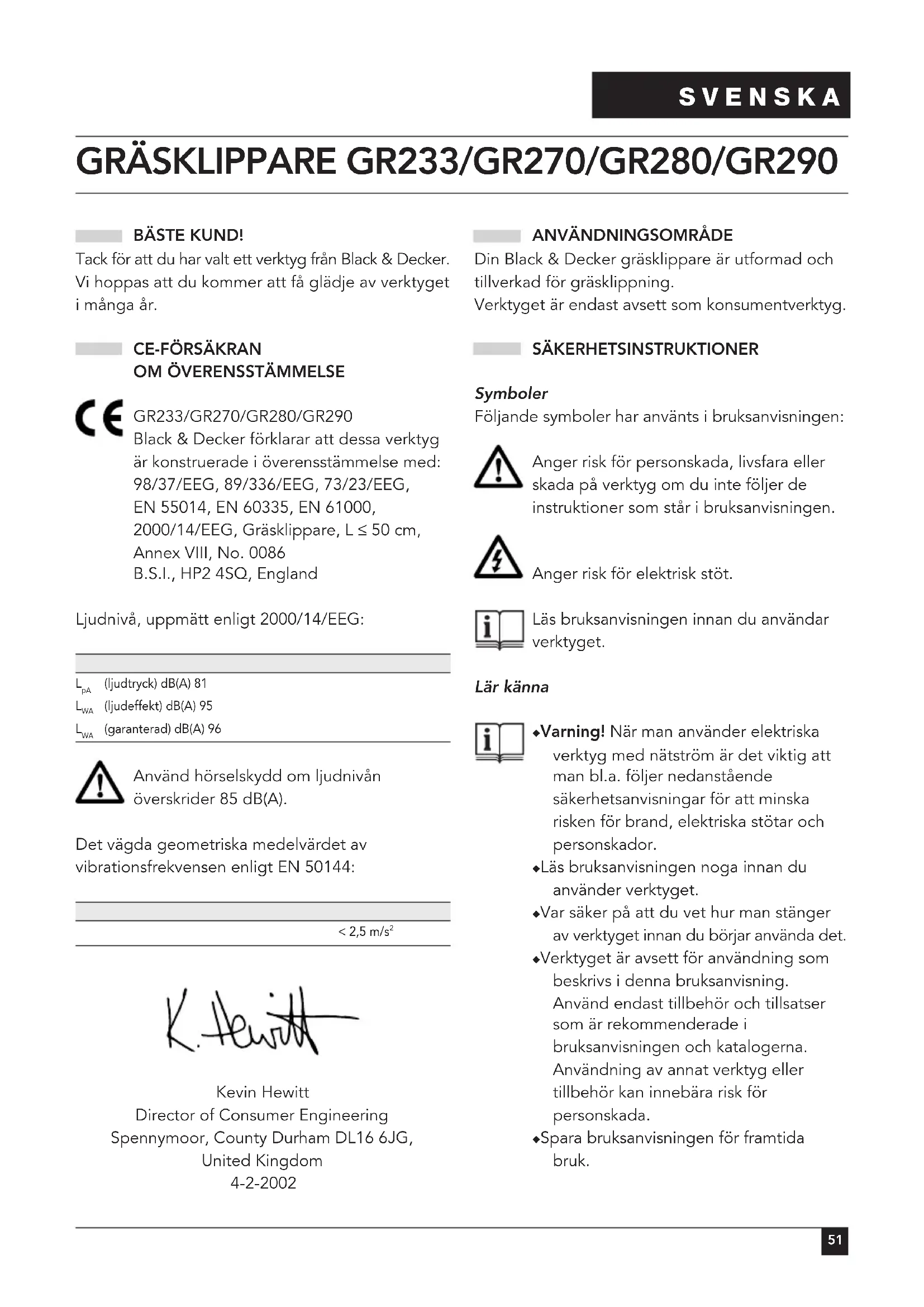 GR233/GR270/GR280/GR290 Black & Decker förklarar att dessa verktyg är konstruerade i överensstämmelse med: 98/37/EEG, 89/336/EEG, 73/23/EEG, EN 55014, EN 60335, EN 61000, 2000/14/EEG, Gräsklippare, L ≤ 50 cm, Annex VIII, No. 0086 B.S.I., HP2 4SQ, England Ljudnivå, uppmätt enligt 2000/14/EEG: