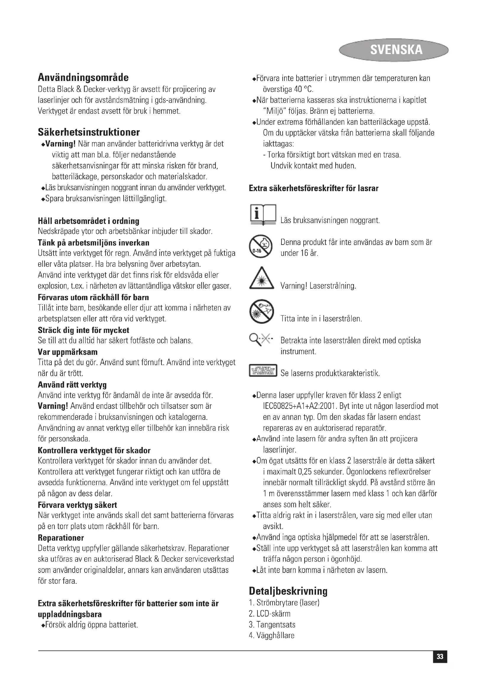 Kevin Hewitt Engenheiro Responsável Spennymoor, County Durham DL16 6JG, United Kingdom 1-2-2006 Garantia A Black & Decker confia na qualidade de seus produtos e oferece um programa de garantia excelente. Esta declaração de garantia soma-se aos seus direitos legais e não os prejudica em nenhum aspecto. A garantia será válida nos territórios dos Estados Membros da União Europeia e na Área de Livre Comércio da Europa. Caso algum produto da Black & Decker apresente avarias devido a defeitos de material, mão-de-obra ou ausência de conformidade no prazo de 24 meses a partir da data de compra, a Black & Decker garantirá a substituição das peças defeituosas, a reparação dos produtos que foram submetidos a uso adequado e remoção ou substituição dos mesmos para assegurar o mínimo de inconvenientes ao cliente a menos que: ◆ O produto tenha sido utilizado para fins comerciais, profissionais ou aluguer; ◆ O produto tenha sido submetido a uso incorrecto ou descuido; ◆ O produto tenha sofrido danos causados por objectos estranhos, substâncias ou acidentes; ◆ Tenha um histórico de reparacões efectuadas por terceiros que não sejam os agentes autorizados ou profissionais de manutenção da Black & Decker. Para activar a garantia, será necessário enviar a prova de compra ao revendedor ou agente de reparação autorizado. Para verificar a localização do agente de reparação mais próximo de si contacte o escritório local da Black & Decker no endereço indicado neste manual. Se preferir, consulte a lista de agentes autorizados da Black & Decker e os dados completos de nossos serviços de atendimento pós-venda na Internet no endereço: www.2helpU.com Visite o nosso website www.blackanddecker.com para registar o seu novo produto Black & Decker e para se manter actualizado sobre novos produtos e ofertas especiais. Estão disponíveis mais informações sobre a Black & Decker e sobre a nossa gama de produtos em www.blackanddecker.com33 SVENSKA Användningsområde Detta Black & Decker-verktyg är avsett för projicering av laserlinjer och för avståndsmätning i gds-användning. Verktyget är endast avsett för bruk i hemmet. Säkerhetsinstruktioner ◆ Varning! När man använder batteridrivna verktyg är det viktig att man bl.a. följer nedanstående säkerhetsanvisningar för att minska risken för brand, batteriläckage, personskador och materialskador. ◆ Läs bruksanvisningen noggrant innan du använder verktyget. ◆ Spara bruksanvisningen lättillgängligt. Håll arbetsområdet i ordning Nedskräpade ytor och arbetsbänkar inbjuder till skador. Tänk på arbetsmiljöns inverkan Utsätt inte verktyget för regn. Använd inte verktyget på fuktiga eller våta platser. Ha bra belysning över arbetsytan. Använd inte verktyget där det finns risk för eldsvåda eller explosion, t.ex. i närheten av lättantändliga vätskor eller gaser. Förvaras utom räckhåll för barn Tillåt inte barn, besökande eller djur att komma i närheten av arbetsplatsen eller att röra vid verktyget. Sträck dig inte för mycket Se till att du alltid har säkert fotfäste och balans. Var uppmärksam Titta på det du gör. Använd sunt förnuft. Använd inte verktyget när du är trött. Använd rätt verktyg Använd inte verktyg för ändamål de inte är avsedda för. Varning! Använd endast tillbehör och tillsatser som är rekommenderade i bruksanvisningen och katalogerna. Användning av annat verktyg eller tillbehör kan innebära risk för personskada. Kontrollera verktyget för skador Kontrollera verktyget för skador innan du använder det. Kontrollera att verktyget fungerar riktigt och kan utföra de avsedda funktionerna. Använd inte verktyget om fel uppstått på någon av dess delar. Förvara verktyg säkert När verktyget inte används skall det samt batterierna förvaras på en torr plats utom räckhåll för barn. Reparationer Detta verktyg uppfyller gällande säkerhetskrav. Reparationer ska utföras av en auktoriserad Black & Decker serviceverkstad som använder originaldelar, annars kan användaren utsättas för stor fara. Extra säkerhetsföreskrifter för batterier som inte är uppladdningsbara ◆ Försök aldrig öppna batteriet. ◆ Förvara inte batterier i utrymmen där temperaturen kan överstiga 40 °C. ◆ När batterierna kasseras ska instruktionerna i kapitlet “Miljö” följas. Bränn ej batterierna. ◆ Under extrema förhållanden kan batteriläckage uppstå. Om du upptäcker vätska från batterierna skall följande iakttagas: - Torka försiktigt bort vätskan med en trasa. Undvik kontakt med huden. Extra säkerhetsföreskrifter för lasrar Läs bruksanvisningen noggrant. Denna produkt får inte användas av barn som är under 16 år. Varning! Laserstrålning. Titta inte in i laserstrålen. Betrakta inte laserstrålen direkt med optiska instrument. Se laserns produktkarakteristik. ◆ Denna laser uppfyller kraven för klass 2 enligt IEC60825+A1+A2:2001. Byt inte ut någon laserdiod mot en av annan typ. Om den skadas får lasern endast repareras av en auktoriserad reparatör. ◆ Använd inte lasern för andra syften än att projicera laserlinjer. ◆ Om ögat utsätts för en klass 2 laserstråle är detta säkert i maximalt 0,25 sekunder. Ögonlockens reflexrörelser innebär normalt tillräckligt skydd. På avstånd större än 1 m överensstämmer lasern med klass 1 och kan därför anses som helt säker. ◆ Titta aldrig rakt in i laserstrålen, vare sig med eller utan avsikt. ◆ Använd inga optiska hjälpmedel för att se laserstrålen. ◆ Ställ inte upp verktyget så att laserstrålen kan komma att träffa någon person i ögonhöjd. ◆ Låt inte barn komma i närheten av lasern. Detaljbeskrivning