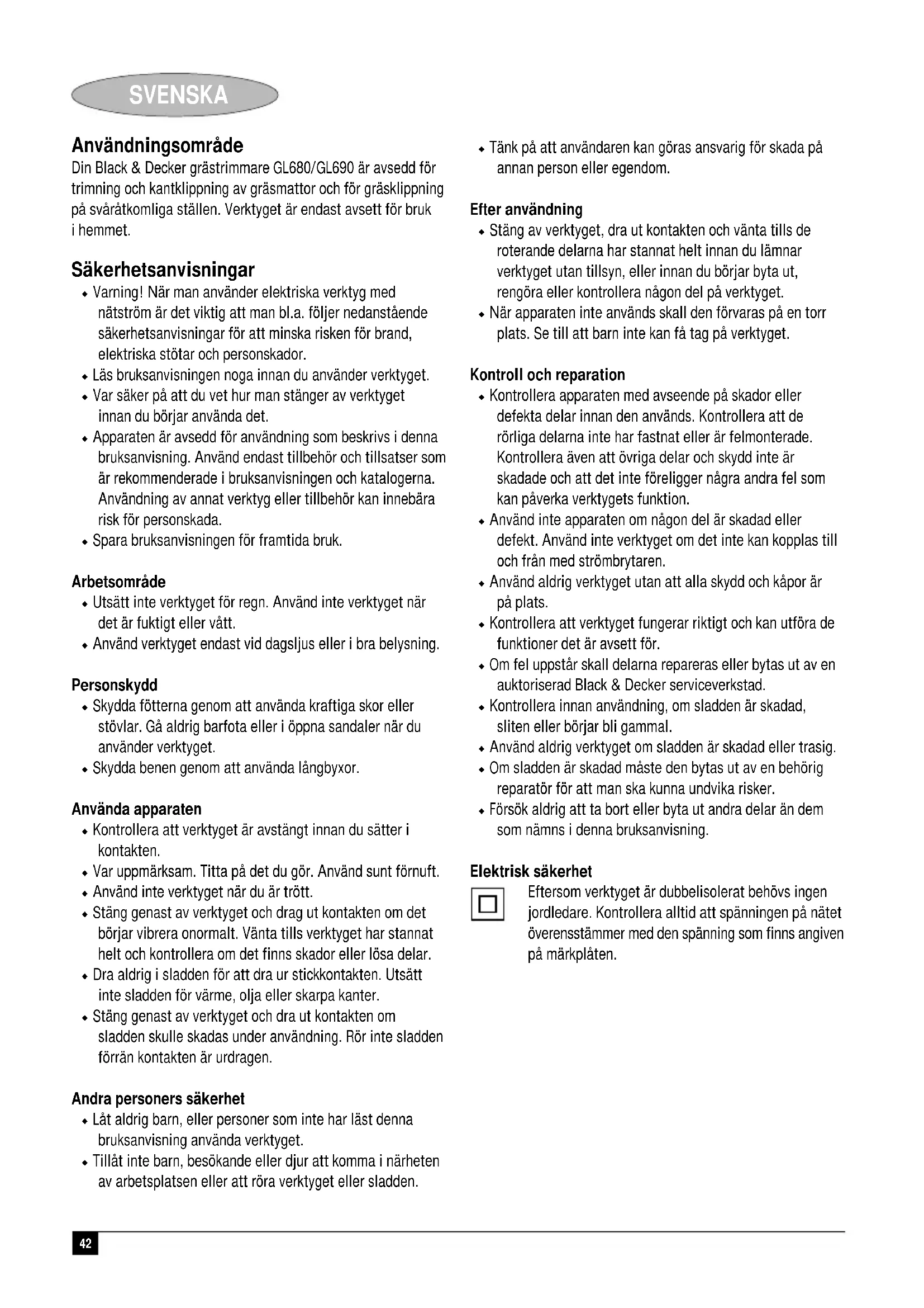 Kevin Hewitt Director de Engenharia do Consumo Spennymoor, County Durham DL16 6JG, Reino Unido 01-10-2002 Garantia A Black & Decker confia na qualidade de seus produtos e oferece um programa de garantia excelente. Esta declaração de garantia soma-se aos seus direitos legais e não os prejudica em nenhum aspecto. A garantia será válida nos territórios dos Estados Membros da União Europeia e na Área de Livre Comércio da Europa. Caso algum produto da Black & Decker apresente avarias devido a defeitos de material, mão-de-obra ou ausência de conformidade no prazo de 24 meses a partir da data de compra, a Black & Decker garantirá a substituição das peças defeituosas, a reparação dos produtos que foram submetidos a uso adequado e remoção ou substituição dos mesmos para assegurar o mínimo de inconvenientes ao cliente a menos que: ◆ O produto tenha sido utilizado para fins comerciais, profissionais ou aluguer; ◆ O produto tenha sido submetido a uso incorrecto ou descuido; ◆ O produto tenha sofrido danos causados por objectos estranhos, substâncias ou acidentes; ◆ Tenha um histórico de reparacões efectuadas por terceiros que não sejam os agentes autorizados ou profissionais de manutenção da Black & Decker. Para activar a garantia, será necessário enviar a prova de compra ao revendedor ou agente de reparação autorizado. Para verificar a localização do agente de reparação mais próximo de si contacte o escritório local da Black & Decker no endereço indicado neste manual. Se preferir, consulte a lista de agentes autorizados da Black & Decker e os dados completos de nossos serviços de atendimento pós-venda na Internet no endereço: www.2helpU.com.42 SVENSKA Användningsområde Din Black & Decker grästrimmare GL680/GL690 är avsedd för trimning och kantklippning av gräsmattor och för gräsklippning på svåråtkomliga ställen. Verktyget är endast avsett för bruk i hemmet. Säkerhetsanvisningar ◆ Varning! När man använder elektriska verktyg med nätström är det viktig att man bl.a. följer nedanstående säkerhetsanvisningar för att minska risken för brand, elektriska stötar och personskador. ◆ Läs bruksanvisningen noga innan du använder verktyget. ◆ Var säker på att du vet hur man stänger av verktyget innan du börjar använda det. ◆ Apparaten är avsedd för användning som beskrivs i denna bruksanvisning. Använd endast tillbehör och tillsatser som är rekommenderade i bruksanvisningen och katalogerna. Användning av annat verktyg eller tillbehör kan innebära risk för personskada. ◆ Spara bruksanvisningen för framtida bruk. Arbetsområde ◆ Utsätt inte verktyget för regn. Använd inte verktyget när det är fuktigt eller vått. ◆ Använd verktyget endast vid dagsljus eller i bra belysning. Personskydd ◆ Skydda fötterna genom att använda kraftiga skor eller stövlar. Gå aldrig barfota eller i öppna sandaler när du använder verktyget. ◆ Skydda benen genom att använda långbyxor. Använda apparaten ◆ Kontrollera att verktyget är avstängt innan du sätter i kontakten. ◆ Var uppmärksam. Titta på det du gör. Använd sunt förnuft. ◆ Använd inte verktyget när du är trött. ◆ Stäng genast av verktyget och drag ut kontakten om det börjar vibrera onormalt. Vänta tills verktyget har stannat helt och kontrollera om det finns skador eller lösa delar. ◆ Dra aldrig i sladden för att dra ur stickkontakten. Utsätt inte sladden för värme, olja eller skarpa kanter. ◆ Stäng genast av verktyget och dra ut kontakten om sladden skulle skadas under användning. Rör inte sladden förrän kontakten är urdragen. Andra personers säkerhet ◆ Låt aldrig barn, eller personer som inte har läst denna bruksanvisning använda verktyget. ◆ Tillåt inte barn, besökande eller djur att komma i närheten av arbetsplatsen eller att röra verktyget eller sladden. ◆ Tänk på att användaren kan göras ansvarig för skada på annan person eller egendom. Efter användning ◆ Stäng av verktyget, dra ut kontakten och vänta tills de roterande delarna har stannat helt innan du lämnar verktyget utan tillsyn, eller innan du börjar byta ut, rengöra eller kontrollera någon del på verktyget. ◆ När apparaten inte används skall den förvaras på en torr plats. Se till att barn inte kan få tag på verktyget. Kontroll och reparation ◆ Kontrollera apparaten med avseende på skador eller defekta delar innan den används. Kontrollera att de rörliga delarna inte har fastnat eller är felmonterade. Kontrollera även att övriga delar och skydd inte är skadade och att det inte föreligger några andra fel som kan påverka verktygets funktion. ◆ Använd inte apparaten om någon del är skadad eller defekt. Använd inte verktyget om det inte kan kopplas till och från med strömbrytaren. ◆ Använd aldrig verktyget utan att alla skydd och kåpor är på plats. ◆ Kontrollera att verktyget fungerar riktigt och kan utföra de funktioner det är avsett för. ◆ Om fel uppstår skall delarna repareras eller bytas ut av en auktoriserad Black & Decker serviceverkstad. ◆ Kontrollera innan användning, om sladden är skadad, sliten eller börjar bli gammal. ◆ Använd aldrig verktyget om sladden är skadad eller trasig. ◆ Om sladden är skadad måste den bytas ut av en behörig reparatör för att man ska kunna undvika risker. ◆ Försök aldrig att ta bort eller byta ut andra delar än dem som nämns i denna bruksanvisning. Elektrisk säkerhet Eftersom verktyget är dubbelisolerat behövs ingen jordledare. Kontrollera alltid att spänningen på nätet överensstämmer med den spänning som finns angiven på märkplåten.43 SVENSKA Ytterligare säkerhetsinstruktioner för grästrimmare Följande varningssymboler återfinns på verktyget: Läs bruksanvisningen innan du användar verktyget. Använd skyddsglasögon under arbetet med maskinen. 360˚