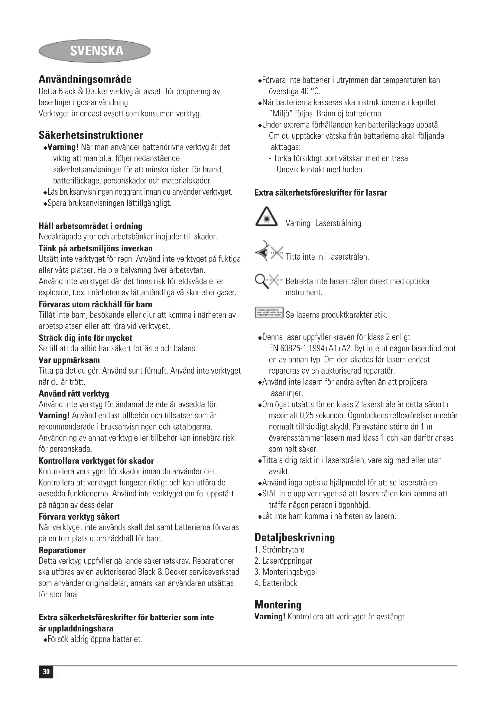 Kevin Hewitt Engenheiro Responsável Spennymoor, County Durham DL16 6JG, United Kingdom 1-12-2004 Garantia A Black & Decker confia na qualidade de seus produtos e oferece um programa de garantia excelente. Esta declaração de garantia soma-se aos seus direitos legais e não os prejudica em nenhum aspecto. A garantia será válida nos territórios dos Estados Membros da União Europeia e na Área de Livre Comércio da Europa. Caso algum produto da Black & Decker apresente avarias devido a defeitos de material, mão-de-obra ou ausência de conformidade no prazo de 24 meses a partir da data de compra, a Black & Decker garantirá a substituição das peças defeituosas, a reparação dos produtos que foram submetidos a uso adequado e remoção ou substituição dos mesmos para assegurar o mínimo de inconvenientes ao cliente a menos que: ◆ O produto tenha sido utilizado para fins comerciais, profissionais ou aluguer; ◆ O produto tenha sido submetido a uso incorrecto ou descuido; ◆ O produto tenha sofrido danos causados por objectos estranhos, substâncias ou acidentes; ◆ Tenha um histórico de reparacões efectuadas por terceiros que não sejam os agentes autorizados ou profissionais de manutenção da Black & Decker.29 PORTUGUÊS Para activar a garantia, será necessário enviar a prova de compra ao revendedor ou agente de reparação autorizado. Para verificar a localização do agente de reparação mais próximo de si contacte o escritório local da Black & Decker no endereço indicado neste manual. Se preferir, consulte a lista de agentes autorizados da Black & Decker e os dados completos de nossos serviços de atendimento pós-venda na Internet no endereço: www.2helpU.com Visite o nosso website www.blackanddecker.com para registar o seu novo produto Black & Decker e para se manter actualizado sobre novos produtos e ofertas especiais. Estão disponíveis mais informações sobre a Black & Decker e sobre a nossa gama de produtos em www.blackanddecker.com30 SVENSKA Användningsområde Detta Black & Decker verktyg är avsett för projicering av laserlinjer i gds-användning. Verktyget är endast avsett som konsumentverktyg. Säkerhetsinstruktioner ◆ Varning! När man använder batteridrivna verktyg är det viktig att man bl.a. följer nedanstående säkerhetsanvisningar för att minska risken för brand, batteriläckage, personskador och materialskador. ◆ Läs bruksanvisningen noggrant innan du använder verktyget. ◆ Spara bruksanvisningen lättillgängligt. Håll arbetsområdet i ordning Nedskräpade ytor och arbetsbänkar inbjuder till skador. Tänk på arbetsmiljöns inverkan Utsätt inte verktyget för regn. Använd inte verktyget på fuktiga eller våta platser. Ha bra belysning över arbetsytan. Använd inte verktyget där det finns risk för eldsvåda eller explosion, t.ex. i närheten av lättantändliga vätskor eller gaser. Förvaras utom räckhåll för barn Tillåt inte barn, besökande eller djur att komma i närheten av arbetsplatsen eller att röra vid verktyget. Sträck dig inte för mycket Se till att du alltid har säkert fotfäste och balans. Var uppmärksam Titta på det du gör. Använd sunt förnuft. Använd inte verktyget när du är trött. Använd rätt verktyg Använd inte verktyg för ändamål de inte är avsedda för. Varning! Använd endast tillbehör och tillsatser som är rekommenderade i bruksanvisningen och katalogerna. Användning av annat verktyg eller tillbehör kan innebära risk för personskada. Kontrollera verktyget för skador Kontrollera verktyget för skador innan du använder det. Kontrollera att verktyget fungerar riktigt och kan utföra de avsedda funktionerna. Använd inte verktyget om fel uppstått på någon av dess delar. Förvara verktyg säkert När verktyget inte används skall det samt batterierna förvaras på en torr plats utom räckhåll för barn. Reparationer Detta verktyg uppfyller gällande säkerhetskrav. Reparationer ska utföras av en auktoriserad Black & Decker serviceverkstad som använder originaldelar, annars kan användaren utsättas för stor fara. Extra säkerhetsföreskrifter för batterier som inte är uppladdningsbara ◆ Försök aldrig öppna batteriet. ◆ Förvara inte batterier i utrymmen där temperaturen kan överstiga 40 °C. ◆ När batterierna kasseras ska instruktionerna i kapitlet “Miljö” följas. Bränn ej batterierna. ◆ Under extrema förhållanden kan batteriläckage uppstå. Om du upptäcker vätska från batterierna skall följande iakttagas: - Torka försiktigt bort vätskan med en trasa. Undvik kontakt med huden. Extra säkerhetsföreskrifter för lasrar Varning! Laserstrålning. Titta inte in i laserstrålen. Betrakta inte laserstrålen direkt med optiska instrument. Se laserns produktkarakteristik. ◆ Denna laser uppfyller kraven för klass 2 enligt EN 60825-1:1994+A1+A2. Byt inte ut någon laserdiod mot en av annan typ. Om den skadas får lasern endast repareras av en auktoriserad reparatör. ◆ Använd inte lasern för andra syften än att projicera laserlinjer. ◆ Om ögat utsätts för en klass 2 laserstråle är detta säkert i maximalt 0,25 sekunder. Ögonlockens reflexrörelser innebär normalt tillräckligt skydd. På avstånd större än 1 m överensstämmer lasern med klass 1 och kan därför anses som helt säker. ◆ Titta aldrig rakt in i laserstrålen, vare sig med eller utan avsikt. ◆ Använd inga optiska hjälpmedel för att se laserstrålen. ◆ Ställ inte upp verktyget så att laserstrålen kan komma att träffa någon person i ögonhöjd. ◆ Låt inte barn komma i närheten av lasern. Detaljbeskrivning