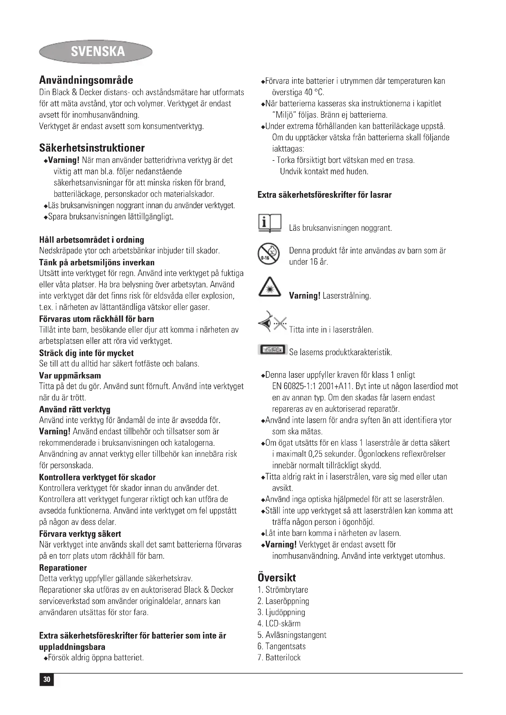 Kevin Hewitt Engenheiro Responsável Spennymoor, County Durham DL16 6JG, United Kingdom 1-11-2004 Garantia A Black & Decker confia na qualidade de seus produtos e oferece um programa de garantia excelente. Esta declaração de garantia soma-se aos seus direitos legais e não os prejudica em nenhum aspecto. A garantia será válida nos territórios dos Estados Membros da União Europeia e na Área de Livre Comércio da Europa. Caso algum produto da Black & Decker apresente avarias devido a defeitos de material, mão-de-obra ou ausência de conformidade no prazo de 24 meses a partir da data de compra, a Black & Decker garantirá a substituição das peças defeituosas, a reparação dos produtos que foram submetidos a uso adequado e remoção ou substituição dos mesmos para assegurar o mínimo de inconvenientes ao cliente a menos que: ◆ O produto tenha sido utilizado para fins comerciais, profissionais ou aluguer; ◆ O produto tenha sido submetido a uso incorrecto ou descuido; ◆ O produto tenha sofrido danos causados por objectos estranhos, substâncias ou acidentes;29 PORTUGUÊS ◆ Tenha um histórico de reparacões efectuadas por terceiros que não sejam os agentes autorizados ou profissionais de manutenção da Black & Decker. Para activar a garantia, será necessário enviar a prova de compra ao revendedor ou agente de reparação autorizado. Para verificar a localização do agente de reparação mais próximo de si contacte o escritório local da Black & Decker no endereço indicado neste manual. Se preferir, consulte a lista de agentes autorizados da Black & Decker e os dados completos de nossos serviços de atendimento pós-venda na Internet no endereço: www.2helpU.com Visite o nosso website www.blackanddecker.com para registar o seu novo produto Black & Decker e para se manter actualizado sobre novos produtos e ofertas especiais. Estão disponíveis mais informações sobre a Black & Decker e sobre a nossa gama de produtos em www.blackanddecker.com30 SVENSKA Användningsområde Din Black & Decker distans- och avståndsmätare har utformats för att mäta avstånd, ytor och volymer. Verktyget är endast avsett för inomhusanvändning. Verktyget är endast avsett som konsumentverktyg. Säkerhetsinstruktioner ◆ Varning! När man använder batteridrivna verktyg är det viktig att man bl.a. följer nedanstående säkerhetsanvisningar för att minska risken för brand, batteriläckage, personskador och materialskador. ◆ Läs bruksanvisningen noggrant innan du använder verktyget. ◆ Spara bruksanvisningen lättillgängligt. Håll arbetsområdet i ordning Nedskräpade ytor och arbetsbänkar inbjuder till skador. Tänk på arbetsmiljöns inverkan Utsätt inte verktyget för regn. Använd inte verktyget på fuktiga eller våta platser. Ha bra belysning över arbetsytan. Använd inte verktyget där det finns risk för eldsvåda eller explosion, t.ex. i närheten av lättantändliga vätskor eller gaser. Förvaras utom räckhåll för barn Tillåt inte barn, besökande eller djur att komma i närheten av arbetsplatsen eller att röra vid verktyget. Sträck dig inte för mycket Se till att du alltid har säkert fotfäste och balans. Var uppmärksam Titta på det du gör. Använd sunt förnuft. Använd inte verktyget när du är trött. Använd rätt verktyg Använd inte verktyg för ändamål de inte är avsedda för. Varning! Använd endast tillbehör och tillsatser som är rekommenderade i bruksanvisningen och katalogerna. Användning av annat verktyg eller tillbehör kan innebära risk för personskada. Kontrollera verktyget för skador Kontrollera verktyget för skador innan du använder det. Kontrollera att verktyget fungerar riktigt och kan utföra de avsedda funktionerna. Använd inte verktyget om fel uppstått på någon av dess delar. Förvara verktyg säkert När verktyget inte används skall det samt batterierna förvaras på en torr plats utom räckhåll för barn. Reparationer Detta verktyg uppfyller gällande säkerhetskrav. Reparationer ska utföras av en auktoriserad Black & Decker serviceverkstad som använder originaldelar, annars kan användaren utsättas för stor fara. Extra säkerhetsföreskrifter för batterier som inte är uppladdningsbara ◆ Försök aldrig öppna batteriet. ◆ Förvara inte batterier i utrymmen där temperaturen kan överstiga 40 °C. ◆ När batterierna kasseras ska instruktionerna i kapitlet “Miljö” följas. Bränn ej batterierna. ◆ Under extrema förhållanden kan batteriläckage uppstå. Om du upptäcker vätska från batterierna skall följande iakttagas: - Torka försiktigt bort vätskan med en trasa. Undvik kontakt med huden. Extra säkerhetsföreskrifter för lasrar Läs bruksanvisningen noggrant. Denna produkt får inte användas av barn som är under 16 år. Varning! Laserstrålning. Titta inte in i laserstrålen. Se laserns produktkarakteristik. ◆ Denna laser uppfyller kraven för klass 1 enligt EN 60825-1:1 2001+A11. Byt inte ut någon laserdiod mot en av annan typ. Om den skadas får lasern endast repareras av en auktoriserad reparatör. ◆ Använd inte lasern för andra syften än att identifiera ytor som ska mätas. ◆ Om ögat utsätts för en klass 1 laserstråle är detta säkert i maximalt 0,25 sekunder. Ögonlockens reflexrörelser innebär normalt tillräckligt skydd. ◆ Titta aldrig rakt in i laserstrålen, vare sig med eller utan avsikt. ◆ Använd inga optiska hjälpmedel för att se laserstrålen. ◆ Ställ inte upp verktyget så att laserstrålen kan komma att träffa någon person i ögonhöjd. ◆ Låt inte barn komma i närheten av lasern. ◆ Varning! Verktyget är endast avsett för inomhusanvändning. Använd inte verktyget utomhus. Översikt