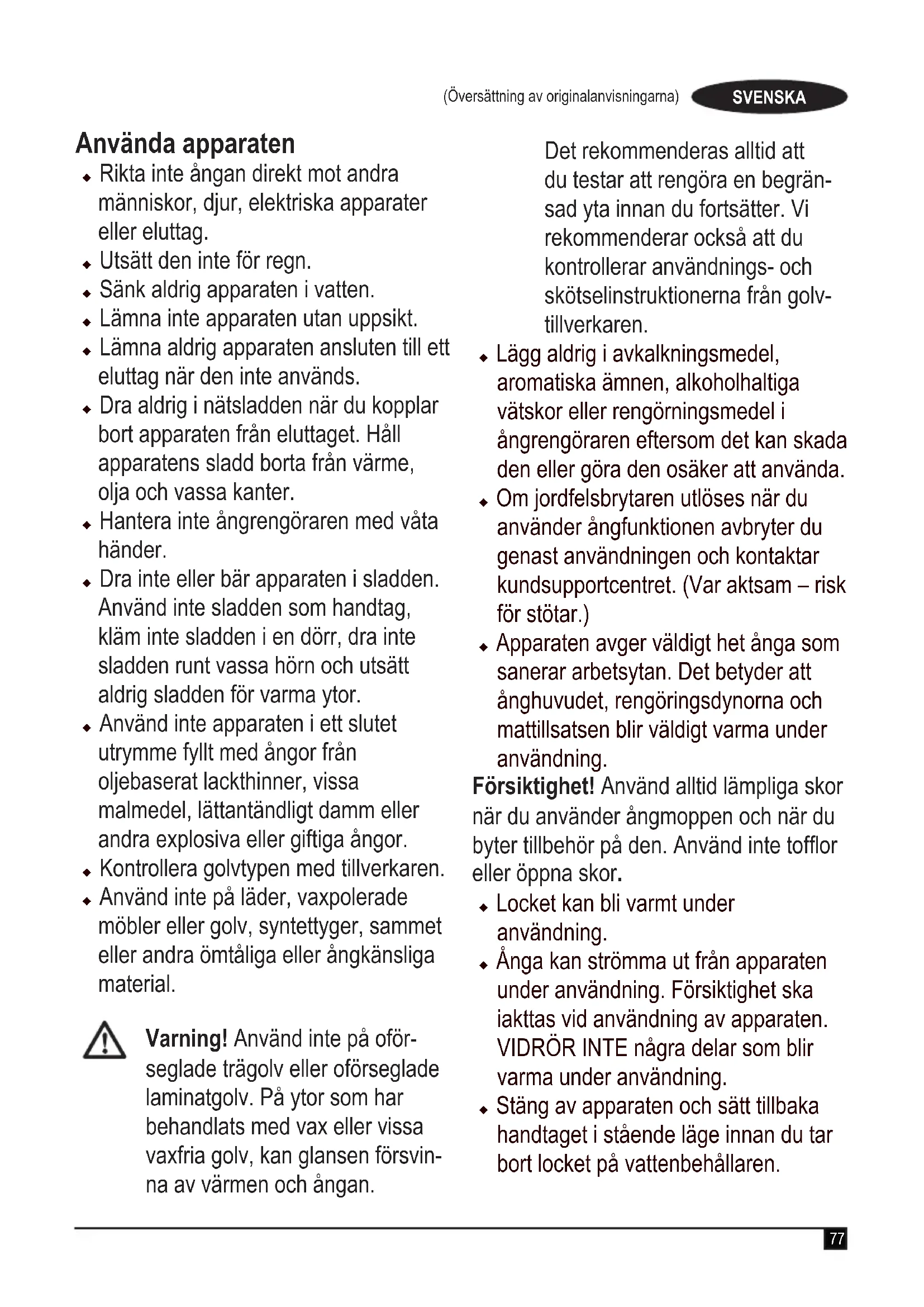 förlängningssladd som är upp till 30 m lång utan att produktens prestanda försämras. Innan du använder sladden, kontrollera att den inte är skadad, sliten eller nött. Byt ut förlängningssladden om den är skadadellerdefekt.Omduanvänder en sladdvinda, vira alltid av sladden fullständigt. Etiketter på apparaten Följande symboler tillsammans med datumkoden är synliga på apparaten. FÖRSIKTIGHET! Varm ånga Vatten droppar vid användning upp och ned Ånga tränger ut på alla sidor Lämna inte apparaten utan tillsyn tillsammans med unga barn80 (Översättning av originalanvisningarna) SVENSKA Endast handtvätt FÖRSIKTIGHET! Het yta Funktioner Denna apparat har några eller samtliga av följande funktioner.